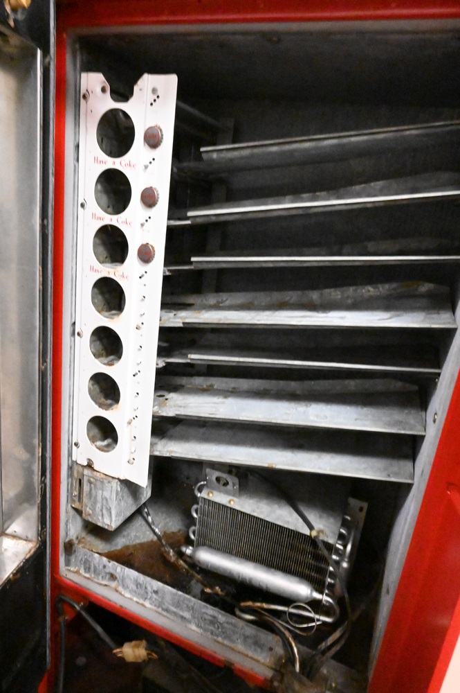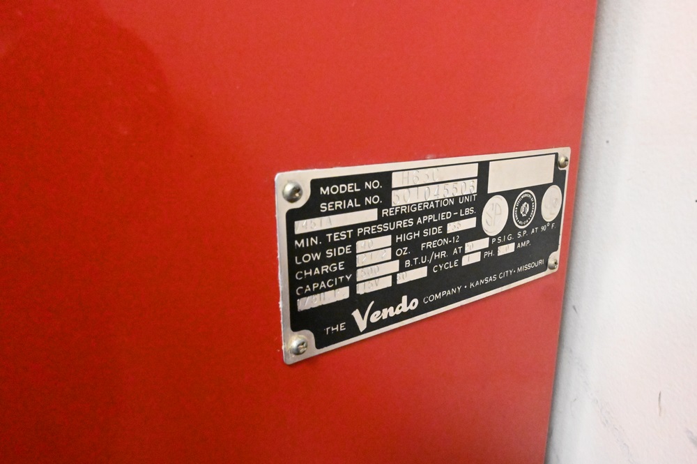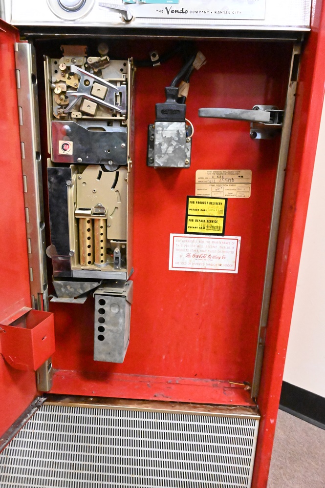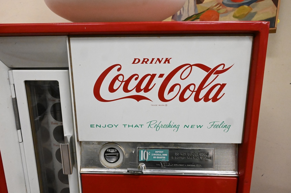 Lot 526: Vintage Coca Cola Ten Cent Machine by Vendo, original paint, model H630, height 53 inches, top 22″ x 27 1/2″.