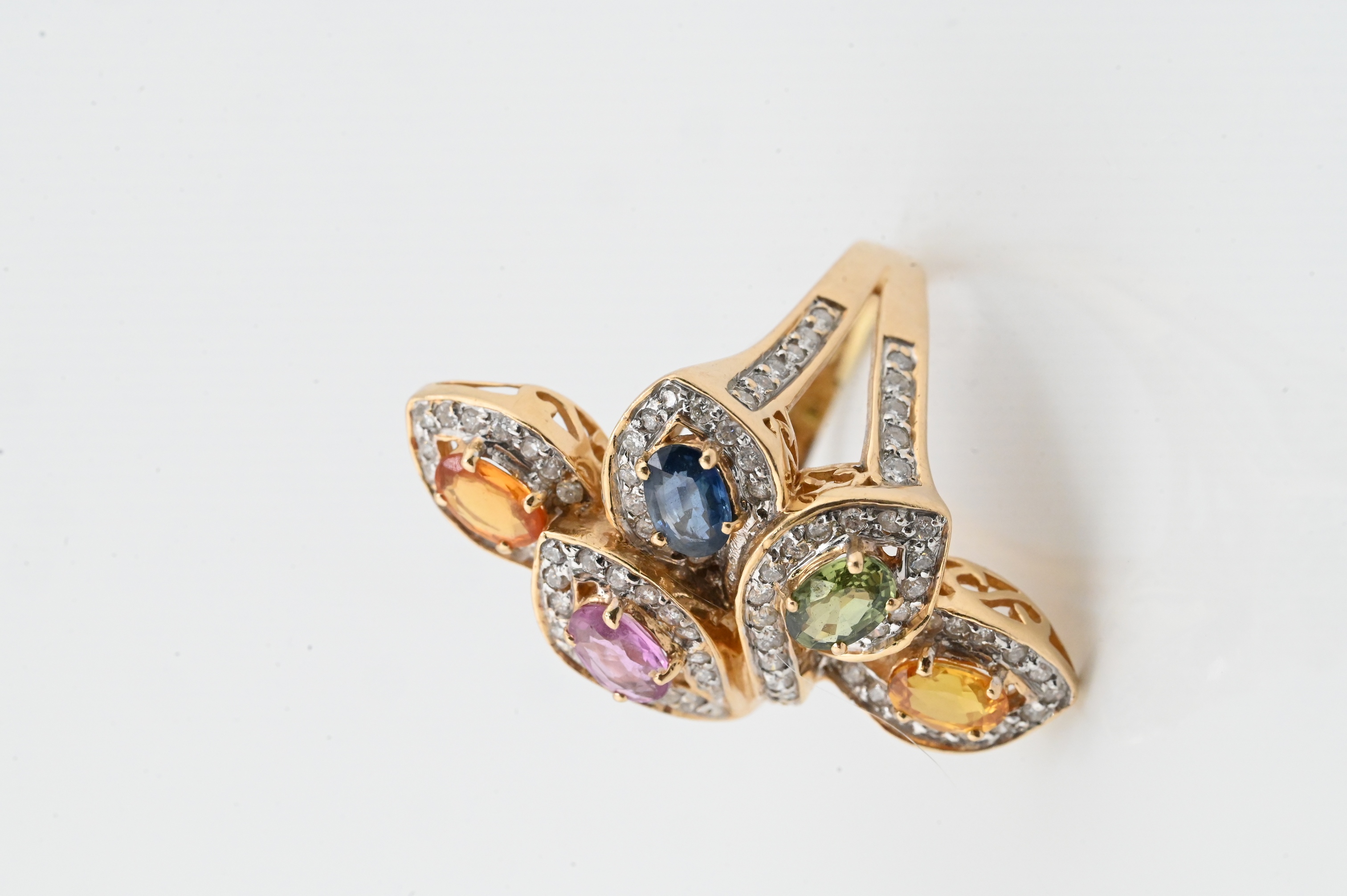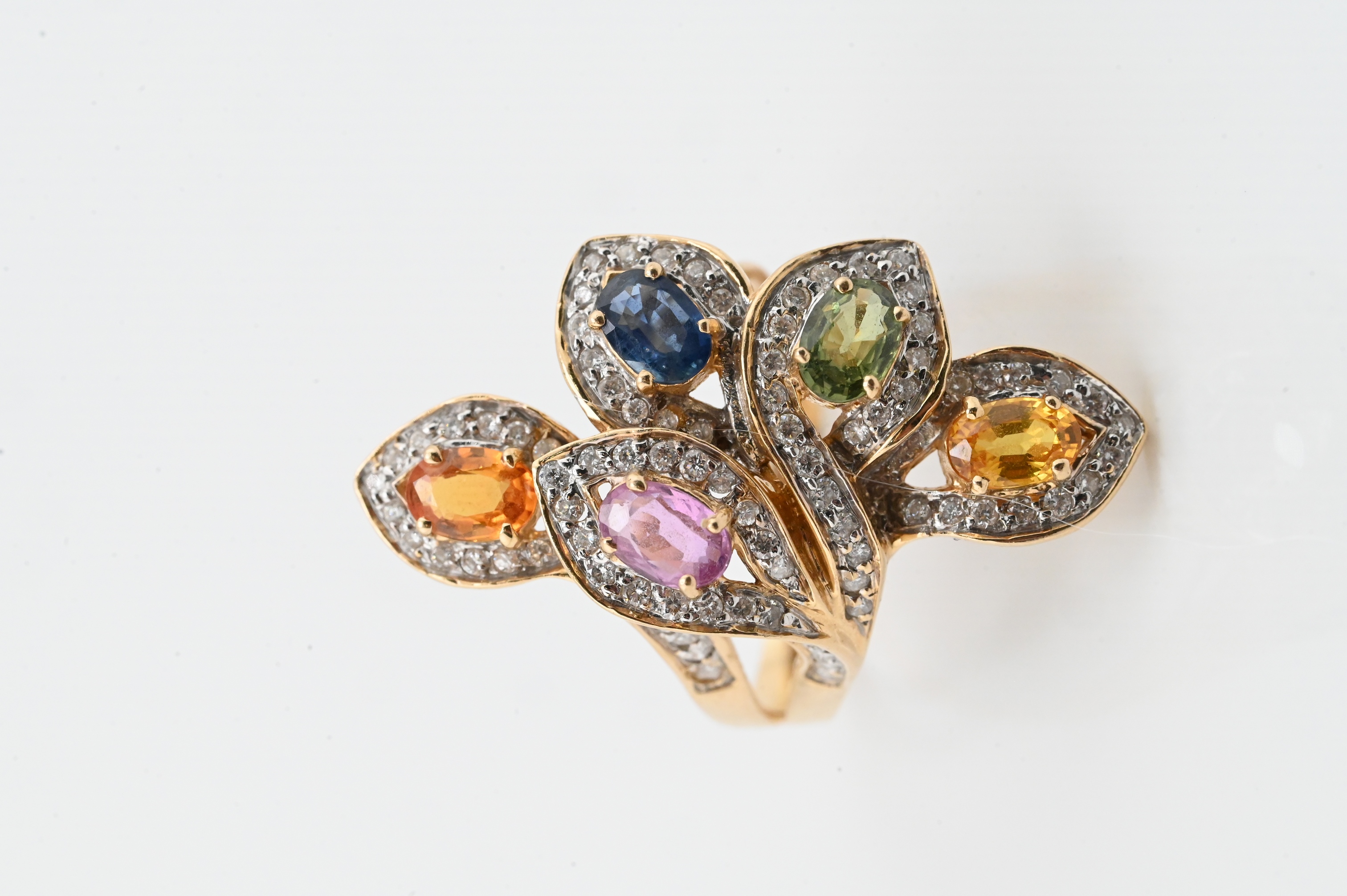 Featuring five bezel-set oval gemstones including blue sapphire, pink sapphire, green tourmaline, and two orange citrines each measuring approximately 4mm x 6mm, surrounded by pavé-set diamonds in an intertwined foliate-inspired mounting