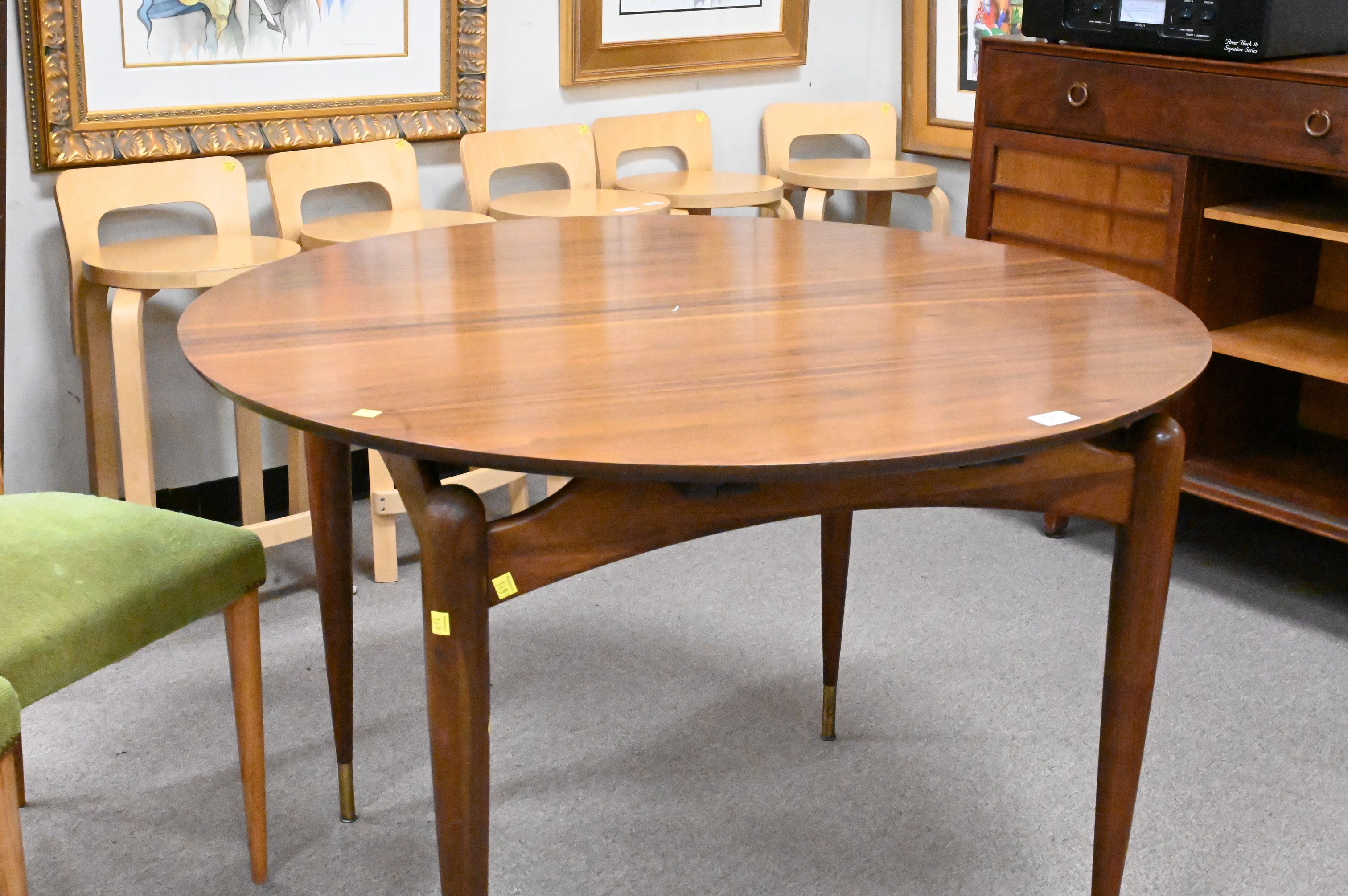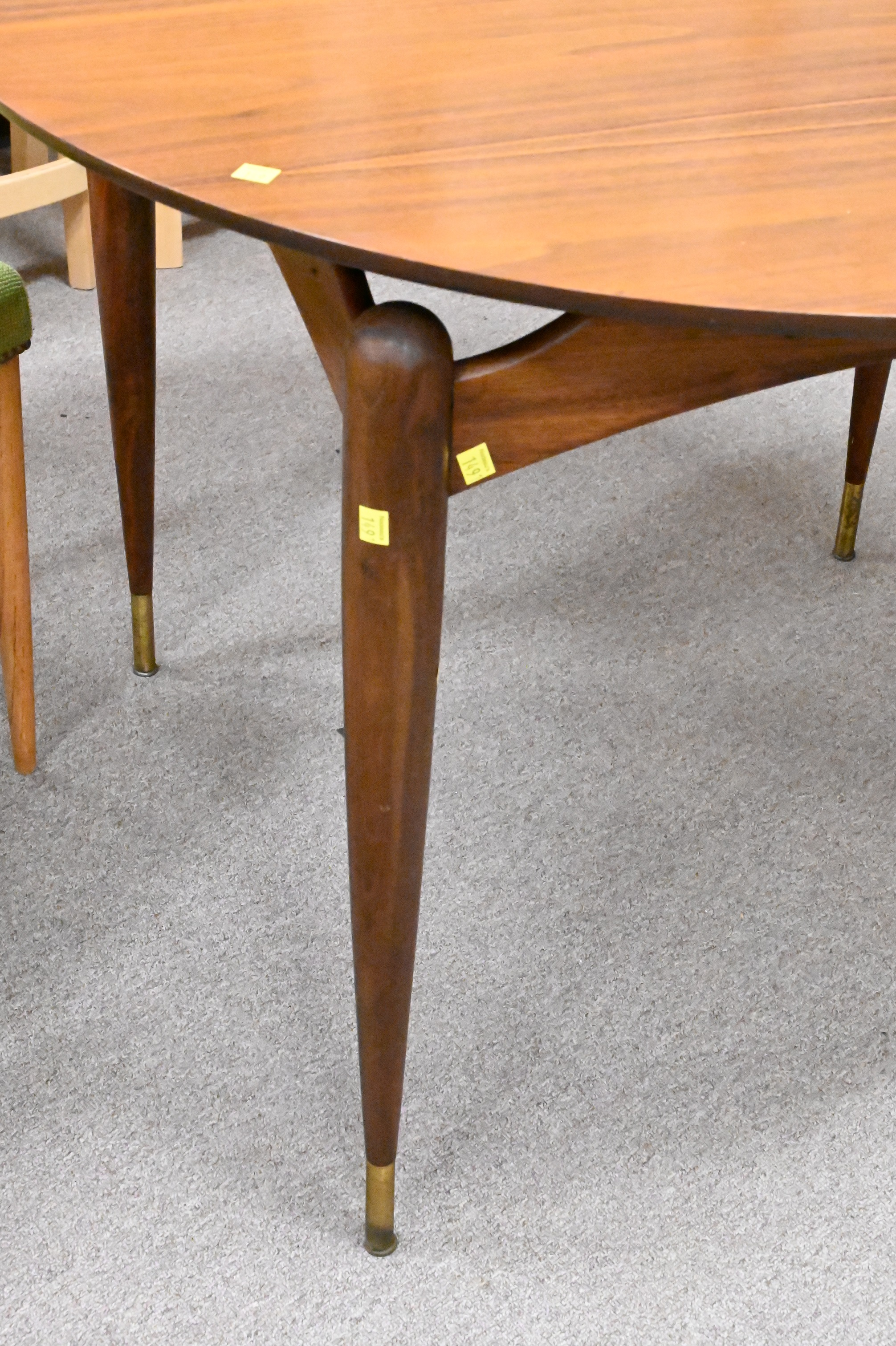 Danish Mid Century Modern Round Dining Table, having brass capped feet along with two 16 inch leaves, height 29 1/2 inches, diameter 41 1/2 inches, open 29 1/2″ x 74″.