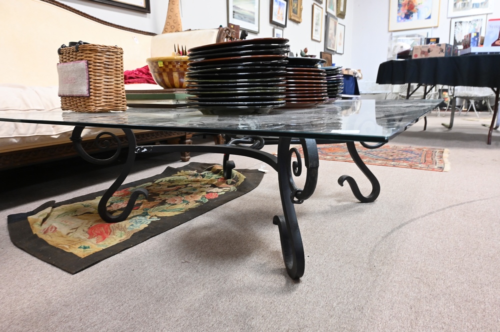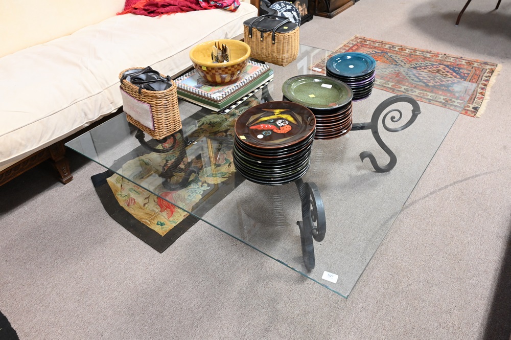 Lot 527: Four Piece Lot, to include a large square contemporary glass top coffee table, having iron base, height 17.25 inches, top 48″ x 54″;…