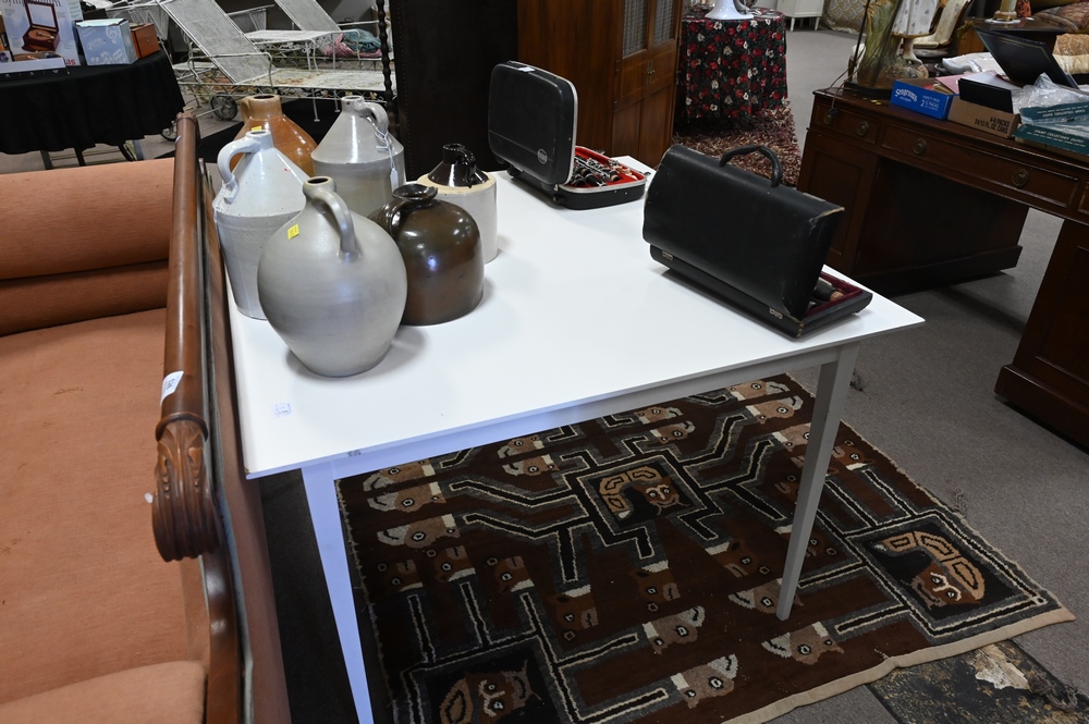 Four Piece Lot, to include a large square contemporary glass top coffee table, having iron base, height 17.25 inches, top 48″ x 54″; a white table; along with two prints.