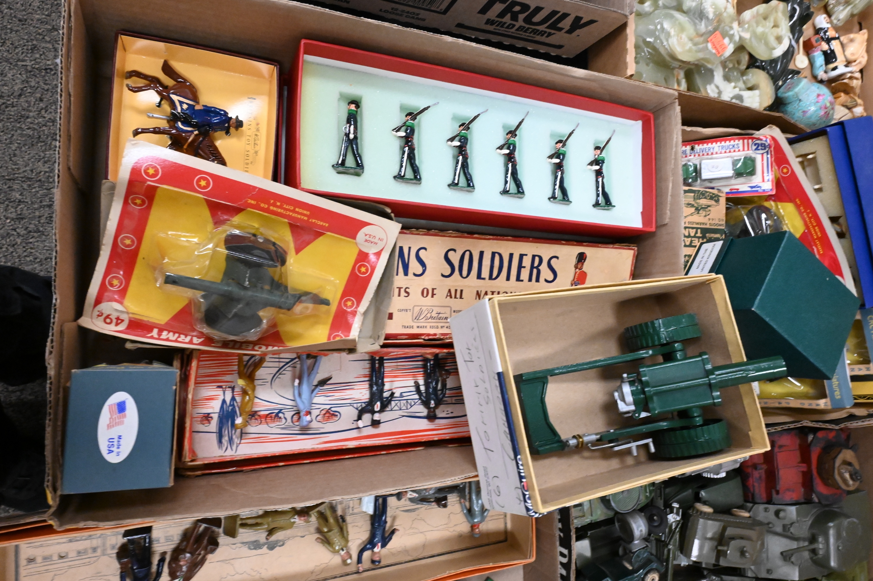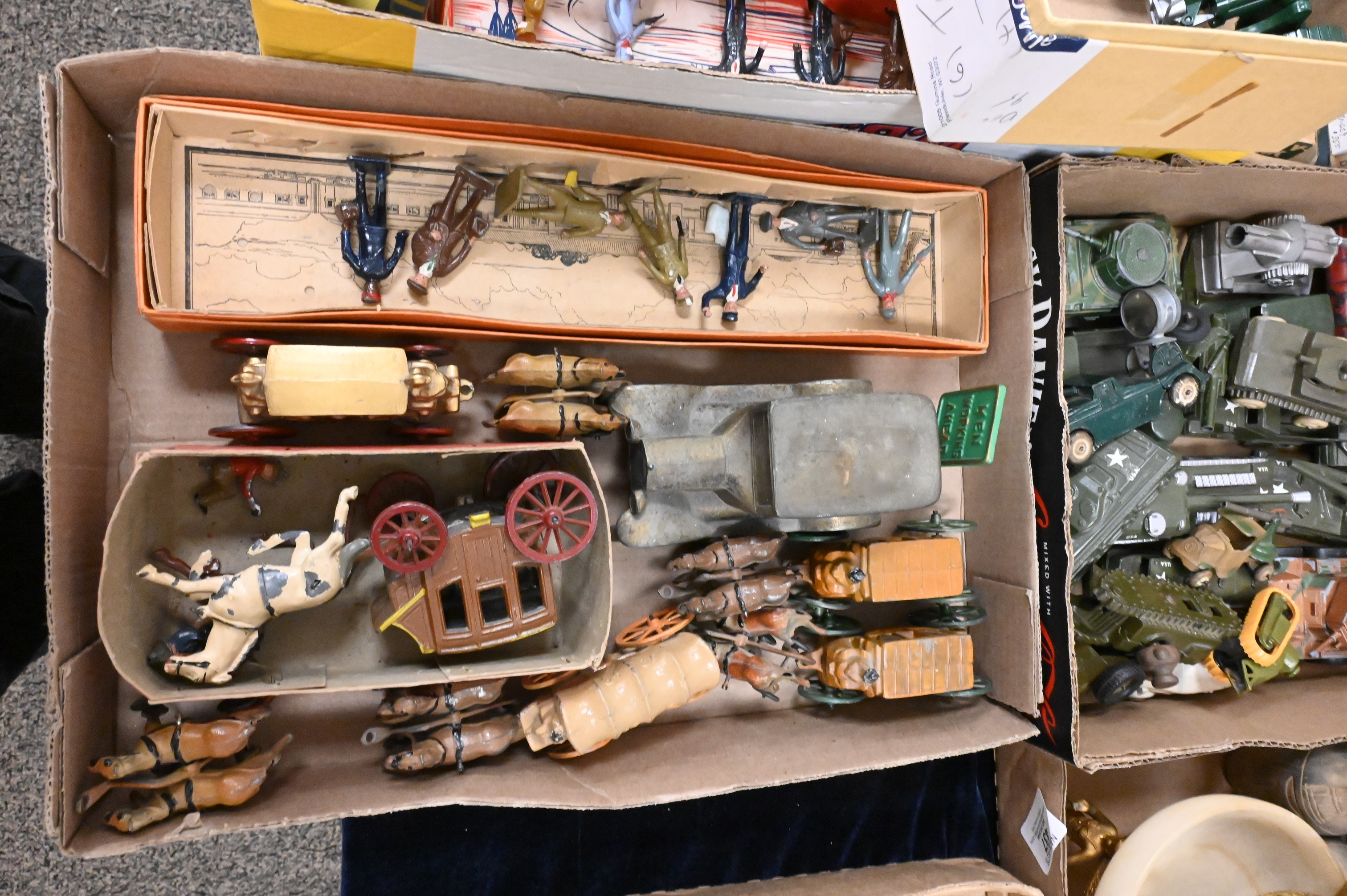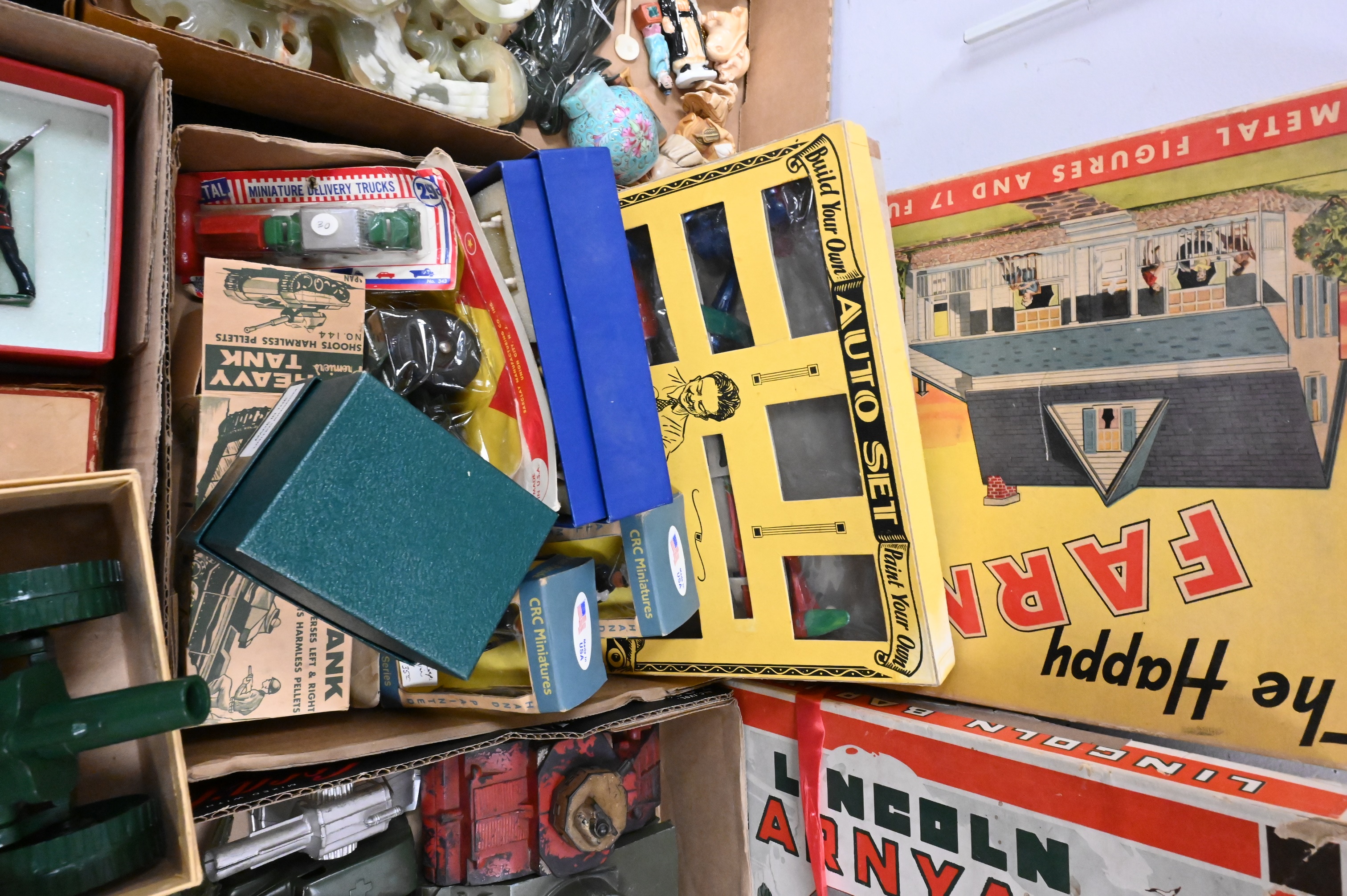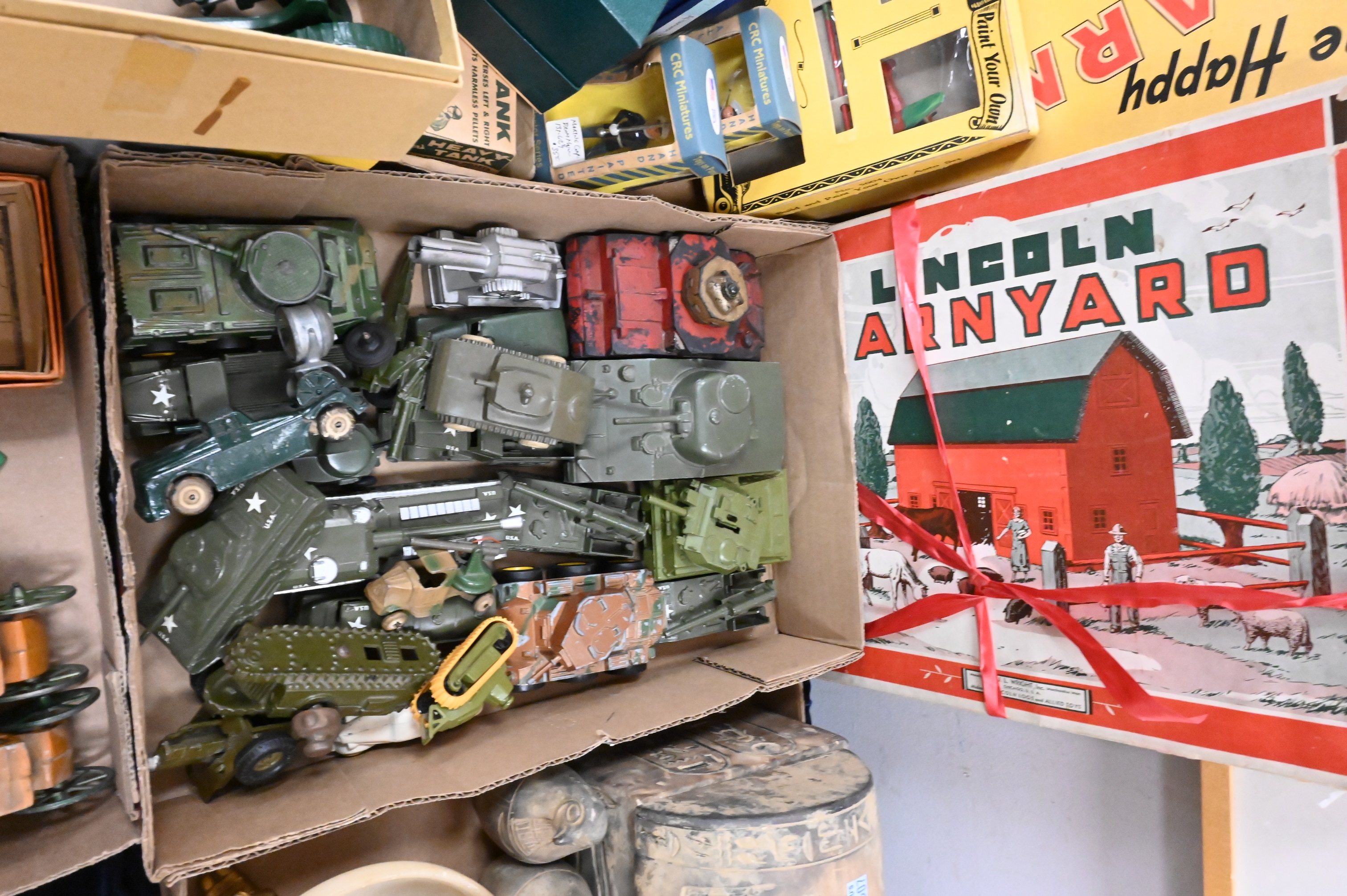 to include army tanks, “Build Your Own Auto Set”, “Lincoln Barnyard”, Britains toy soldiers, horse drawn wagons, etcetera, some in original boxes