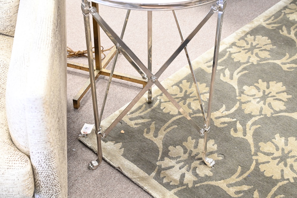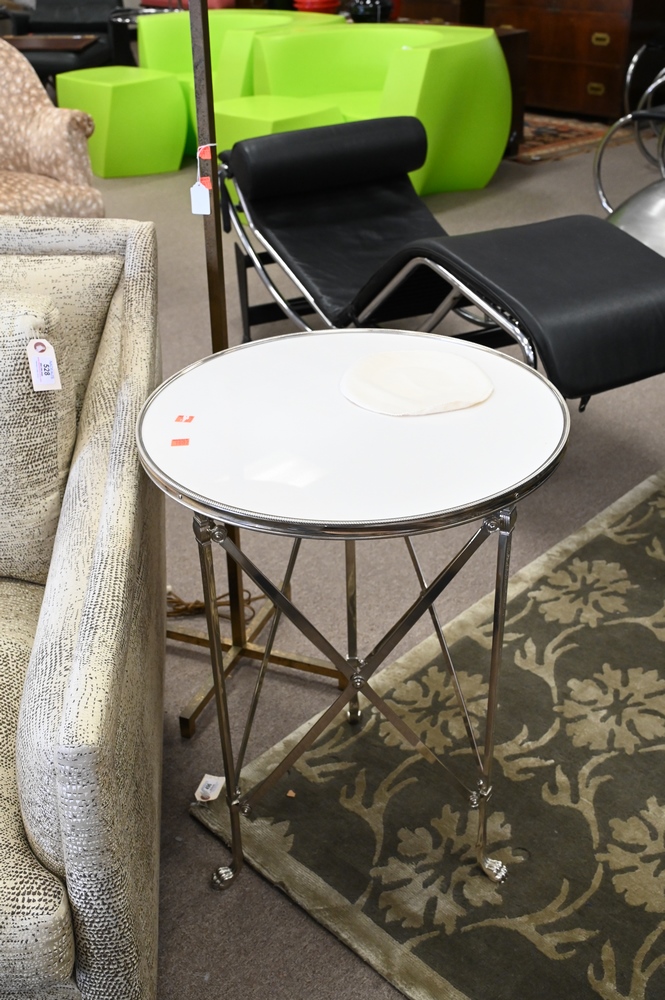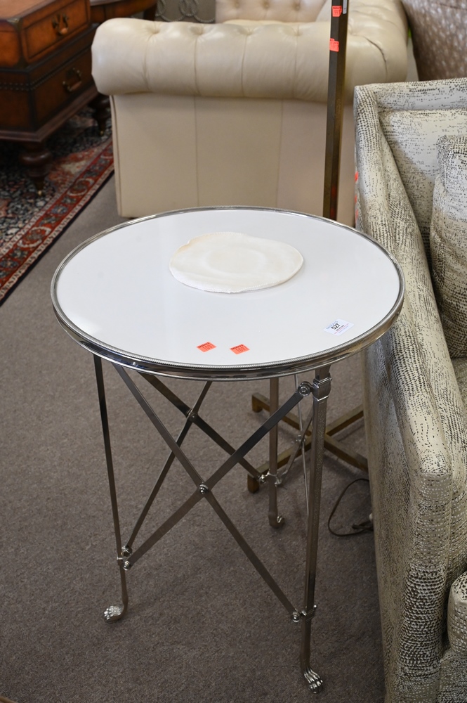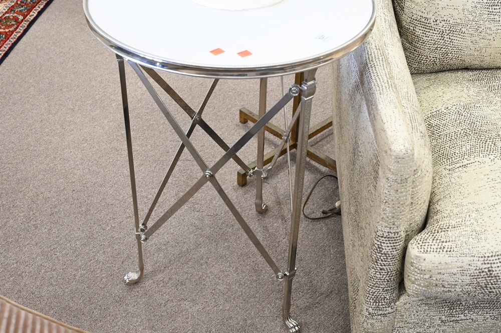 Lot 527: Pair of French Directoire Style Gueridon Style Side Tables, having inset marble top set on X metal bases, ending in paw feet, height 27 inches, top diameter 20 inches