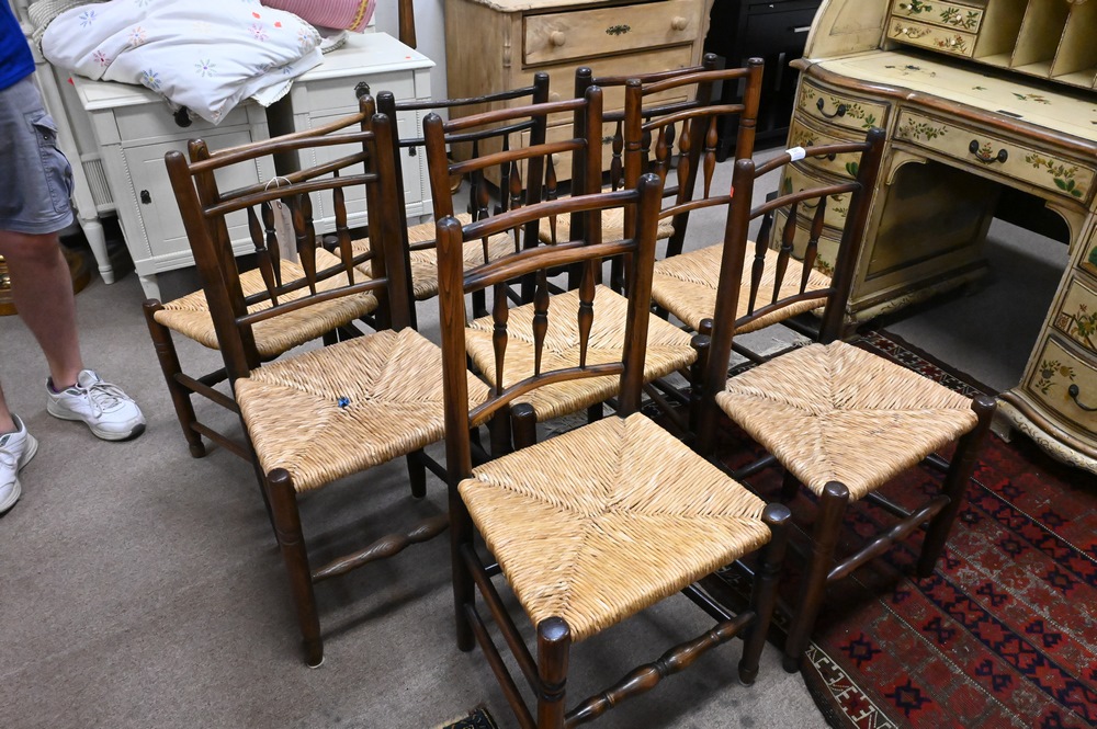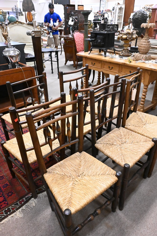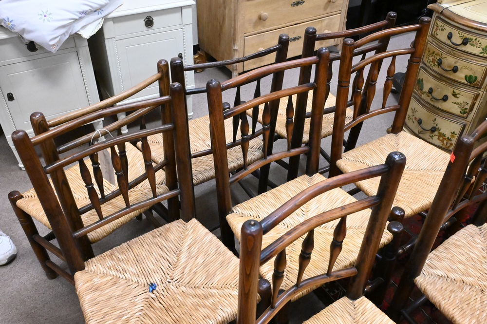 Set of Eight English Oak Spindle Back Chairs, seat height 16 1/2 inches, height 34 inches.
