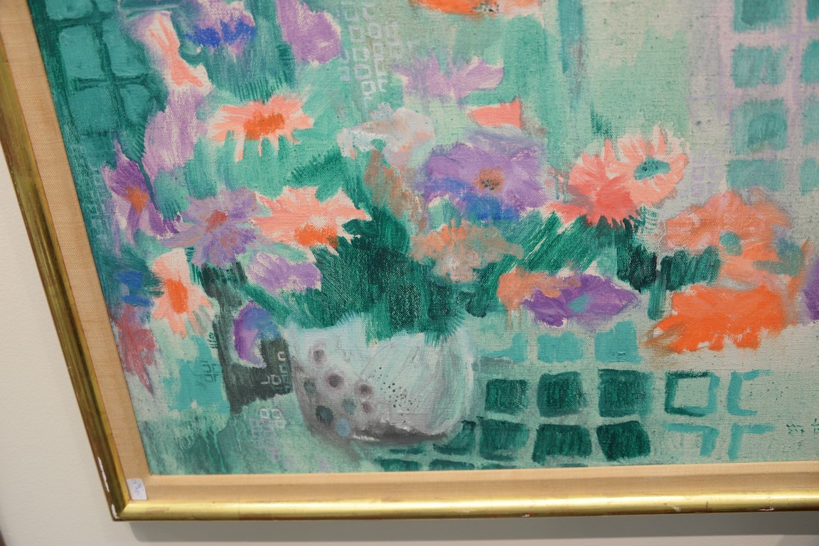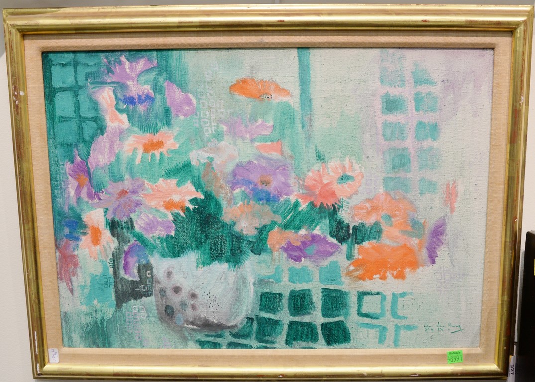Lot 527: Shlomo van der Berg oil on canvas Flowers in a Vase signed lower right and verso: van der Berg Kulicke Frames New York l…