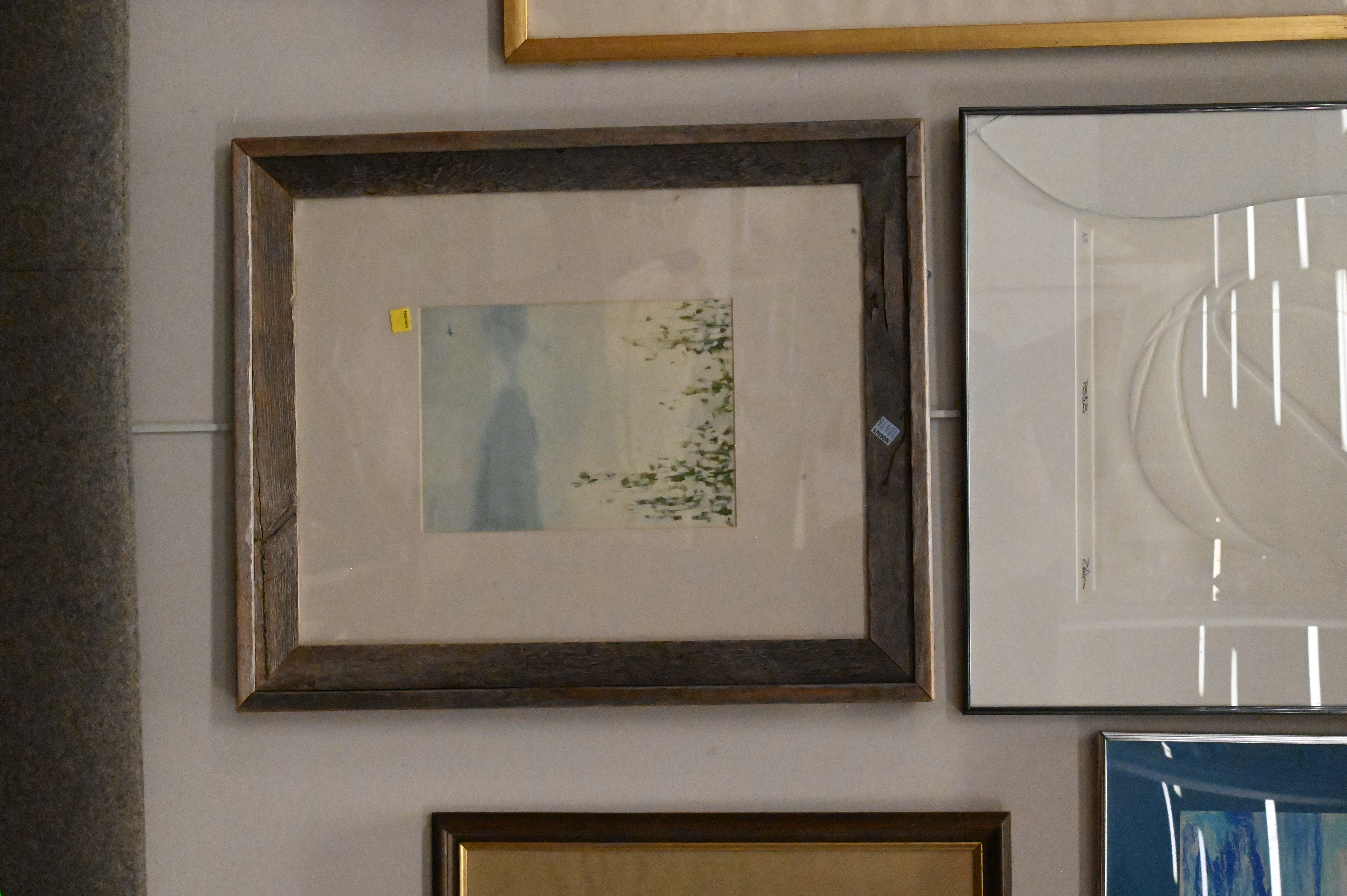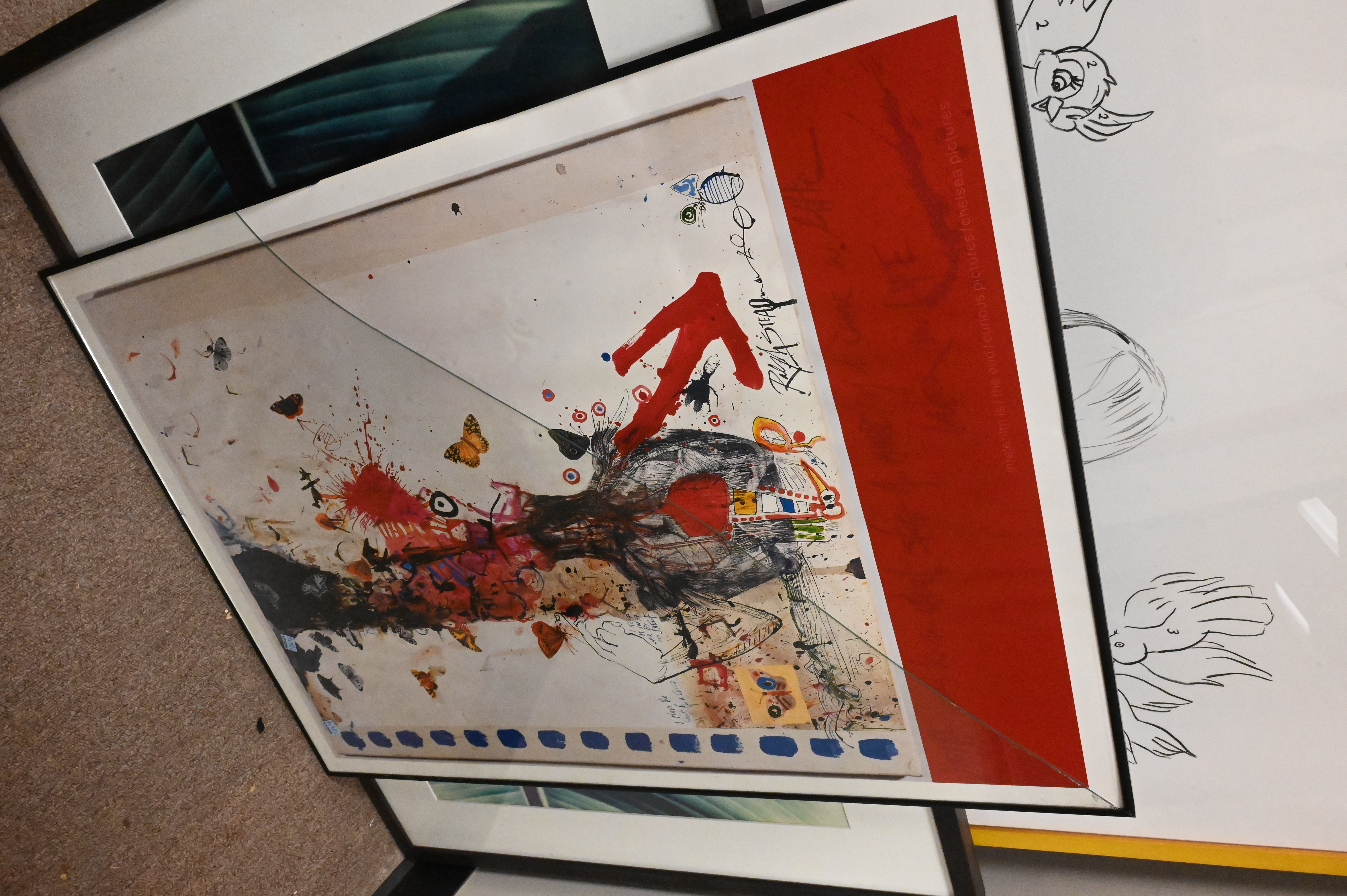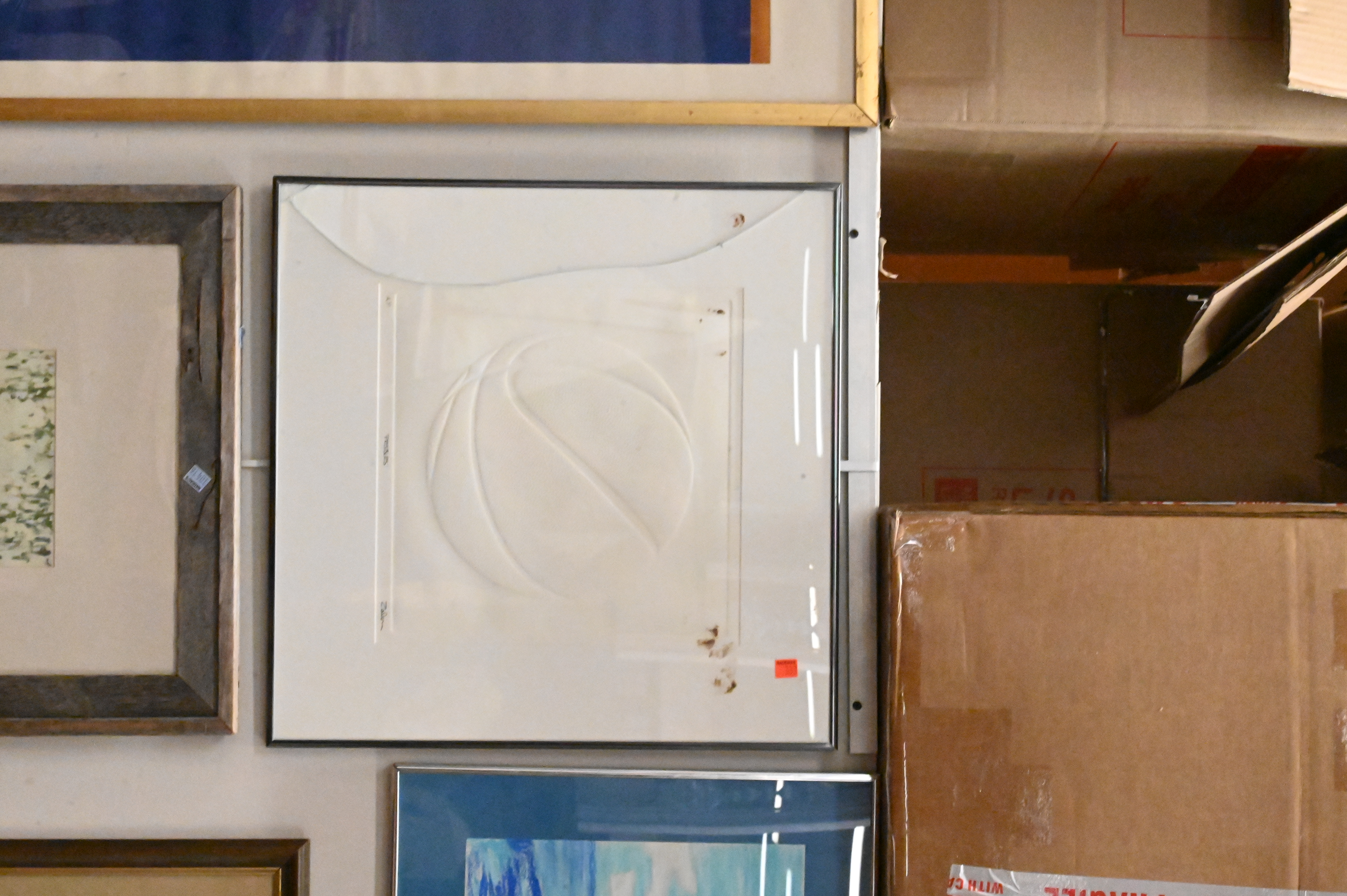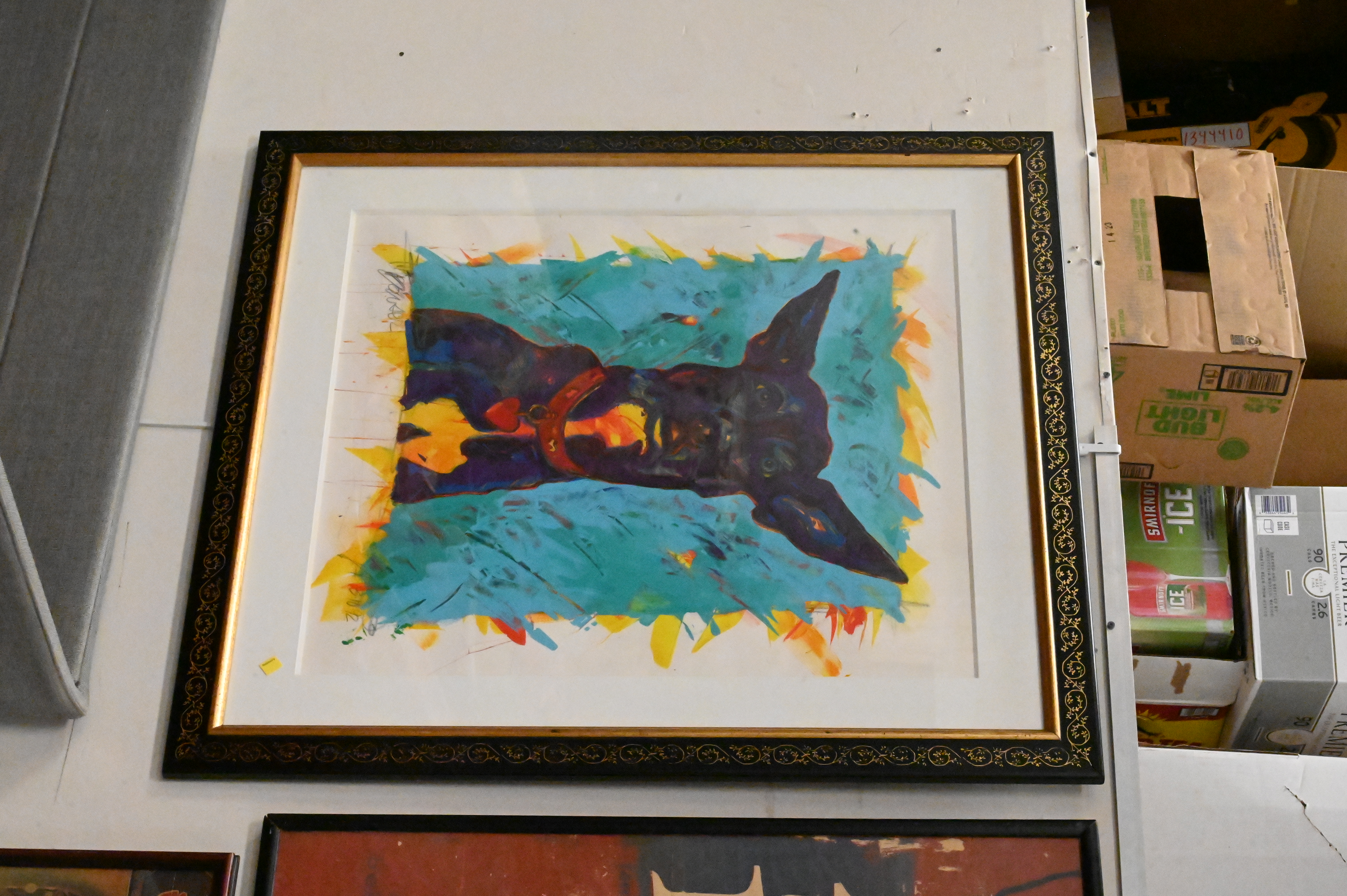 to include vintage cigarette poster, Tarla Kusu poster, Little Red Riding Hood or Snow White, print of a leaf, acrylic on paper of a dog, signed illegibly dated 1992, Joe Eula (American 1925-2004) print signed lower right “Eula”, “Pebbles” (basketball) embossed lithograph artist proof signed lower right, “Caligo Uranus” butterfly print watercolor, two pieces signed illegibly lower right and dated 2002, watercolor of a beach scene signed lower right, etching of an arch EA 1972 signed illegibly lower right, two oil pastels signed Arredondo, etcetera