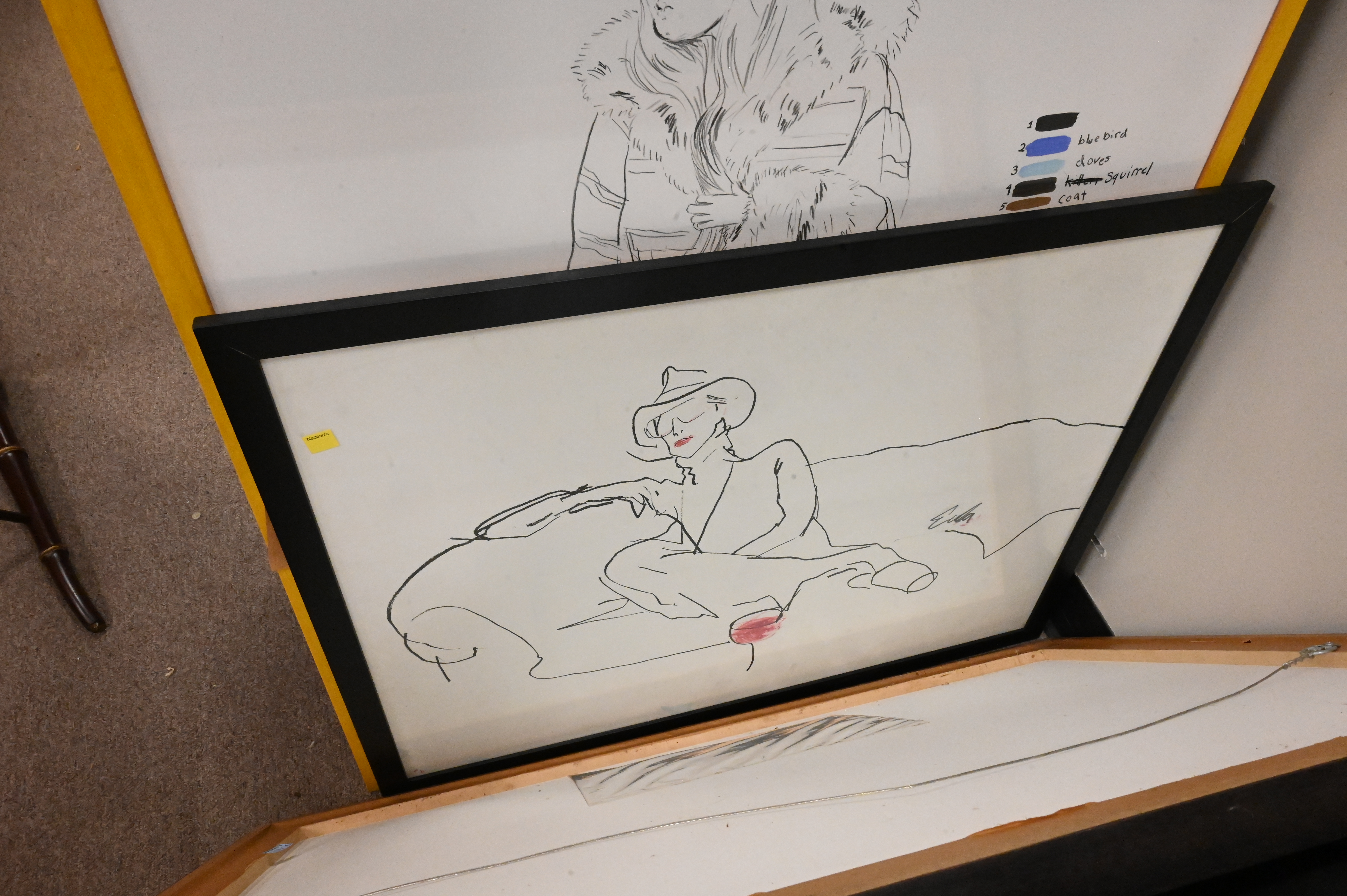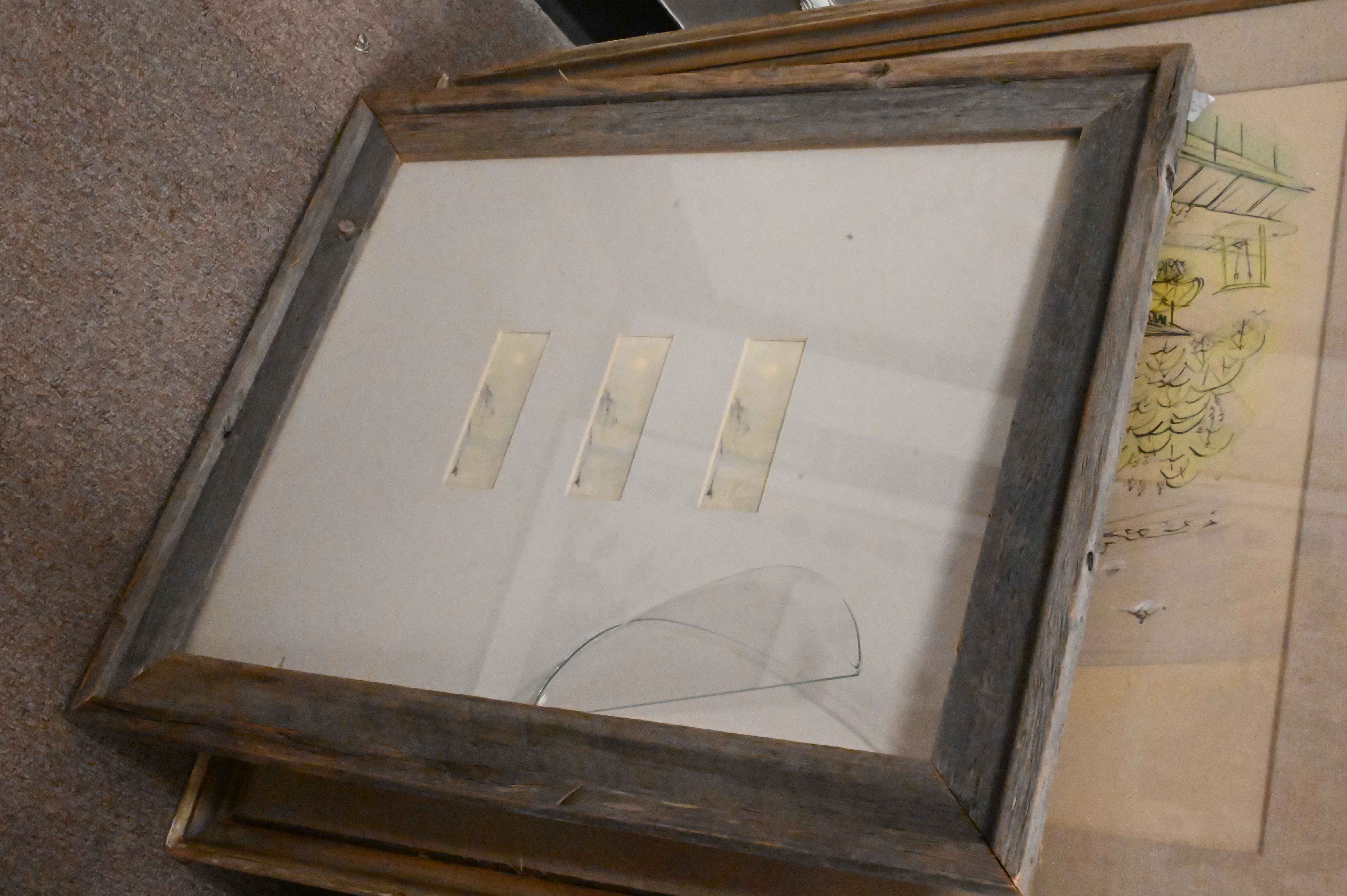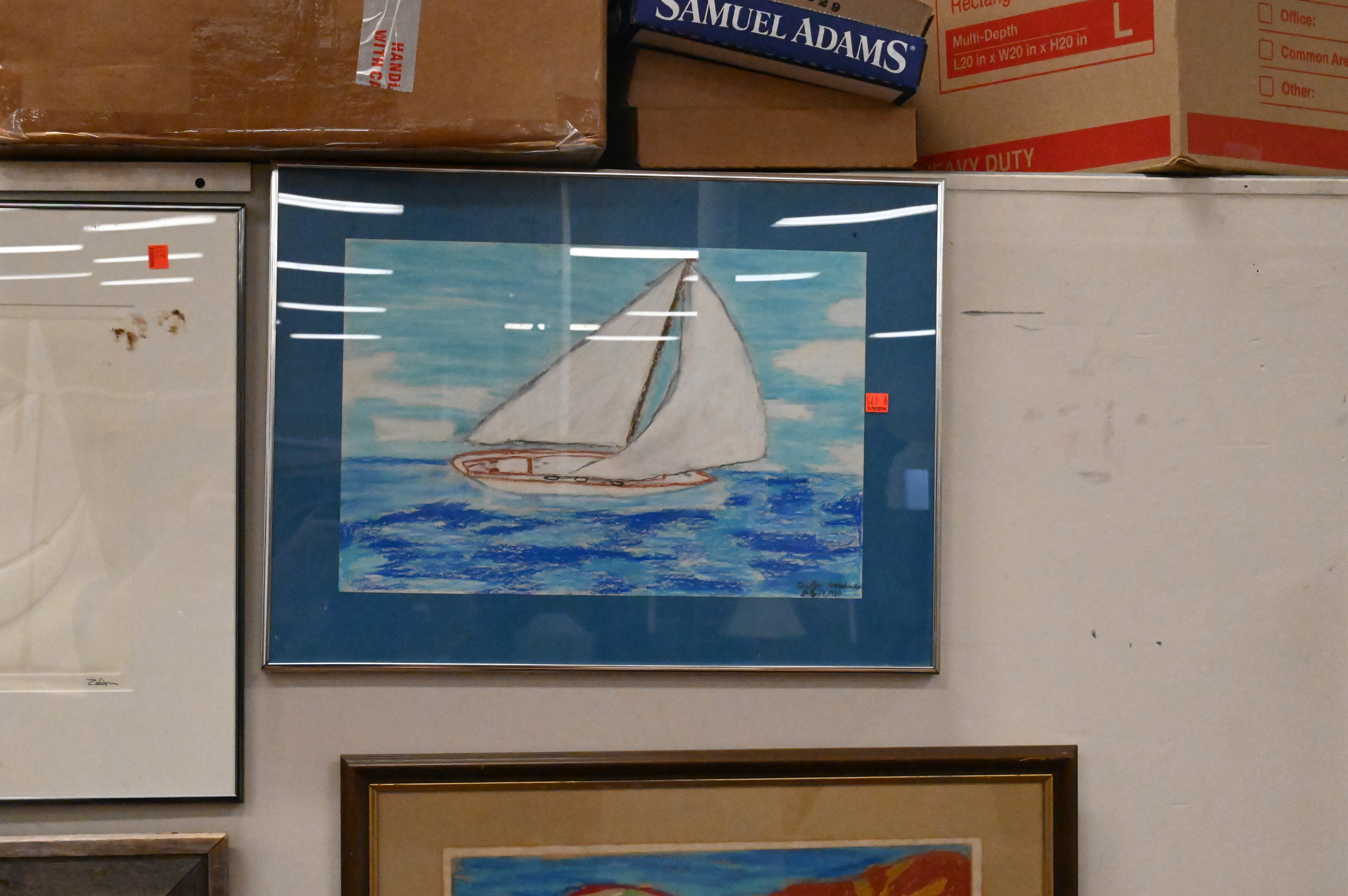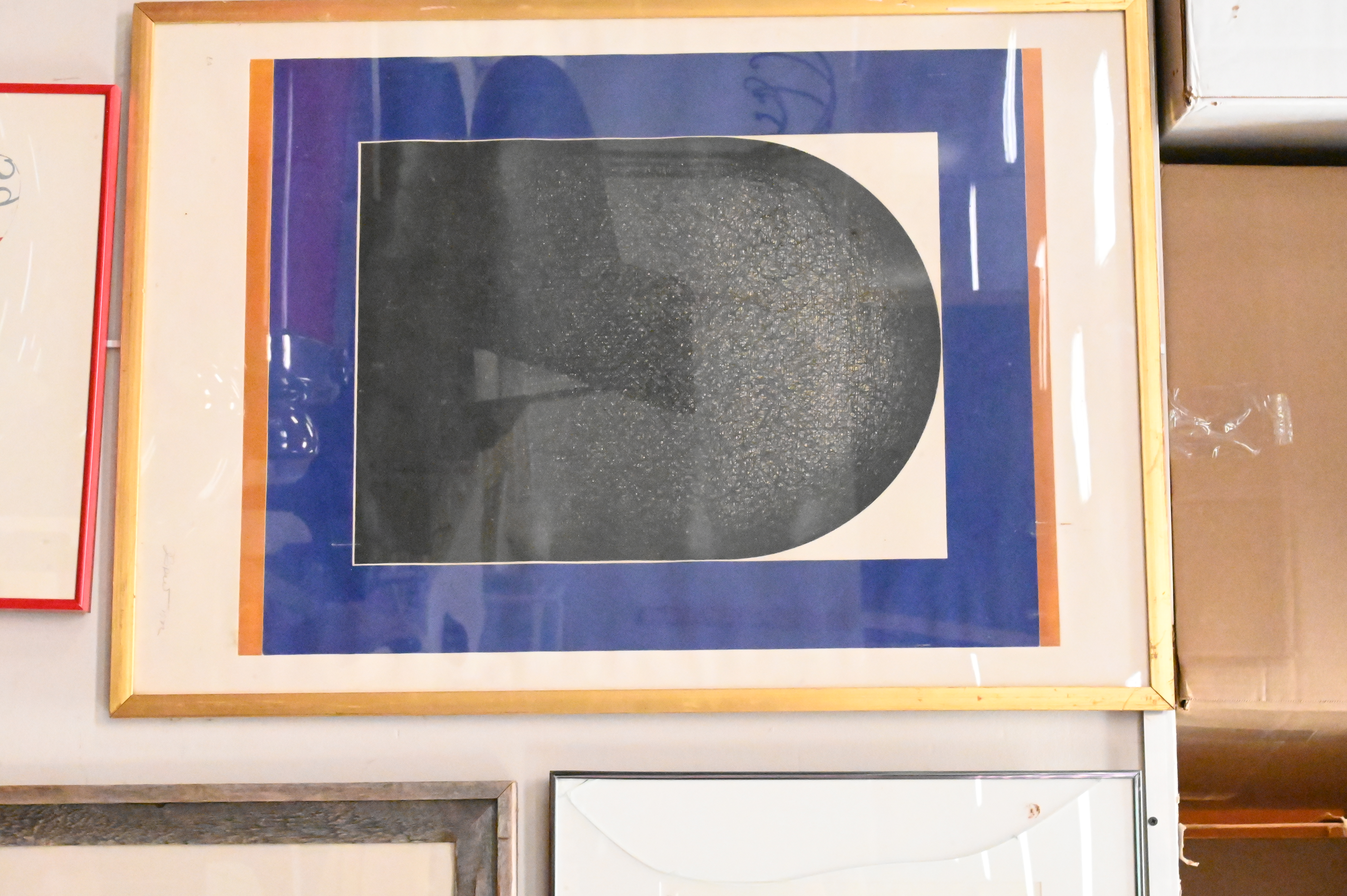 to include vintage cigarette poster, Tarla Kusu poster, Little Red Riding Hood or Snow White, print of a leaf, acrylic on paper of a dog, signed illegibly dated 1992, Joe Eula (American 1925-2004) print signed lower right “Eula”, “Pebbles” (basketball) embossed lithograph artist proof signed lower right, “Caligo Uranus” butterfly print watercolor, two pieces signed illegibly lower right and dated 2002, watercolor of a beach scene signed lower right, etching of an arch EA 1972 signed illegibly lower right, two oil pastels signed Arredondo, etcetera