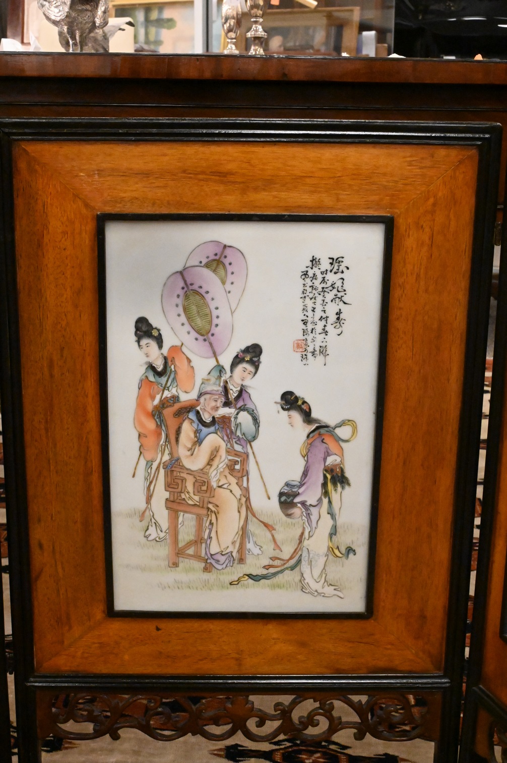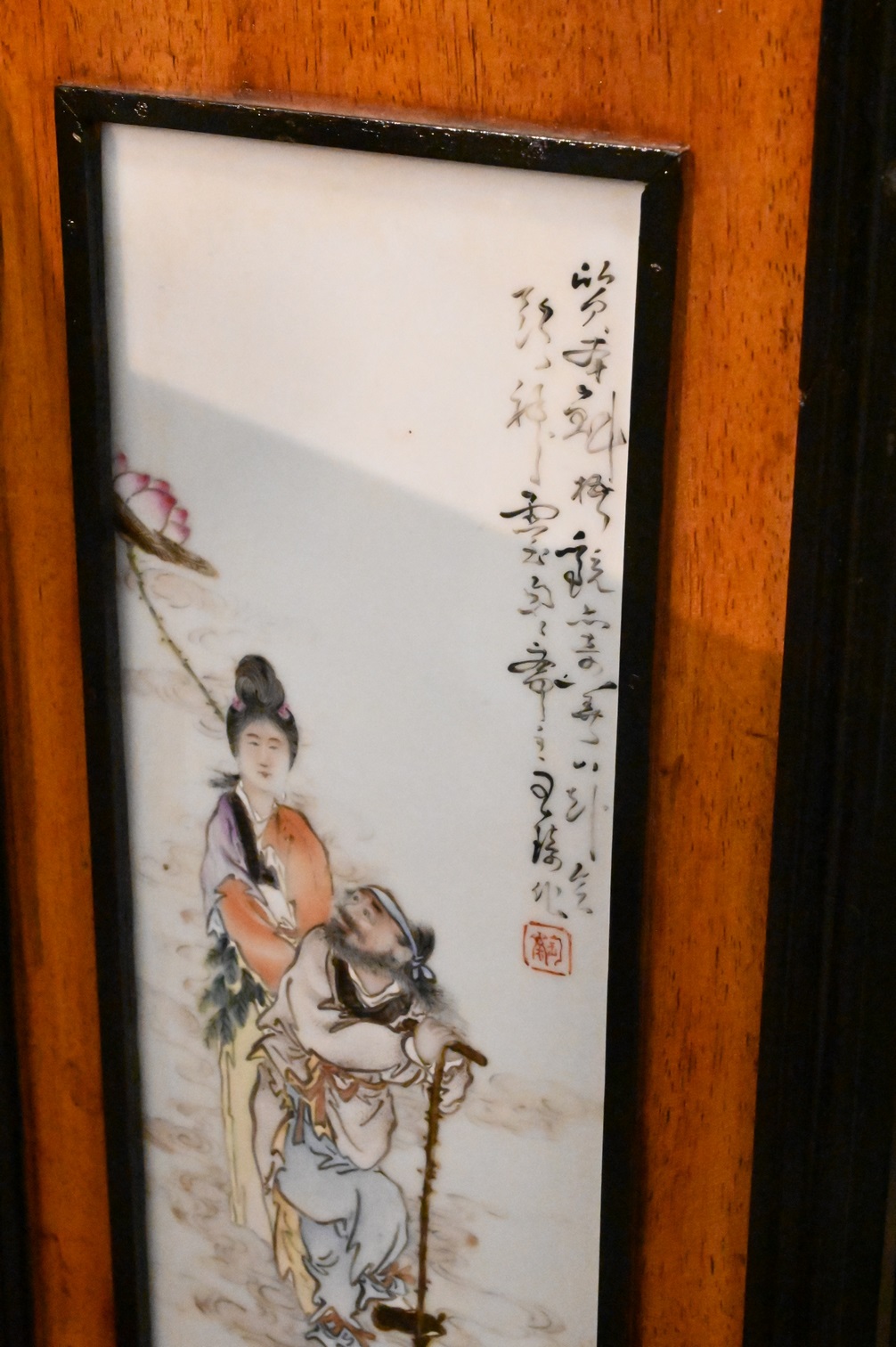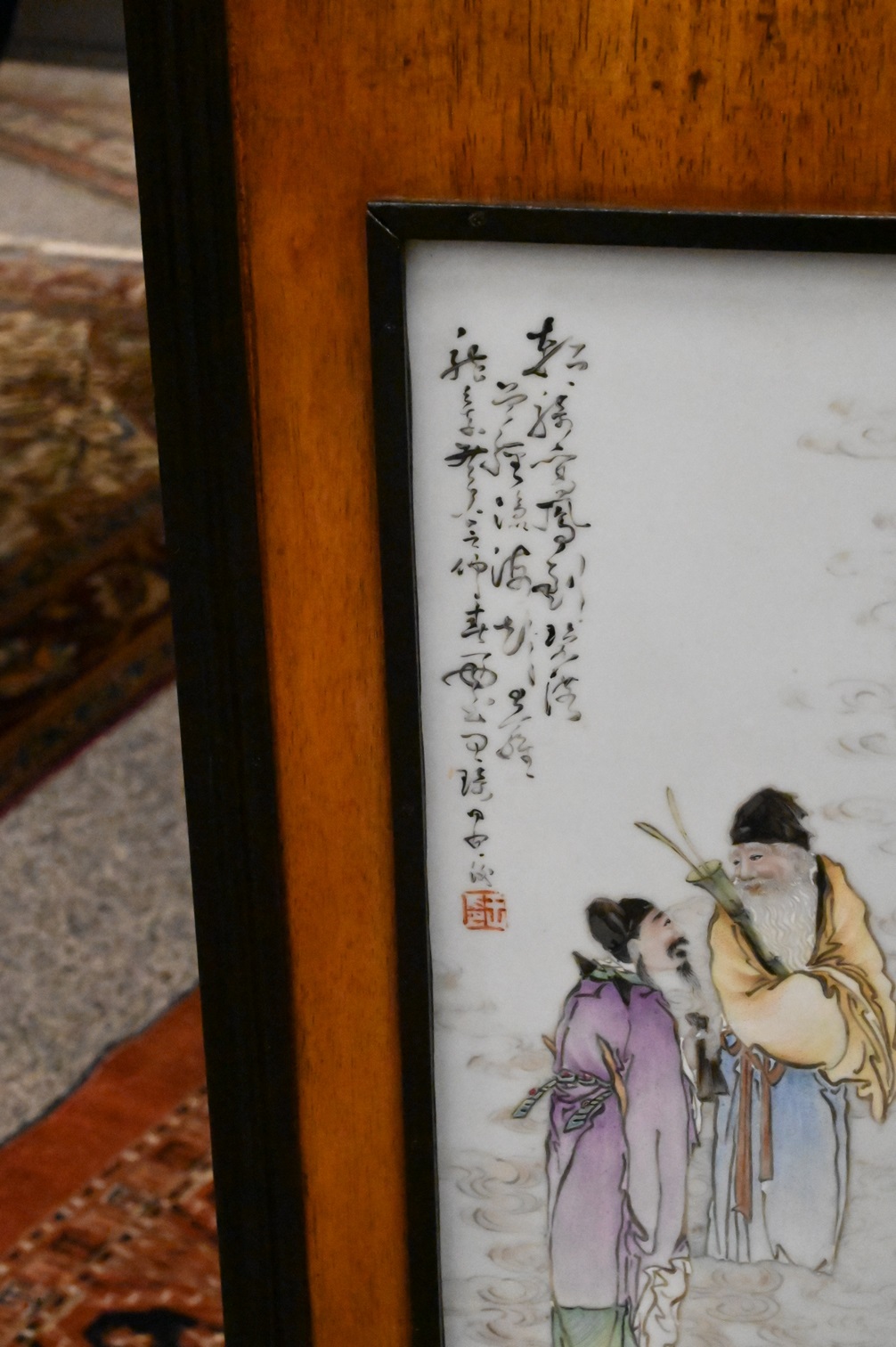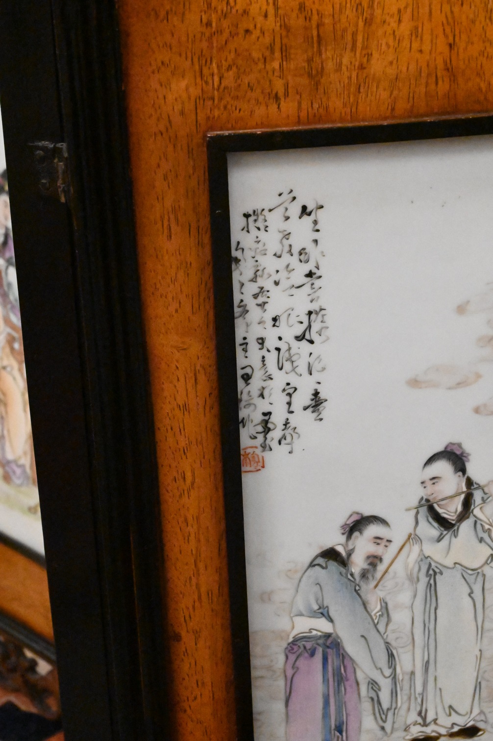 having five rectangular porcelain plaques, each painted with figures and scholars in landscape, in wood frame
