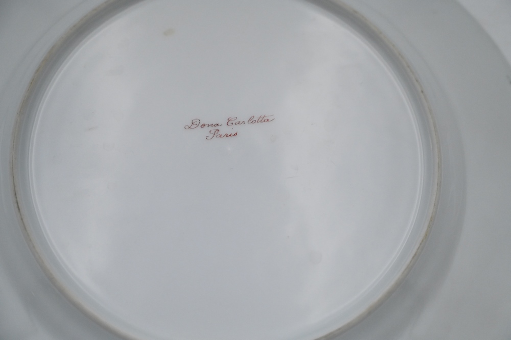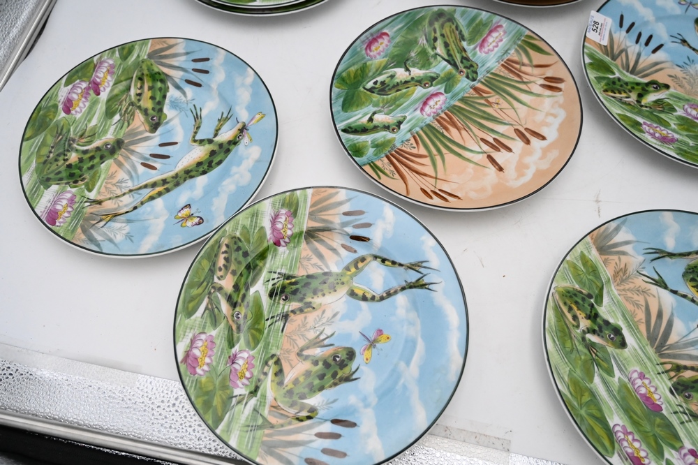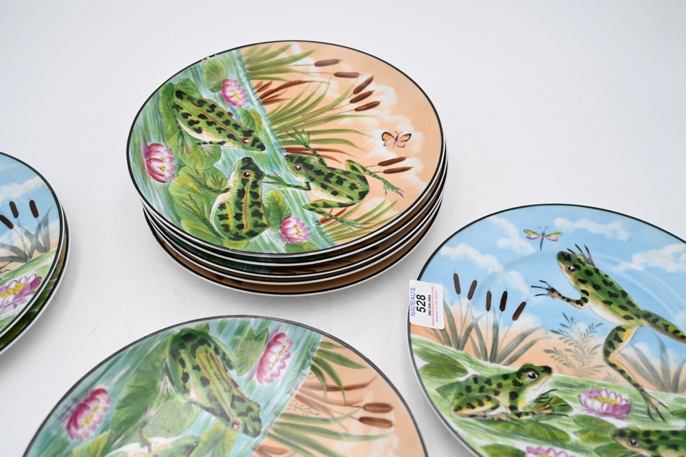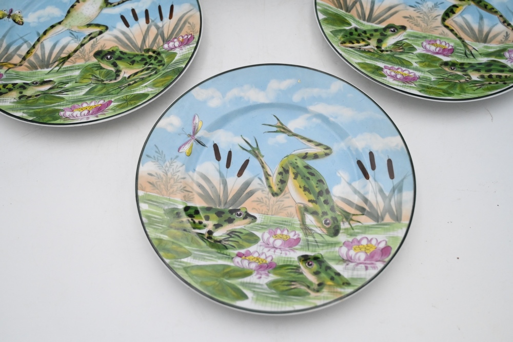 Lot 528: Set of 12 Dona Carlota Porcelain Frog Plates, having hand painted scenes of frog catching dragonflies, diameter 9 3/4 inches.
