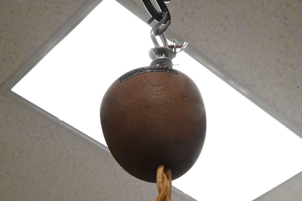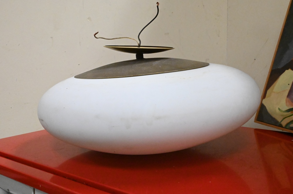Lot 528: Two Danish Modern Hanging Lights, one having three frosted globes and one ceiling light with large shade, height 36 inches.