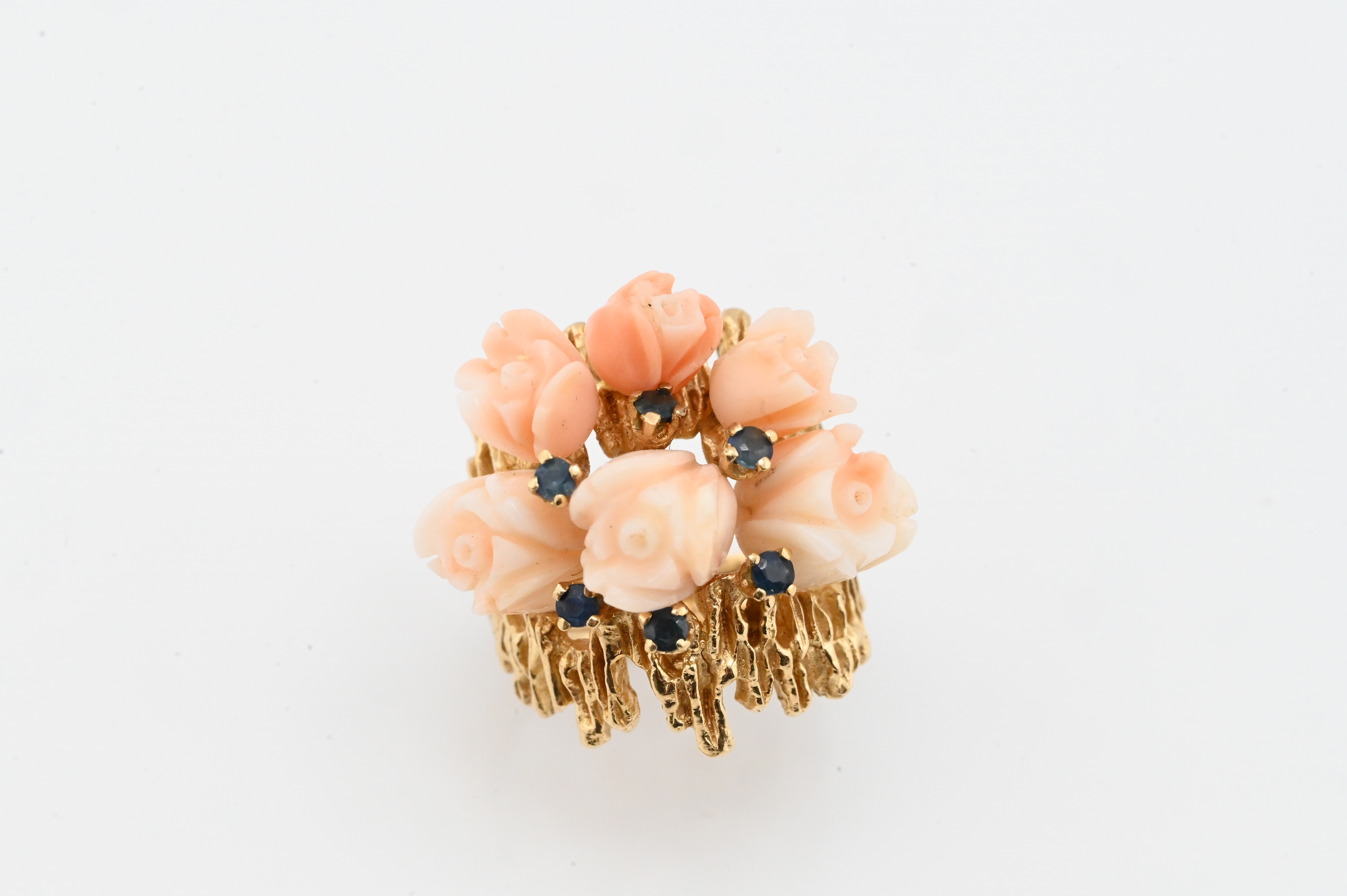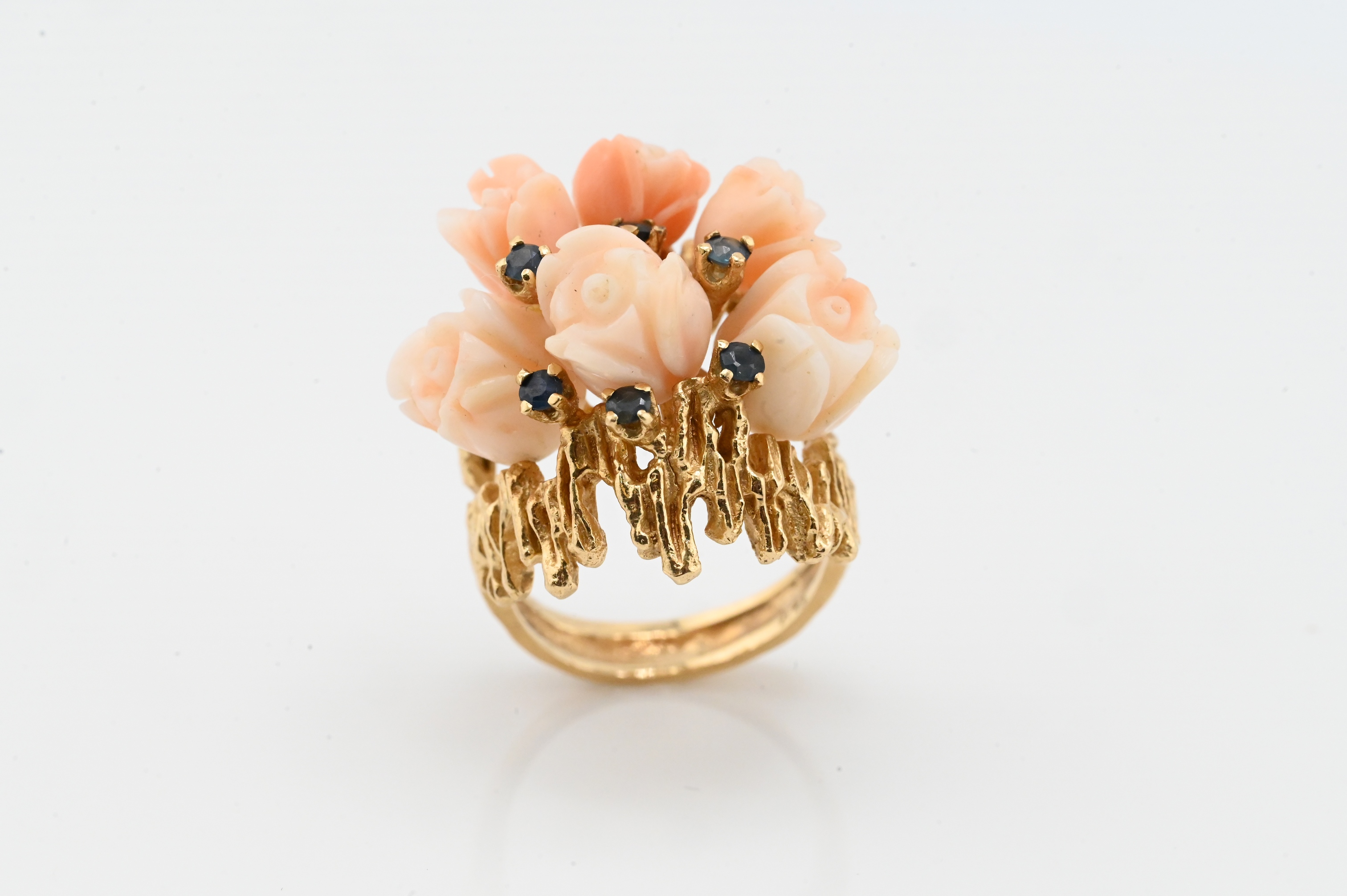 Lot 529: 14K Gold Ring with Carved Coral Flowers and Blue Sapphires