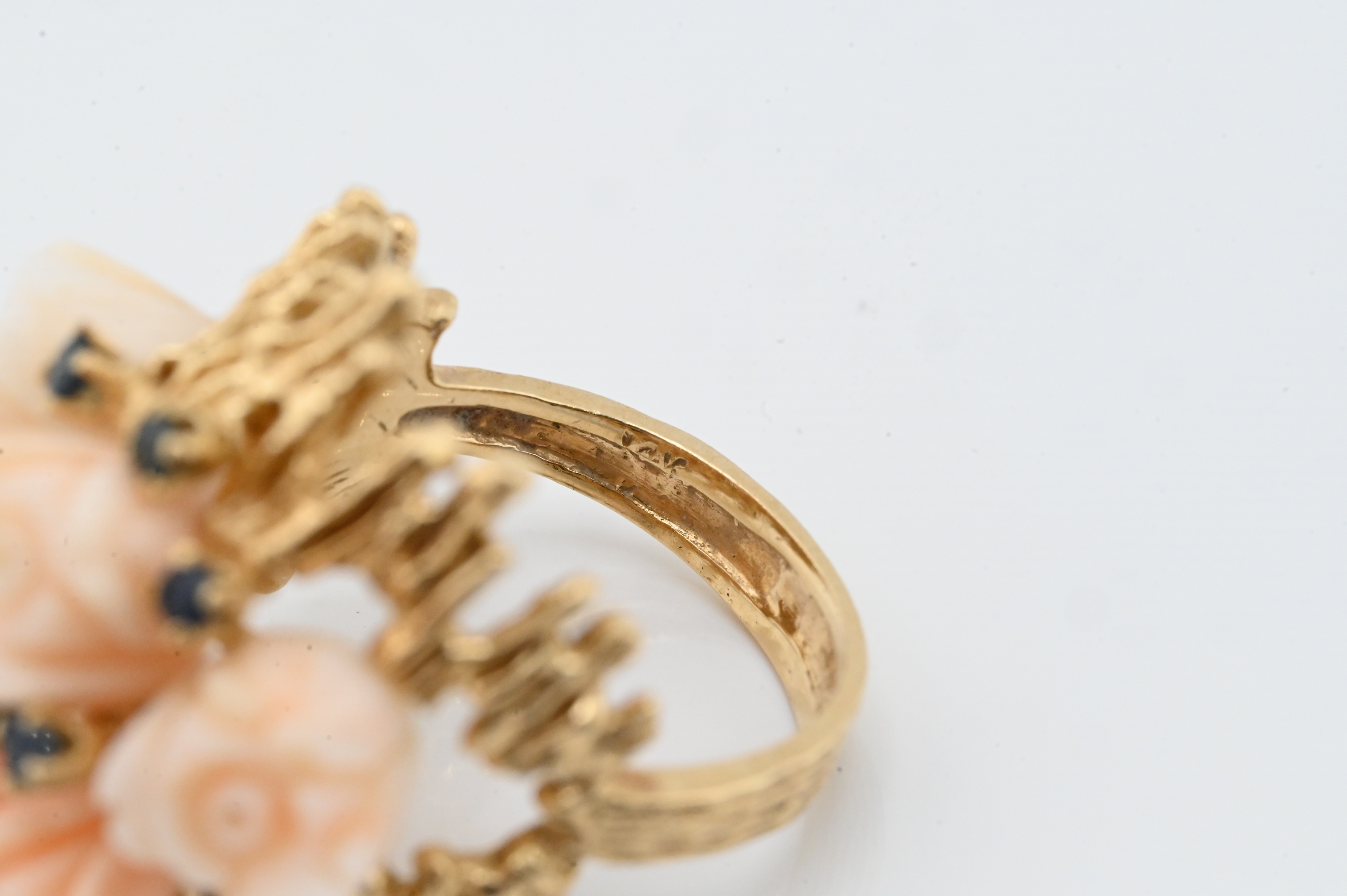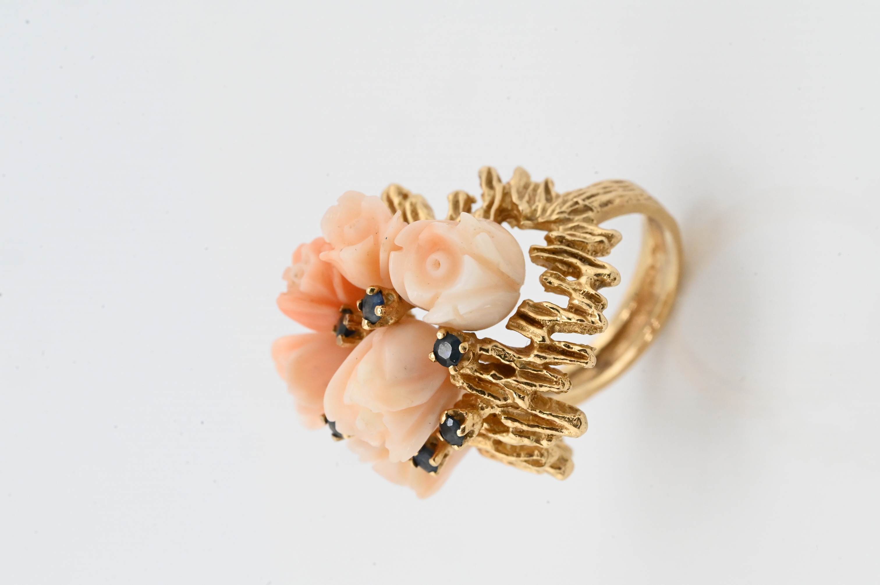 14K Gold Ring with Carved Coral Flowers and Blue Sapphires