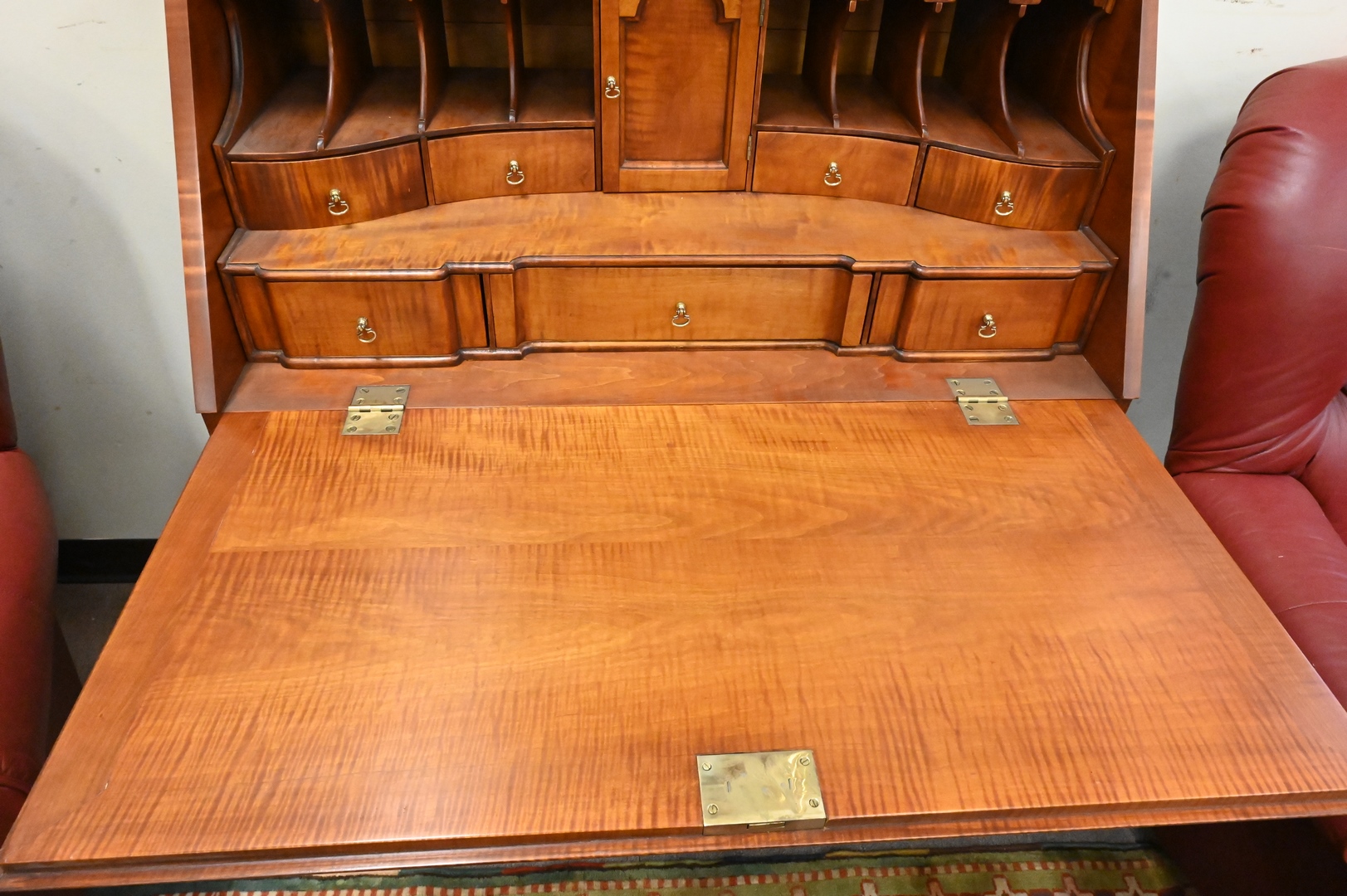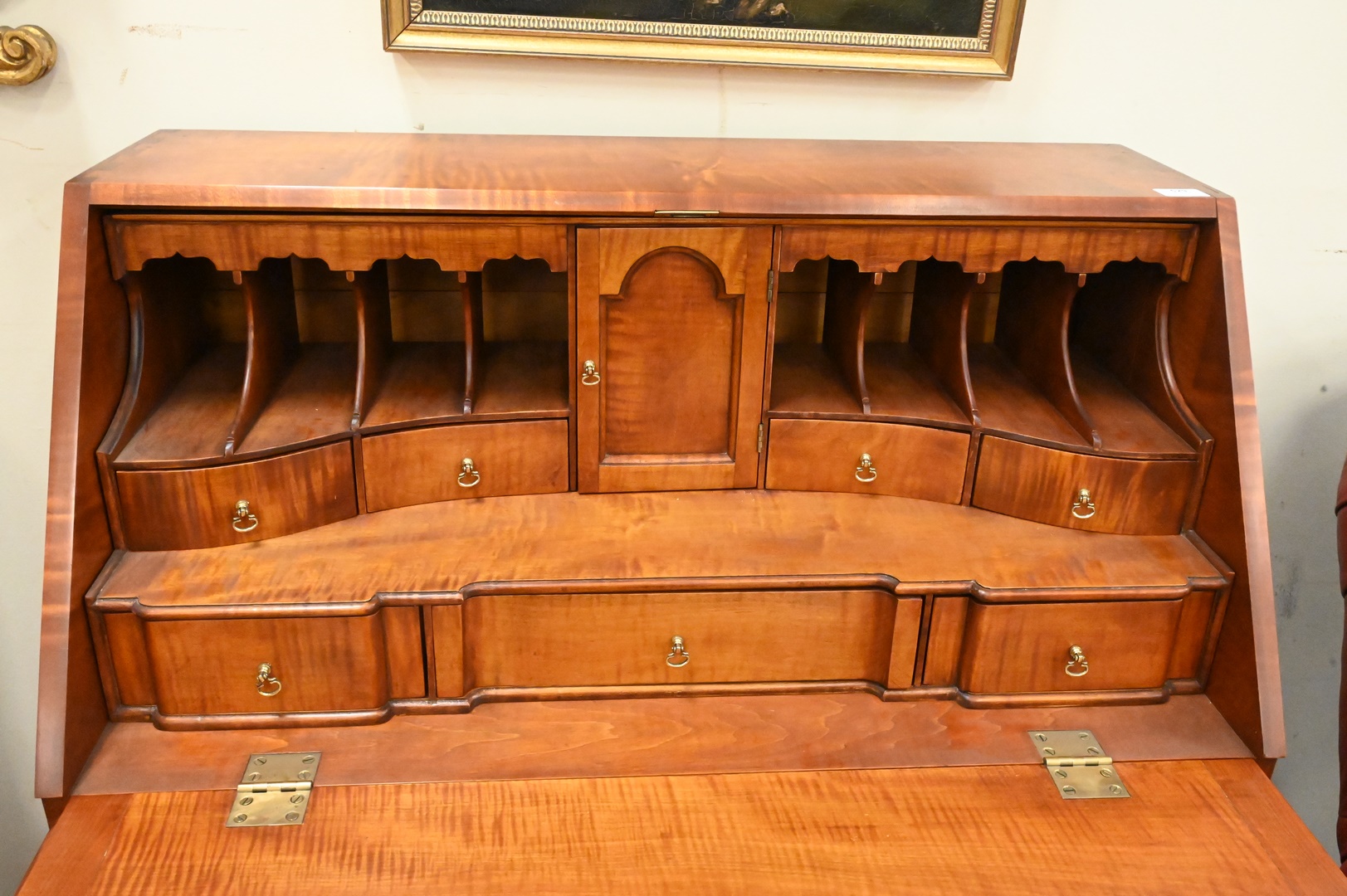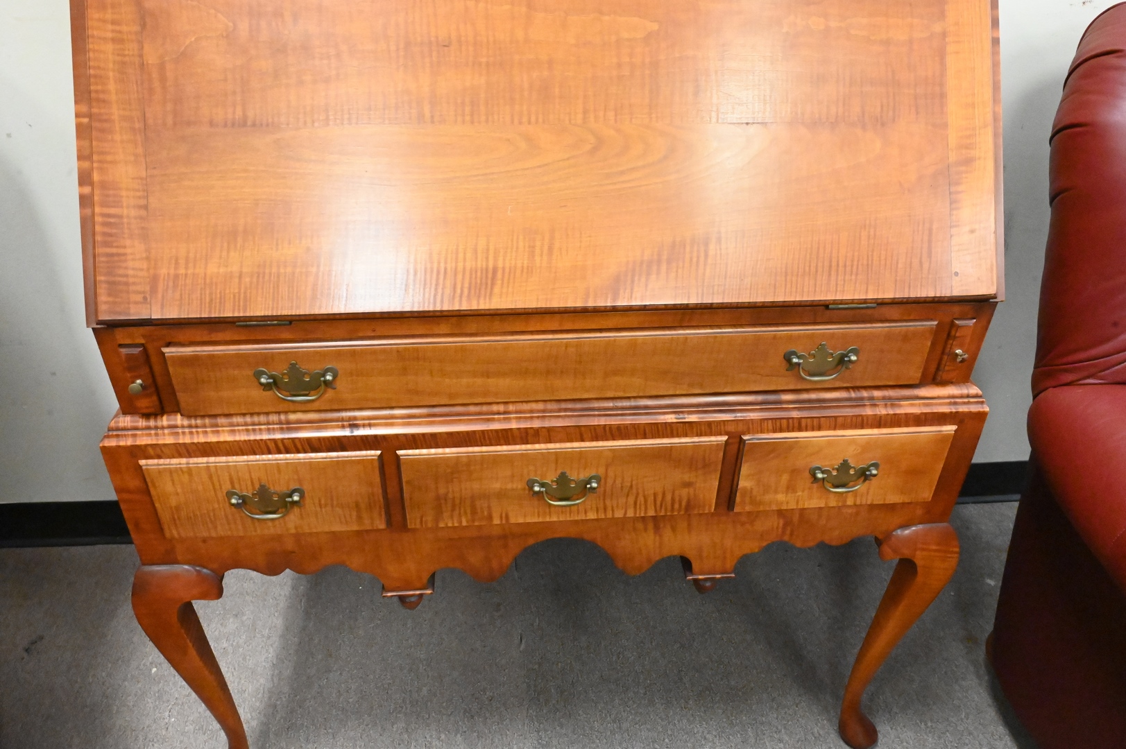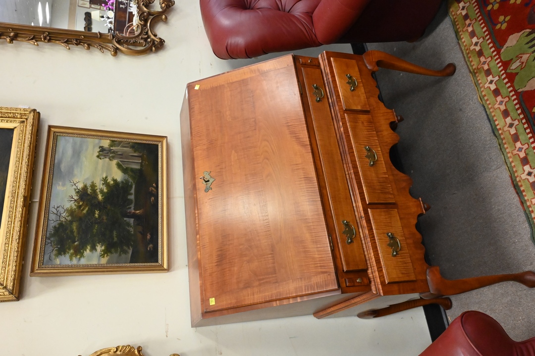 Benchmade Queen Anne Style Tiger Maple Slant Lid Desk, on frame, having fitted stepped interior, height 45 1/2 inches, width 36 inches.