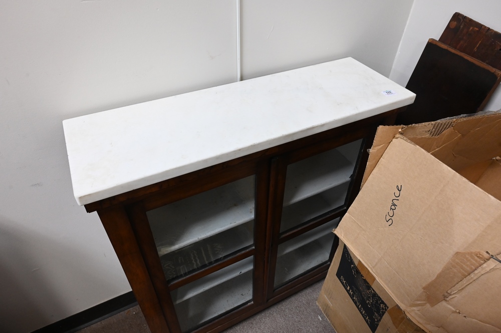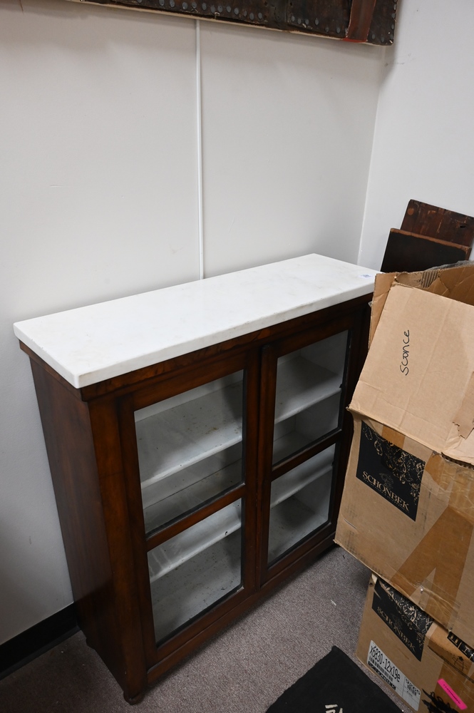 Lot 529: Continental Mahogany Two Door Cabinet, having marble top, height 36 inches, top 11″ x 33 1/2″.