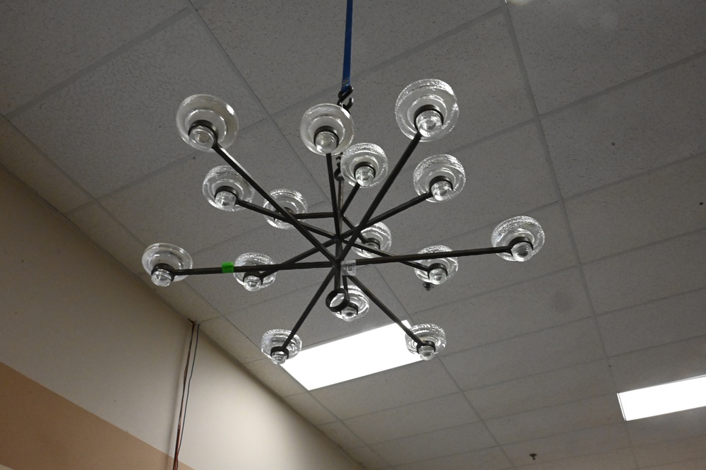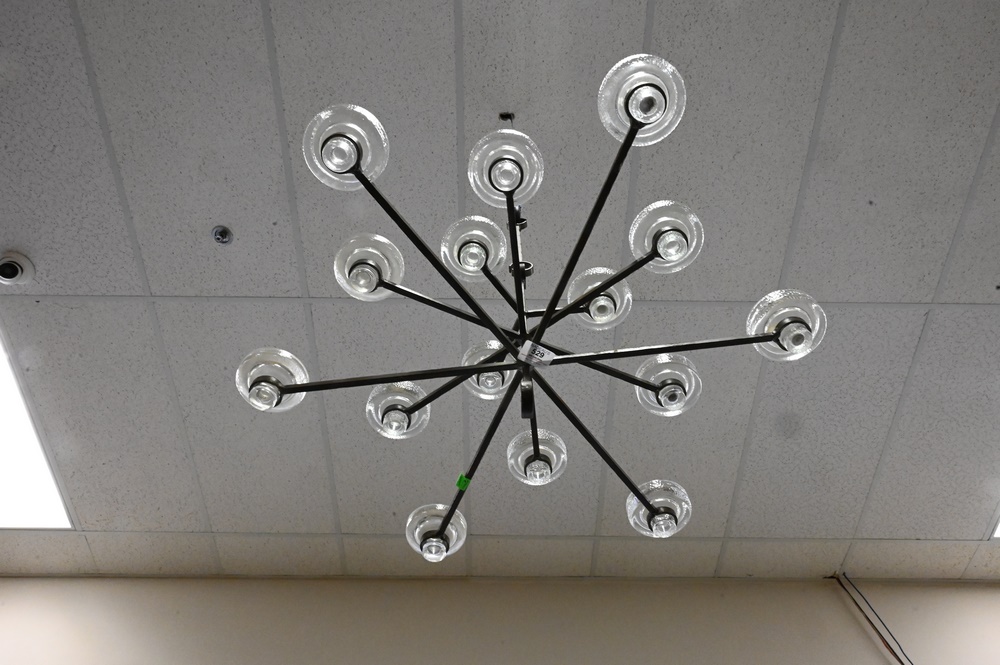 Lot 529: Erik Hoglund Iron and Glass Mid Century Hanging Chandelier, height 23 inches, diameter 27 inches.
