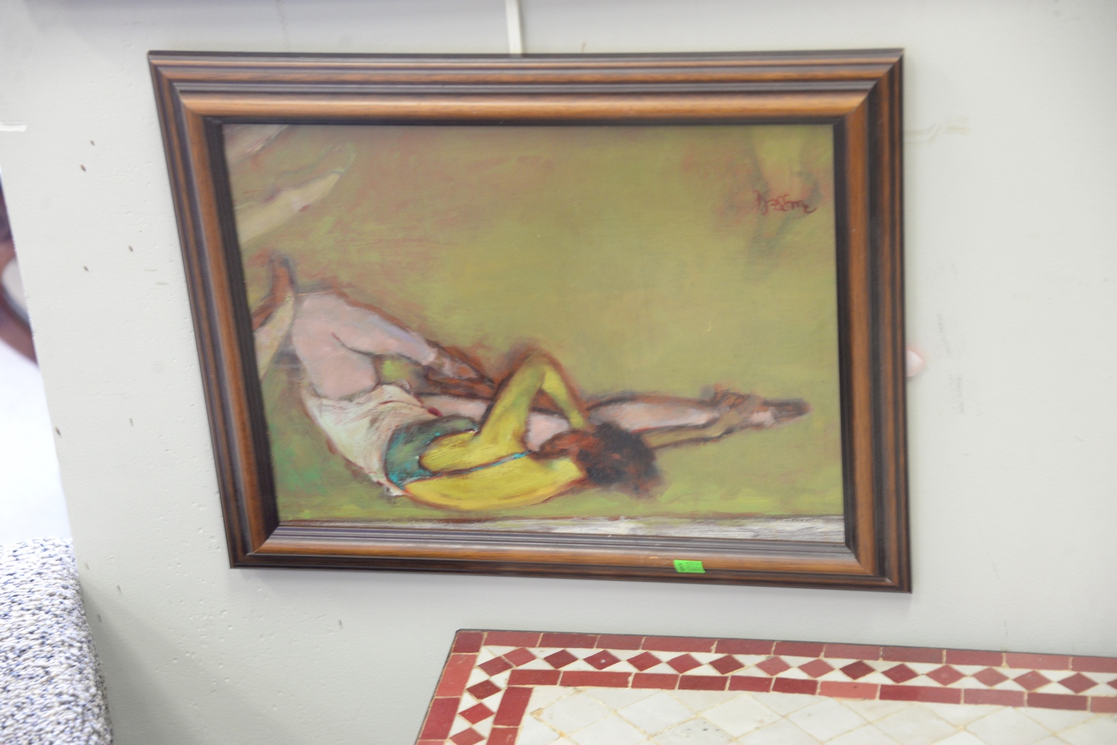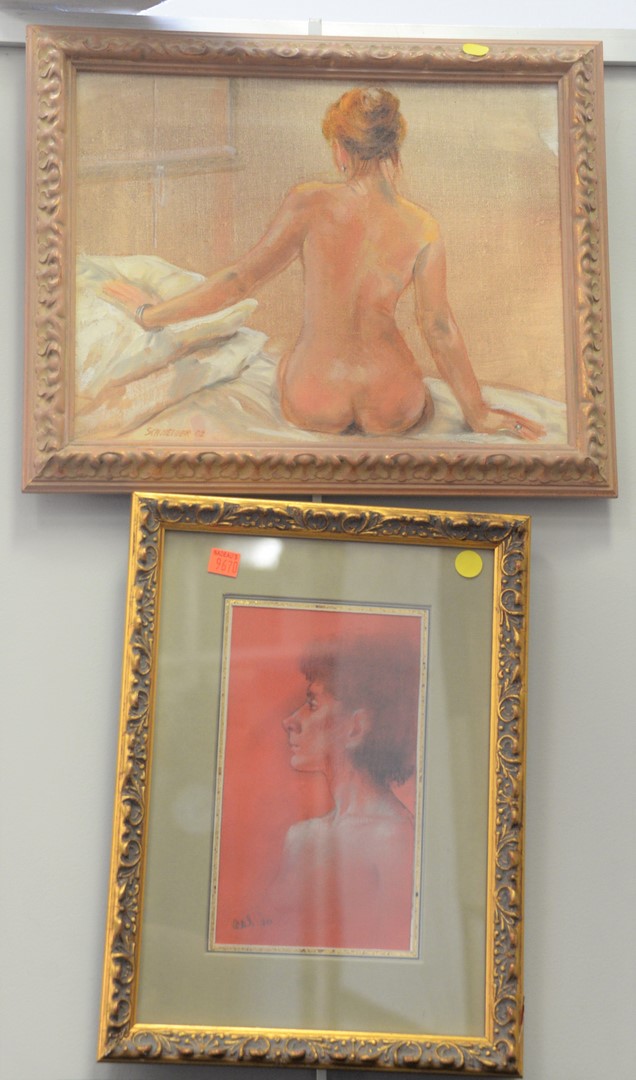 Lot 529: Group of Four Pieces of Art to include David G. Powrie, oil on board, full length nude Carol Schneider, acrylic on canvas, portrait…