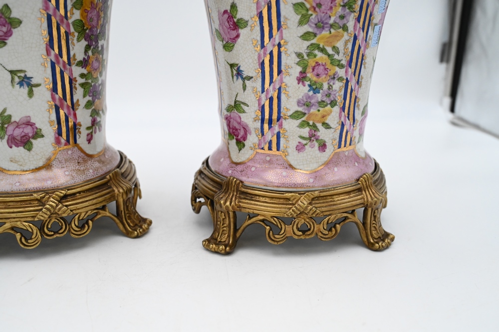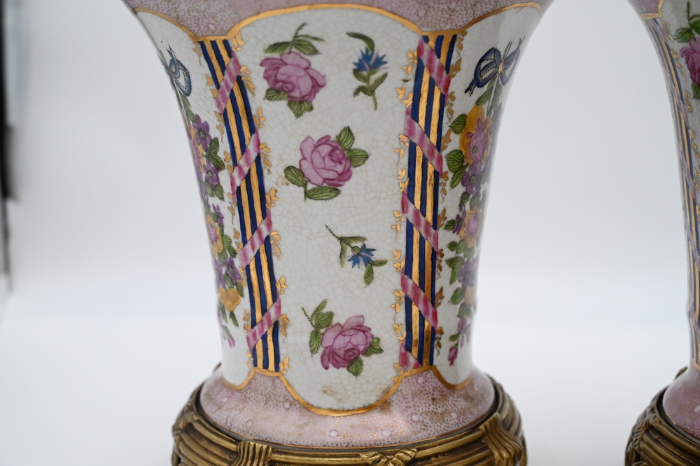 Pair of Porcelain Urns, having bronze rim and foot, 20th century, Oriental seal mark on bottom, height 12 1/2 inches.