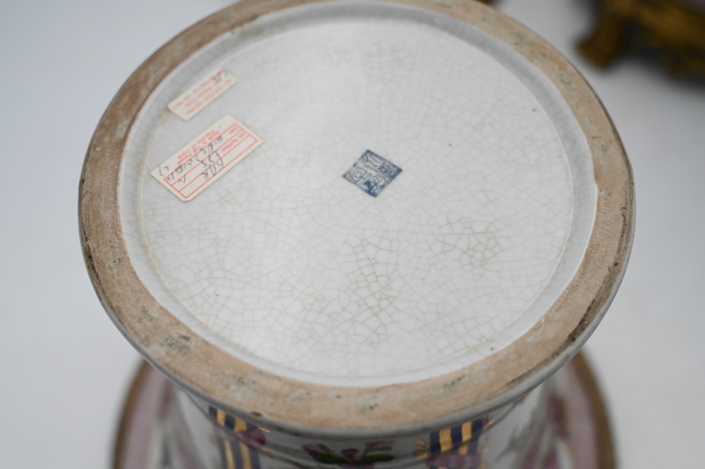 Lot 529: Pair of Porcelain Urns, having bronze rim and foot, 20th century, Oriental seal mark on bottom, height 12 1/2 inches.