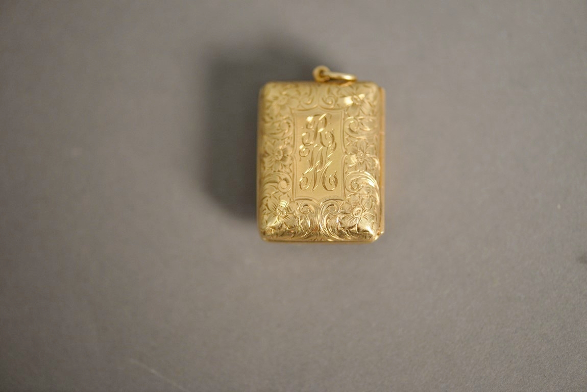 14K gold locket with hand painted Victorian woman, opens to reveal smallest English Dictionary in the world according to the book, monogrammed. 1 1/8 x 3/4
