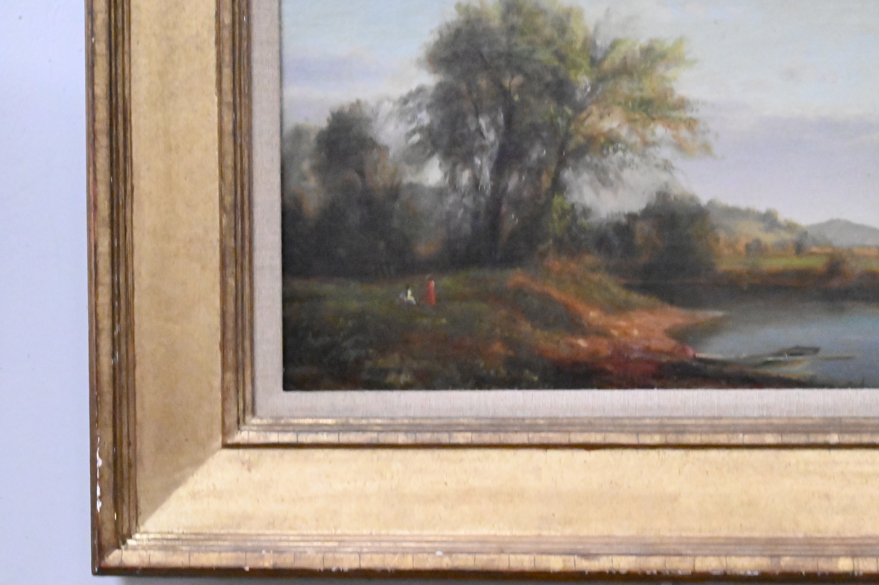 Hudson River landscape featuring two women sitting on the grass and one boat docked