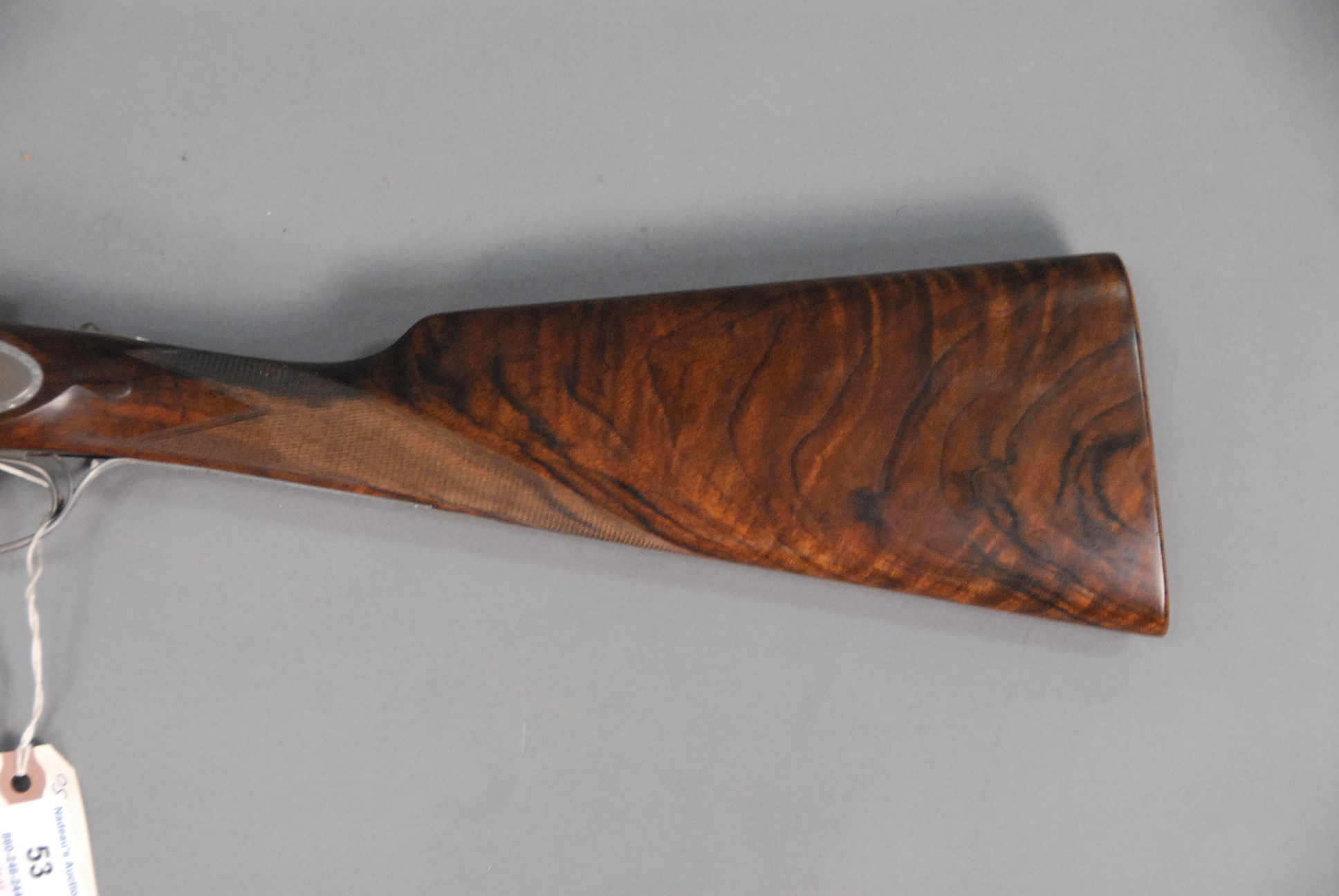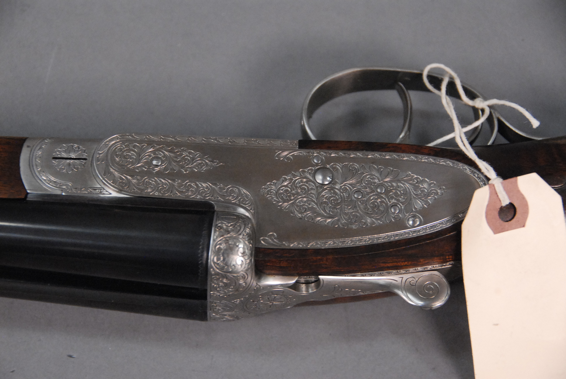 Armas Garbi, model 101, shotgun, marked William Larkin Moore & Co., side by side, 28 ga. having hand engraved continental style large scrolls, double triggers, finely checkered fore-end, and straight burl walnut stock, barrel lg. 29, sn 06596, 350.