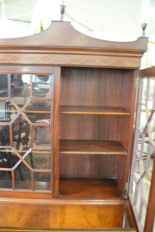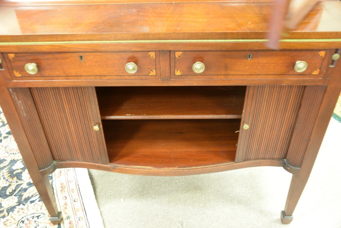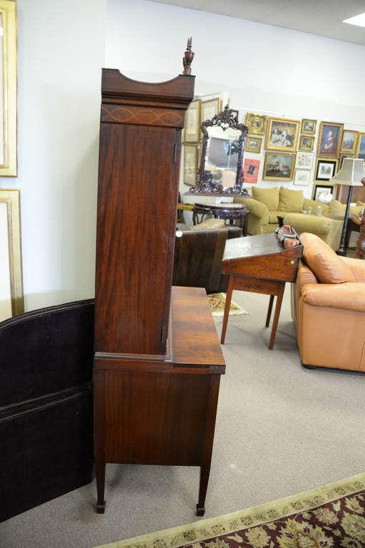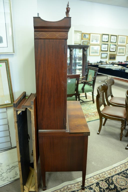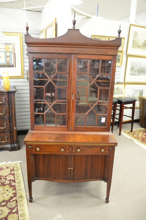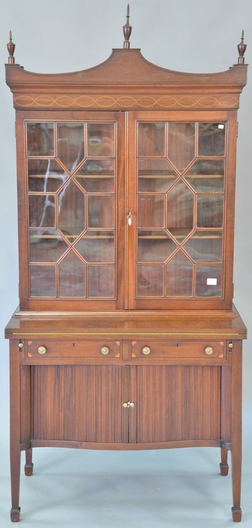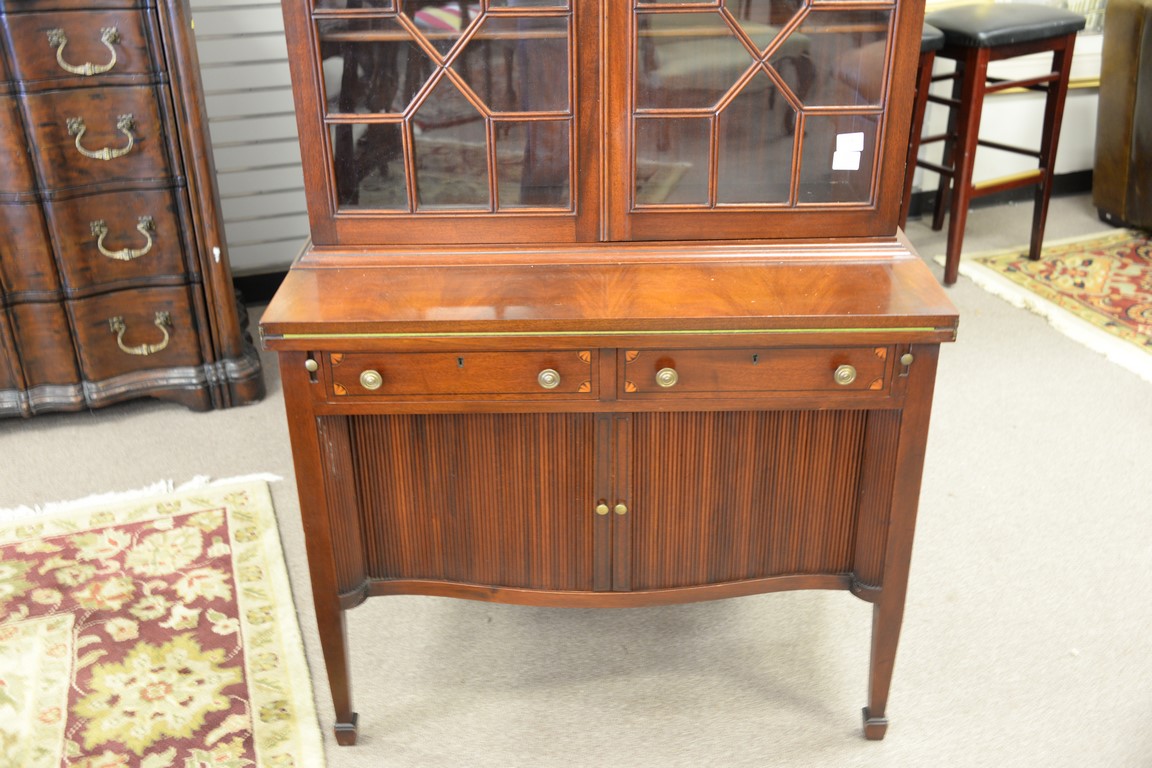 Lot 53: Charak mahogany Federal style two part secretary desk with tambour doors, signed Charak Boston 1931. ht. 81in., wd. 37in., dp. 20in.