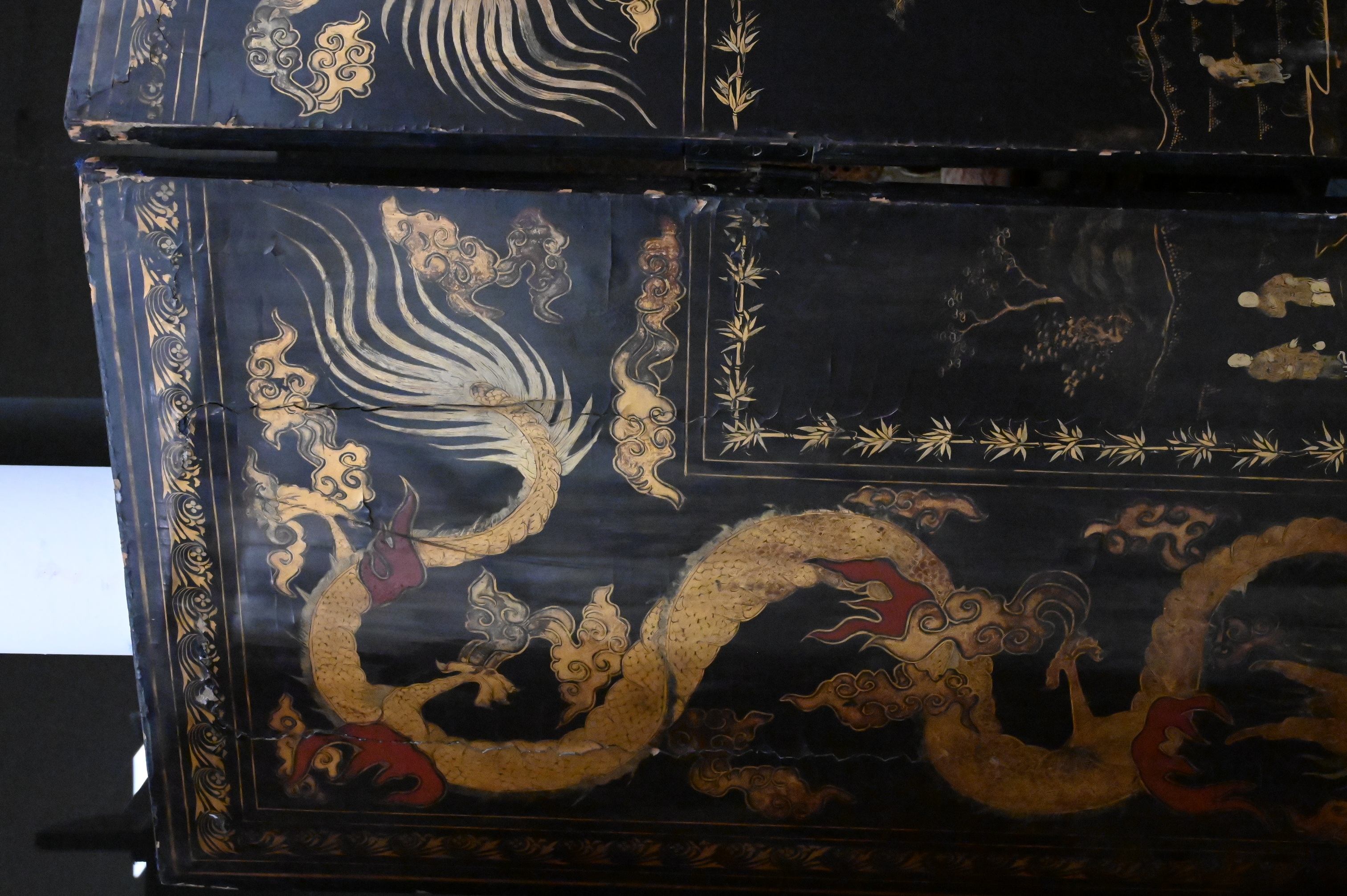 Condition: Surface wear, scratches, and scattered losses to lacquer; hinges with wear; overall stable and decorative.