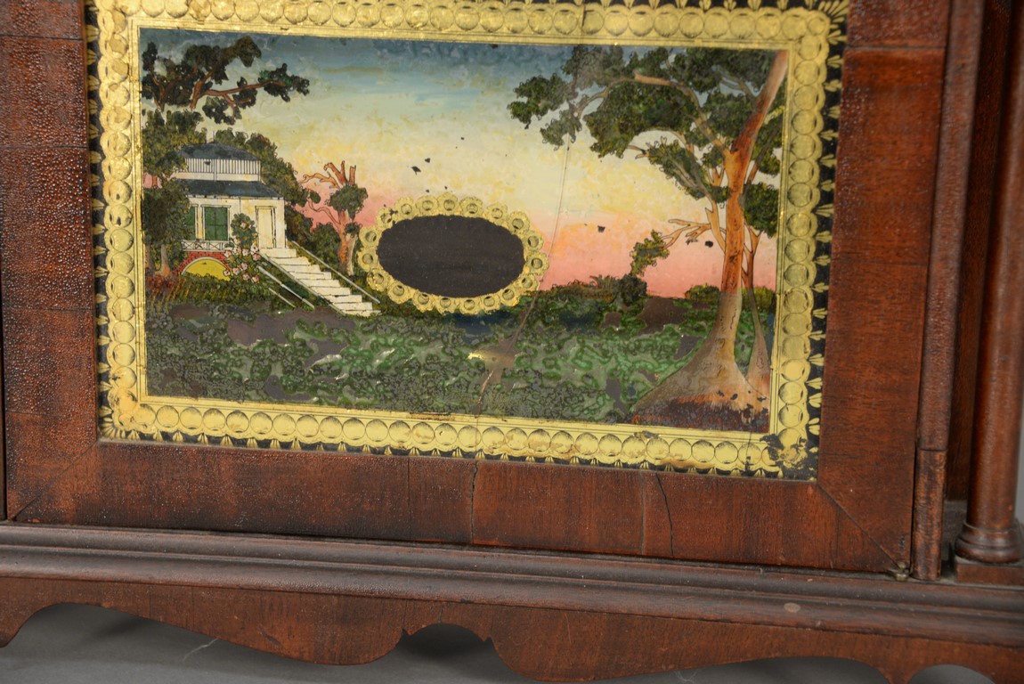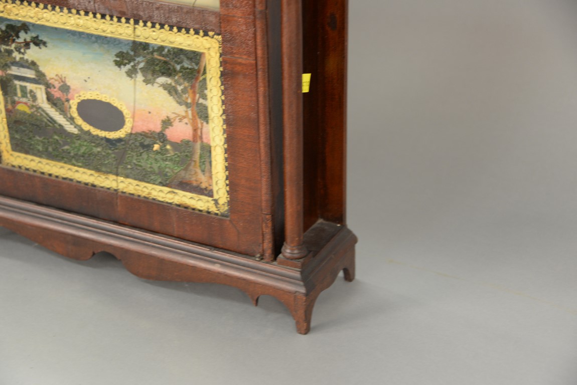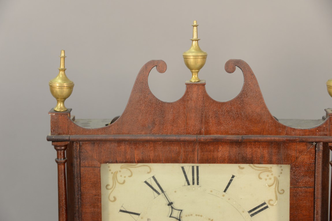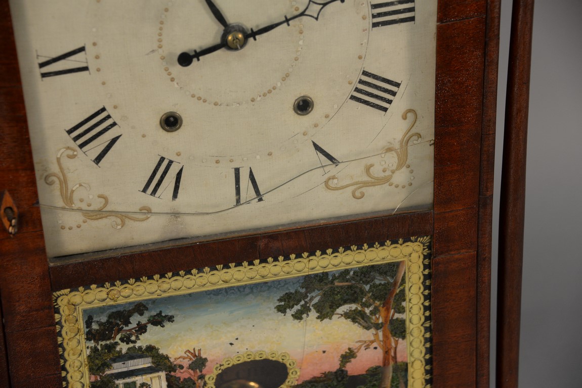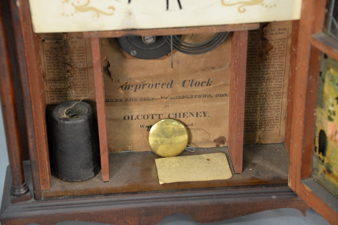 Lot 53: Federal mahogany pillar and scroll shelf clock with wooden weight driven movement, original glass and reverse painted landscape both cracked, with original finials, made and sold at Middletown, Con. By Olcott Cheney, circa 1800 low. ht. 28