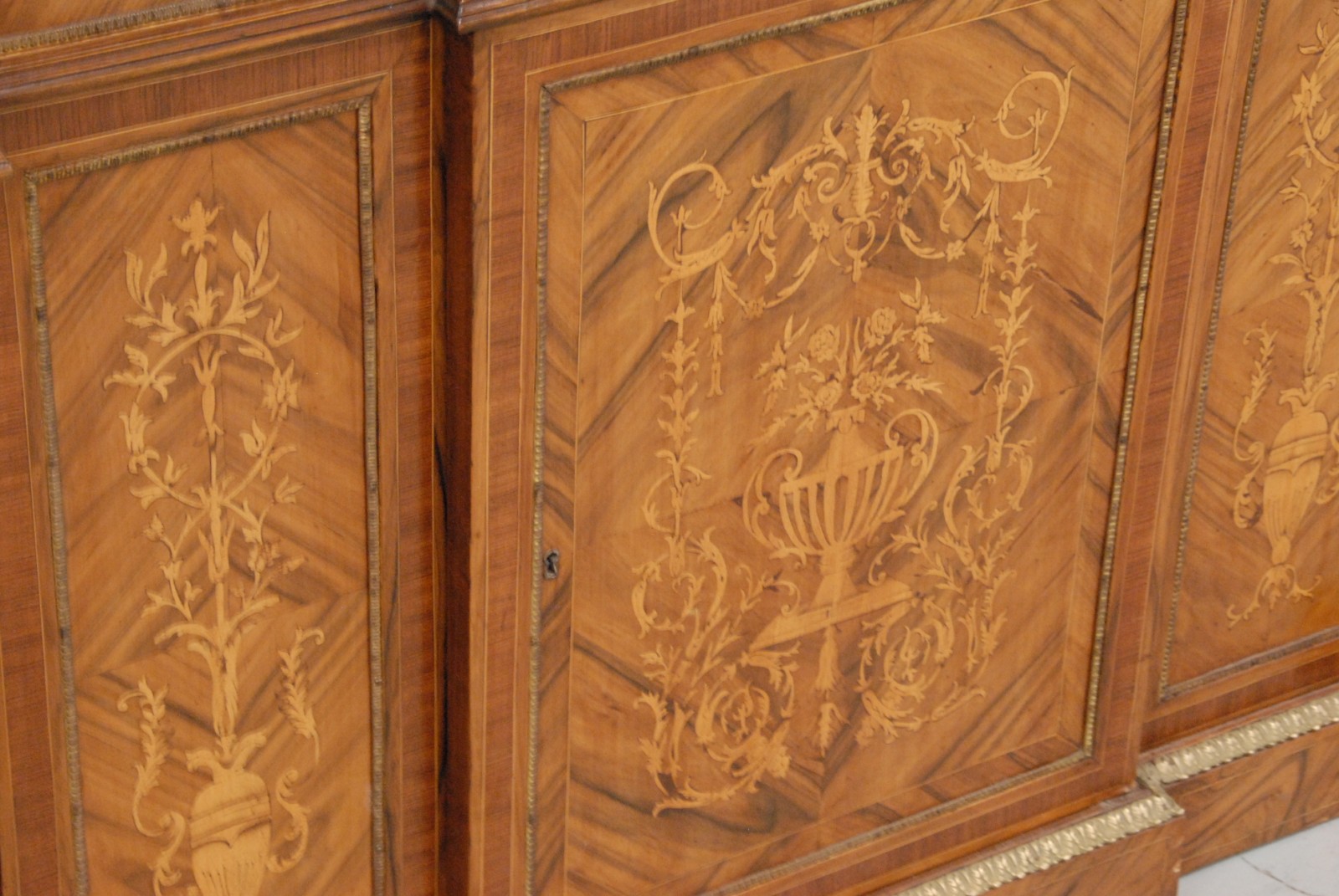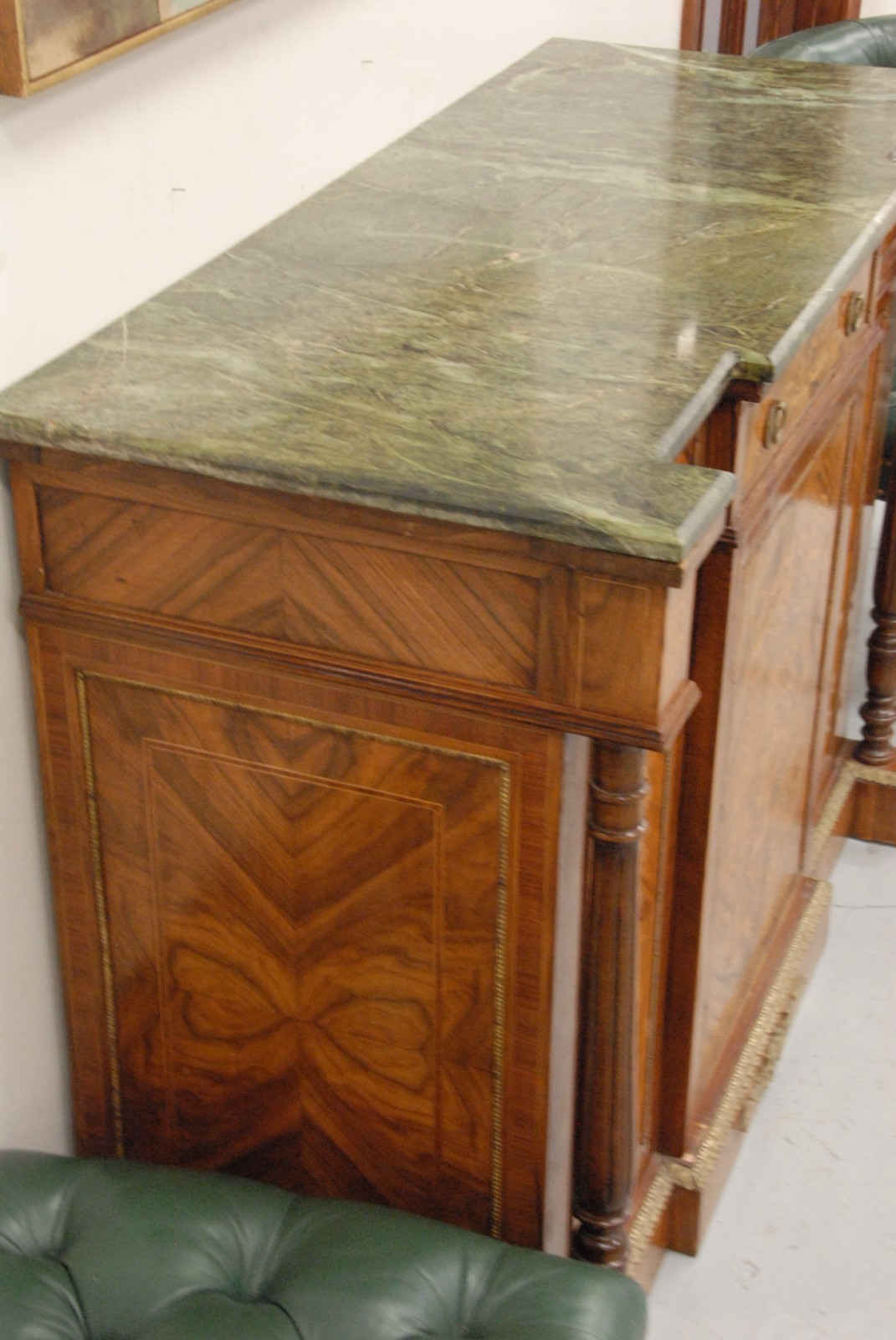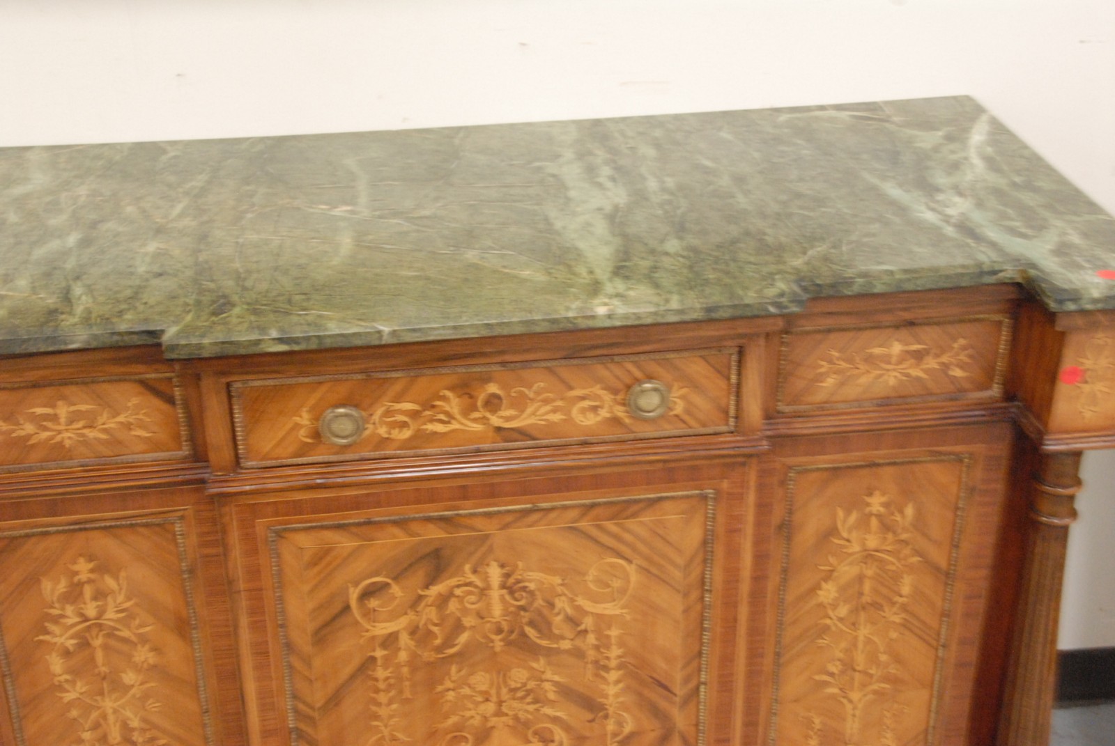French style marble top inlaid cabinet, with a drawer and doors.
