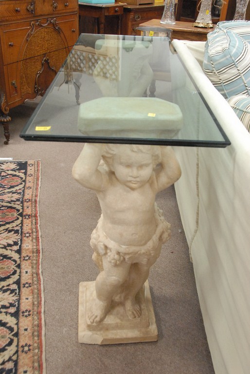 Glass top sofa / hall table held up by two cherubs one chip in base of cherub.