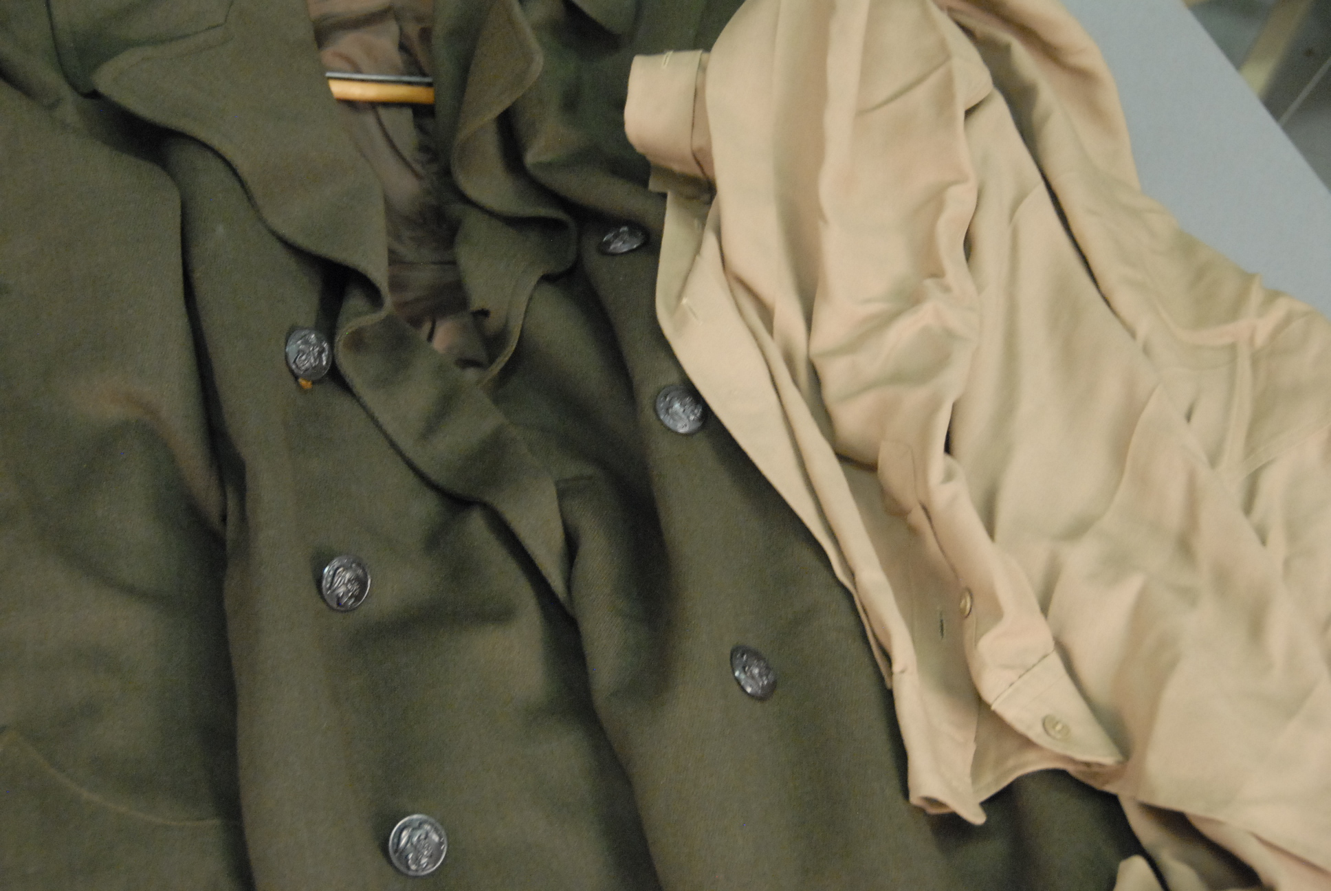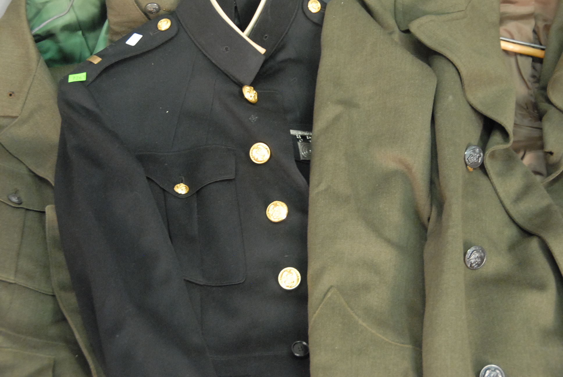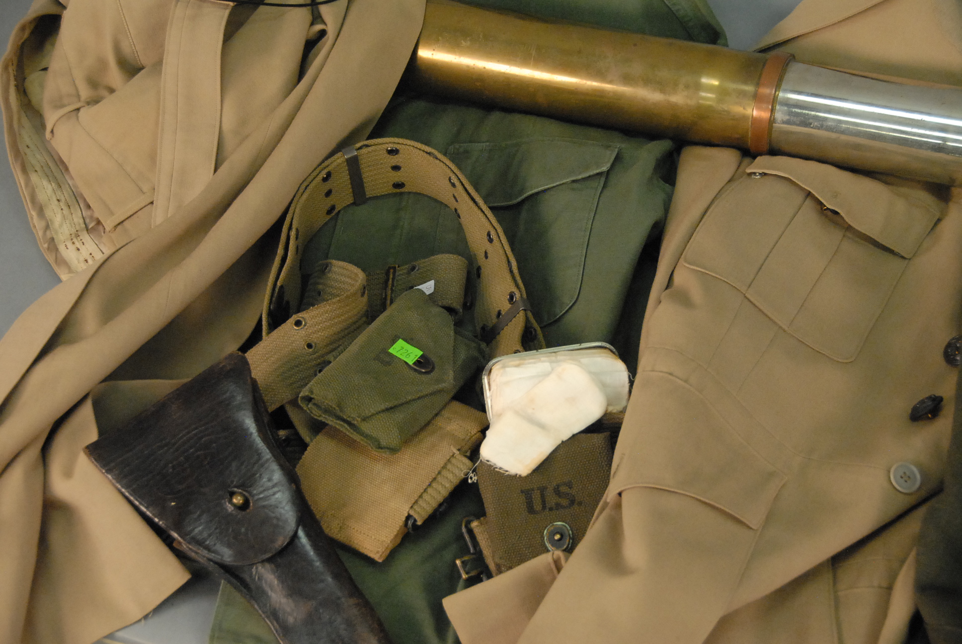 Group of military clothing, belts, holsters, etc.