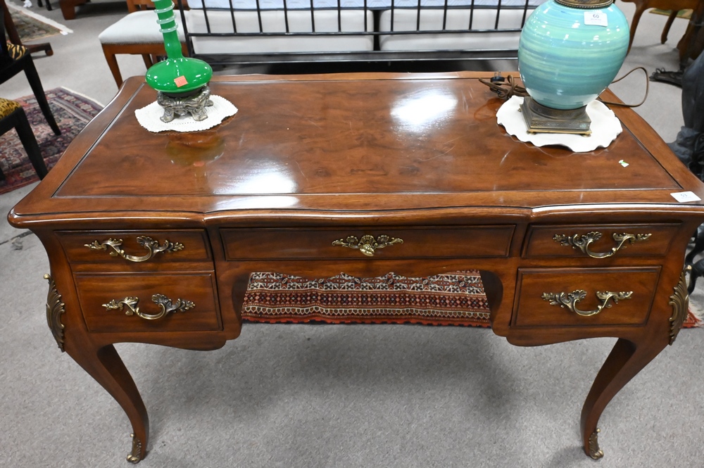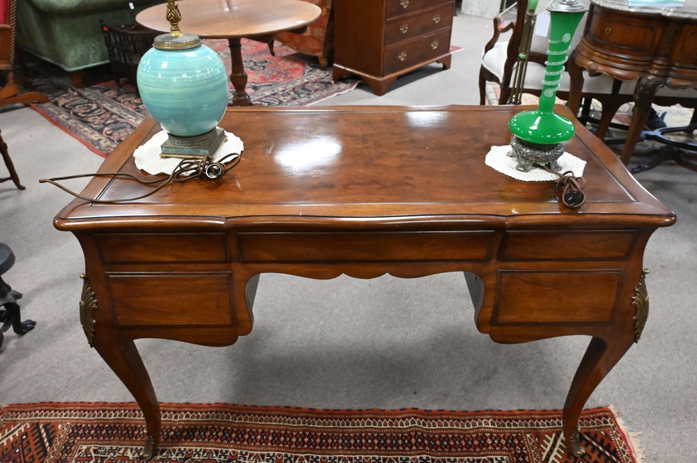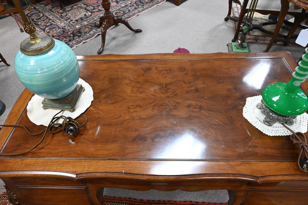 Karges Louis XV Style Burl Desk, having shaped top, height 29 1/2 inches, top 24″ x 46″.