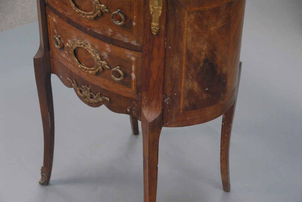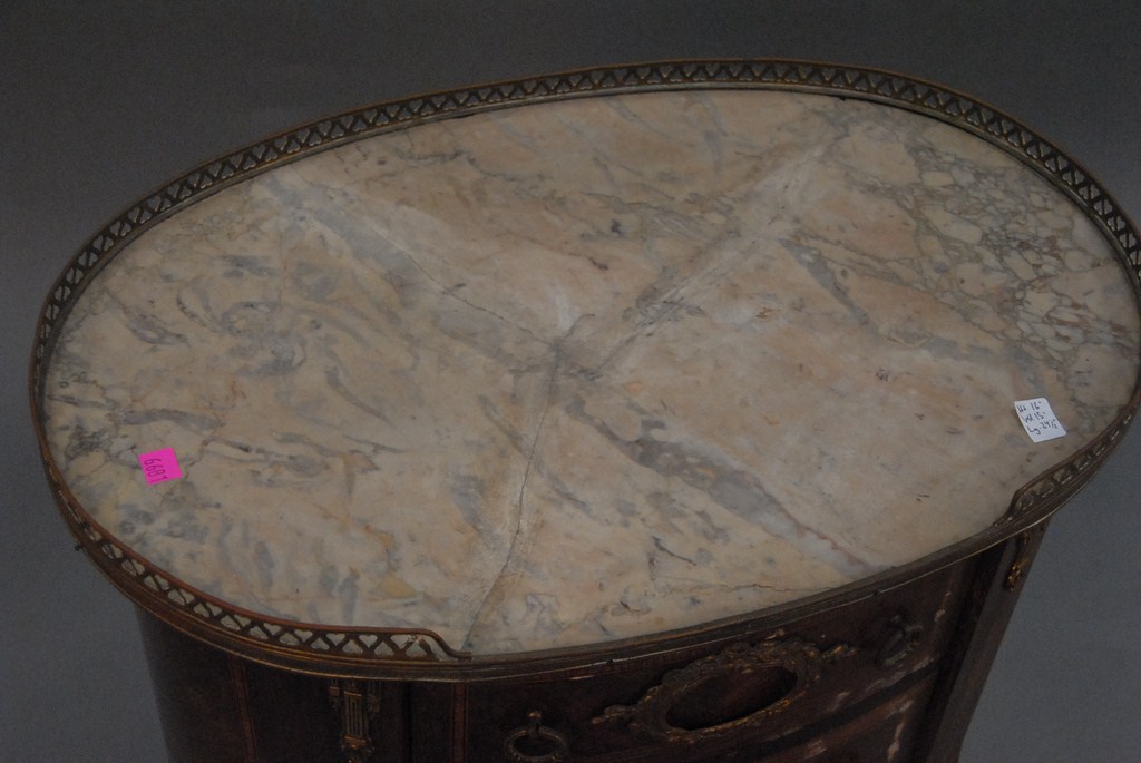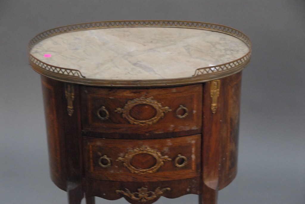 Marble top French two drawer stand with brass trim marble cracked.