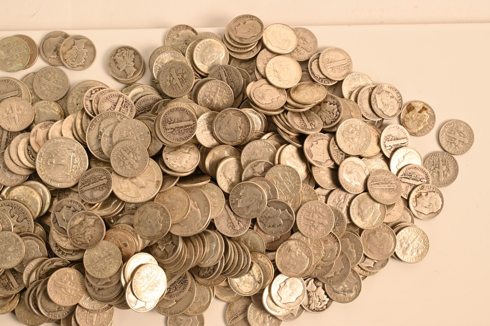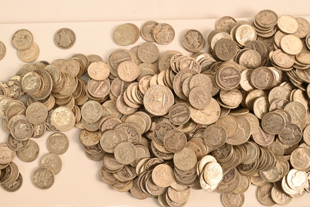 Lot 53: Mixed Lot of coins, to include 90% Silver Quarters and Dimes, dimes face value $58.50, quarters face value $4.50, total $63.00.