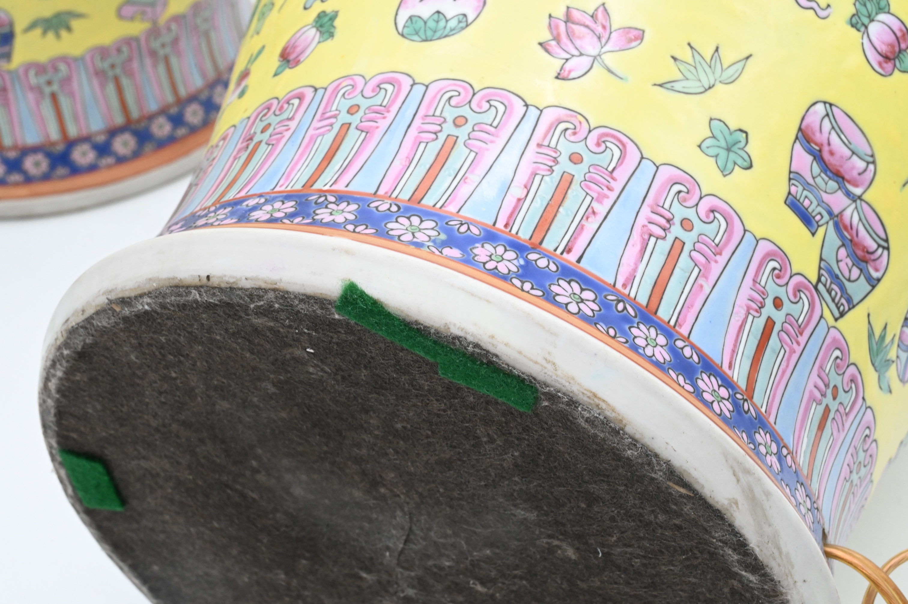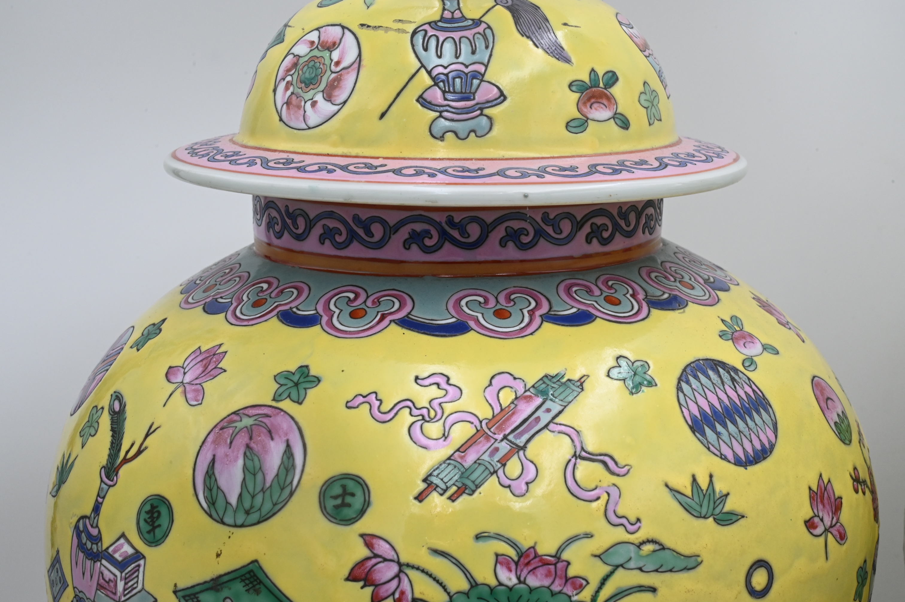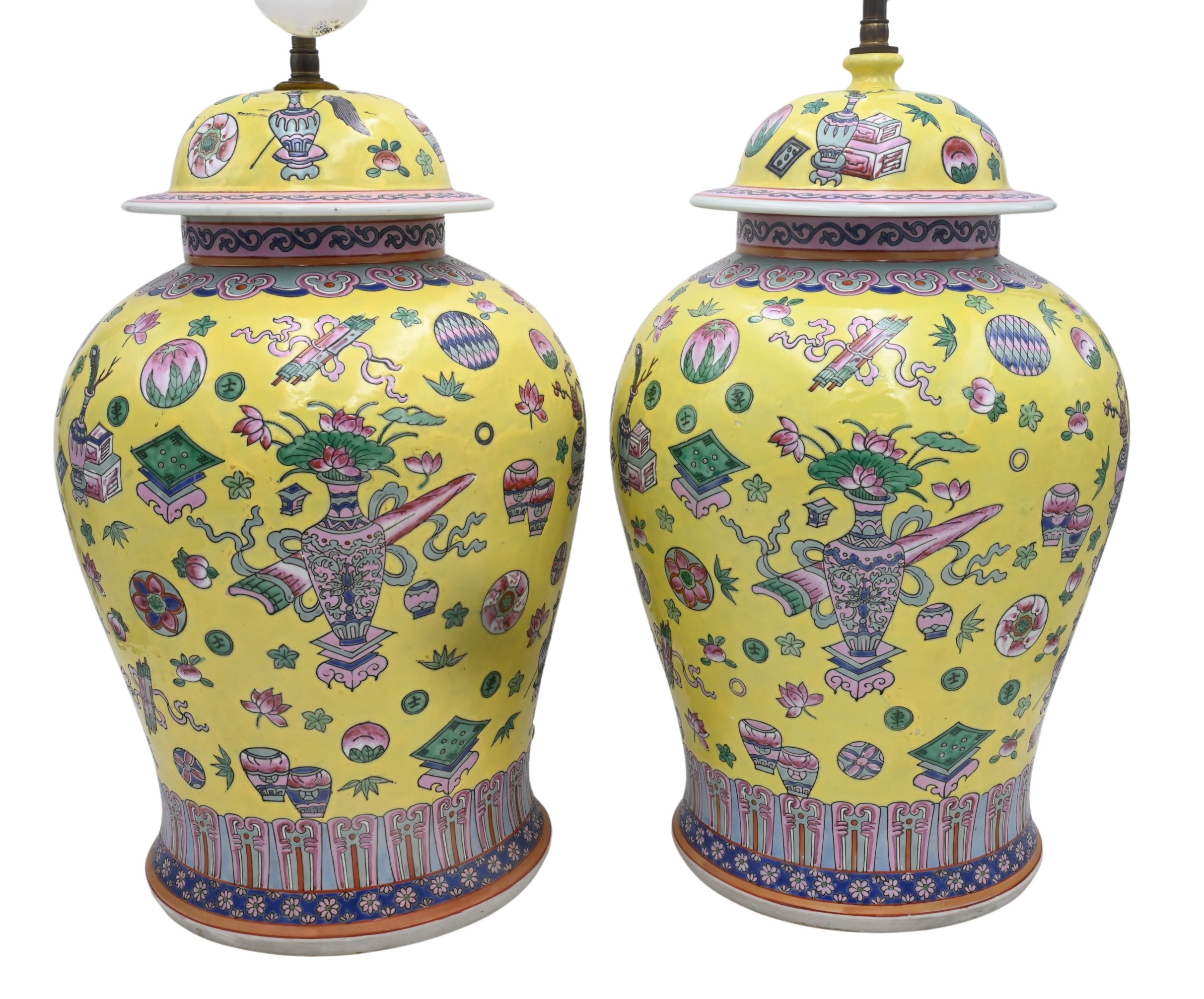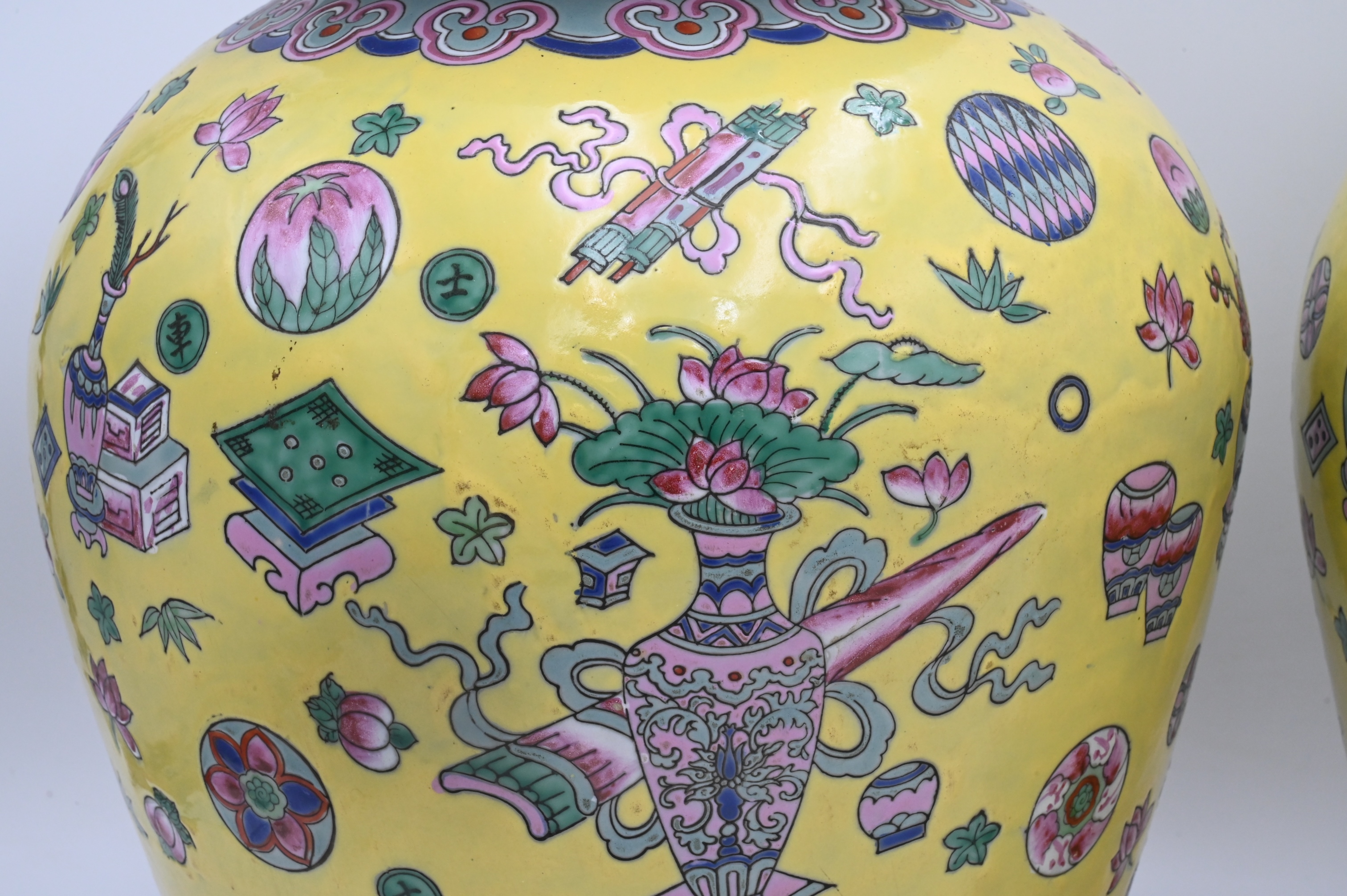 Pair of Chinese Baluster Jars with covers having yellow ground decorated with antiques fruit & flowers