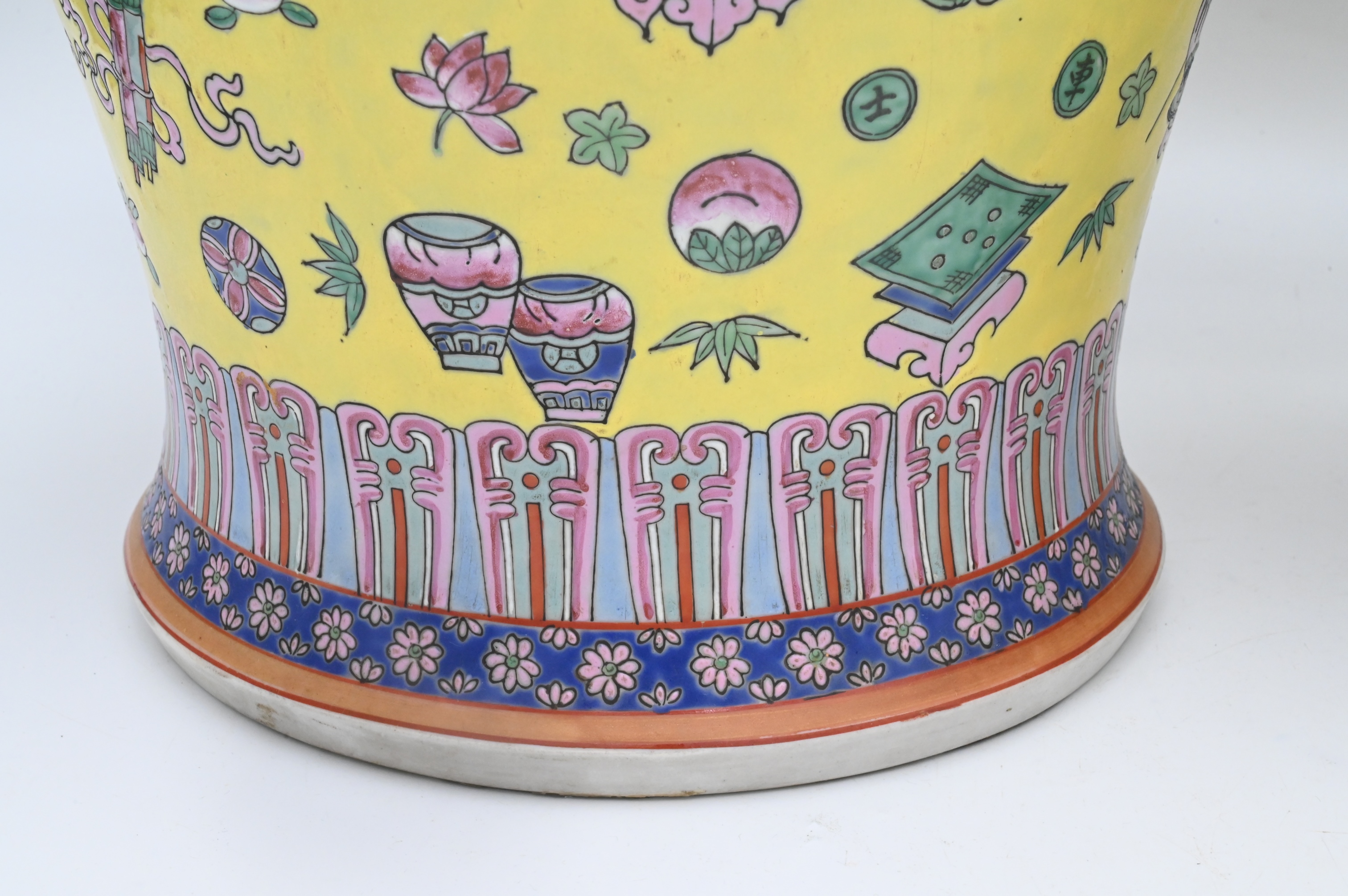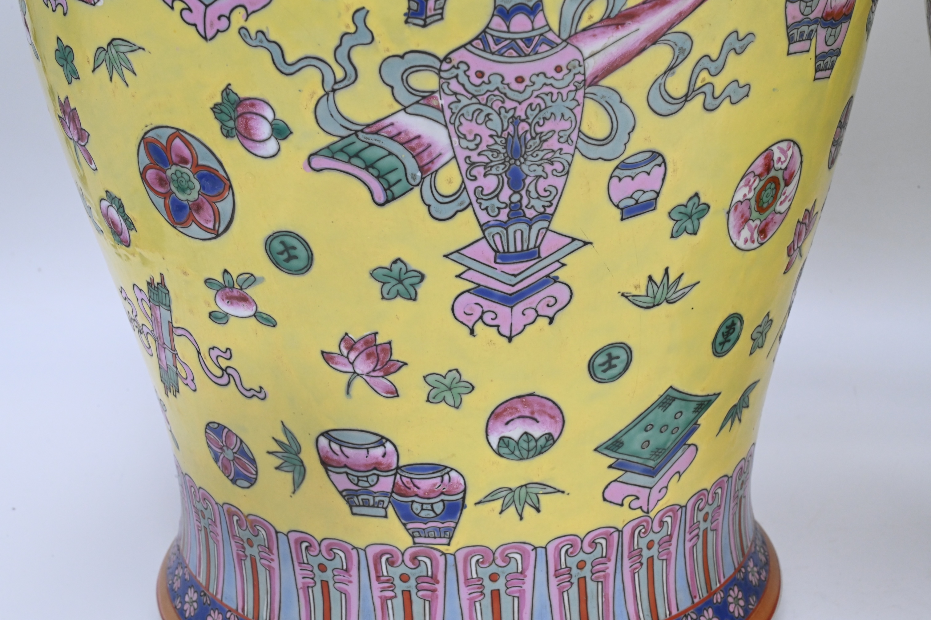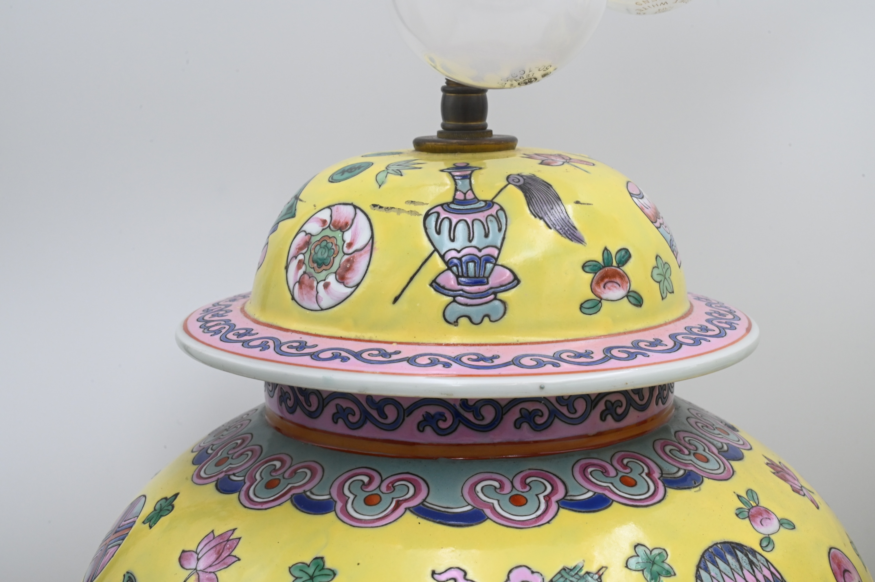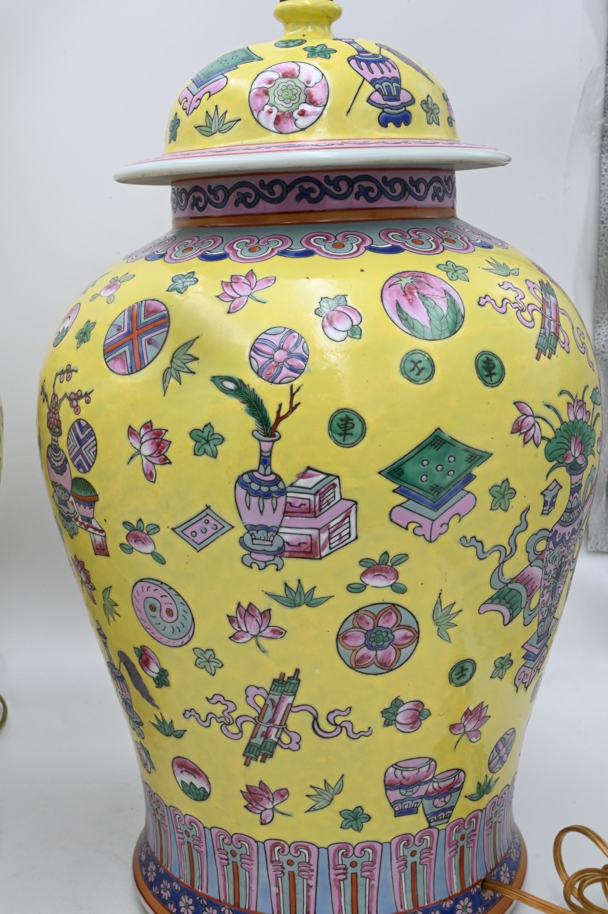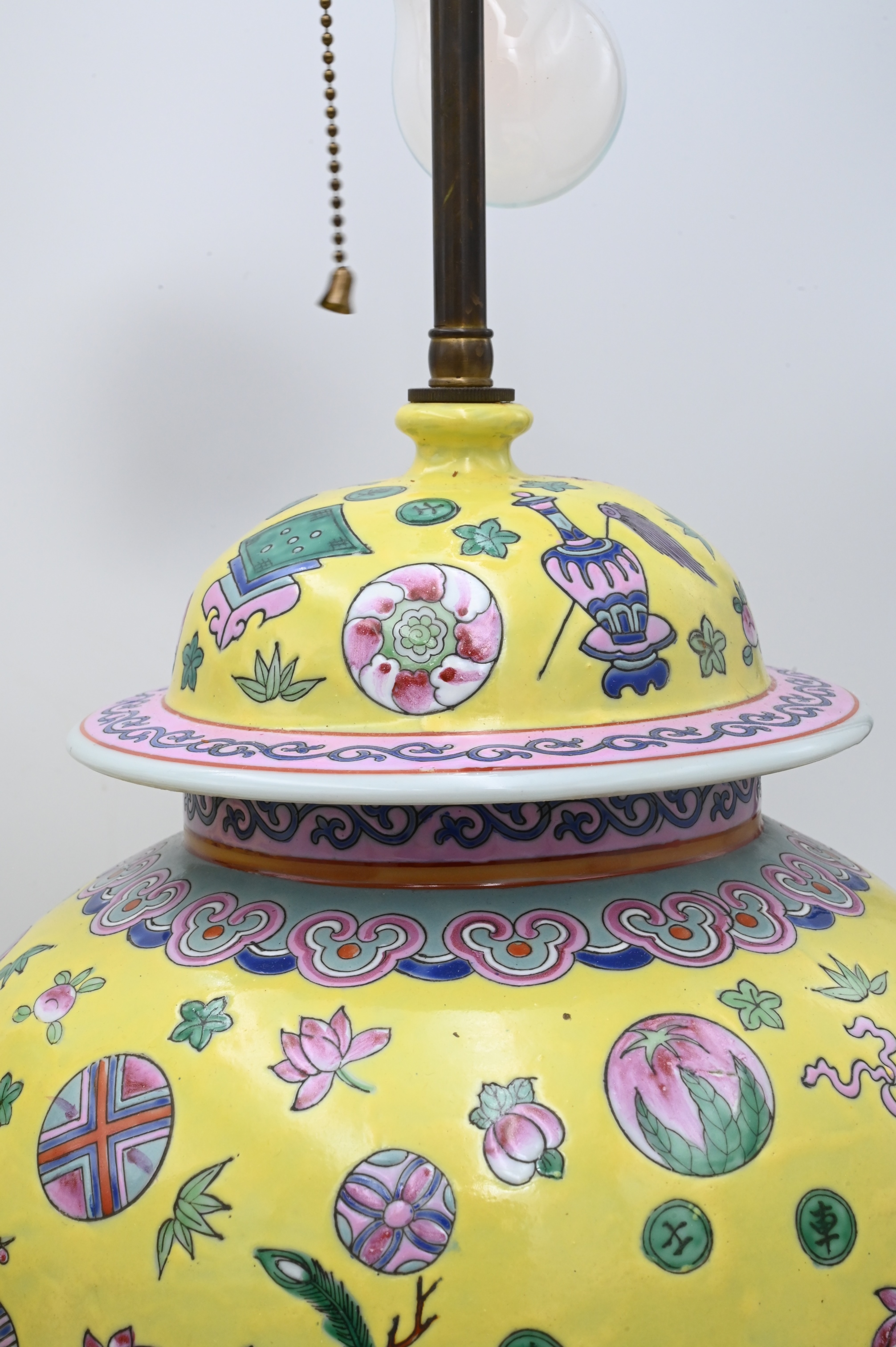 Pair of Chinese Baluster Jars with covers having yellow ground decorated with antiques fruit & flowers