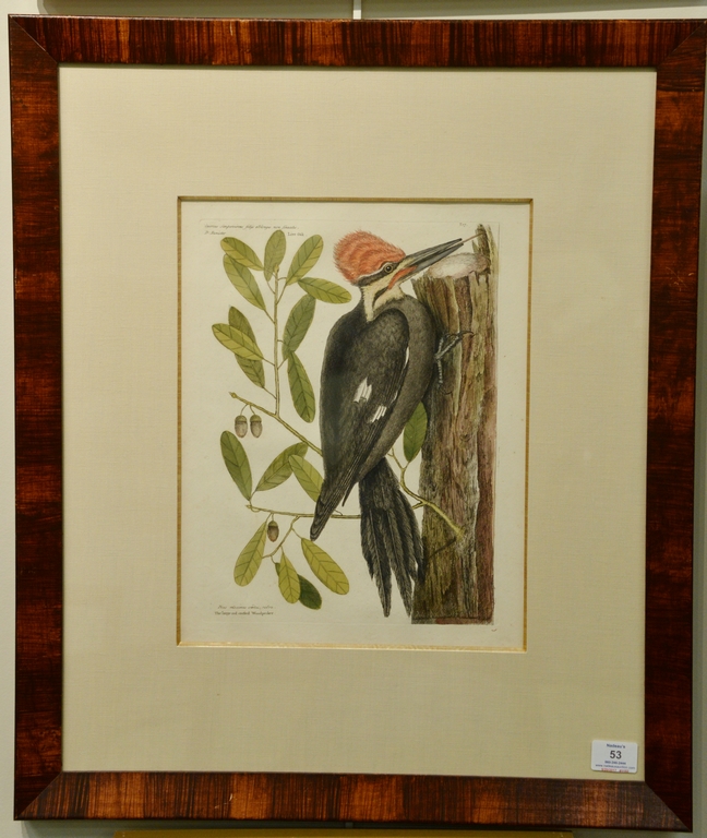 Lot 53: Pair of Mark Catesby hand colored engravings The Large Red Crested Woodpecker T17 Live Oak and The Red Headed Woodpecker Water O…