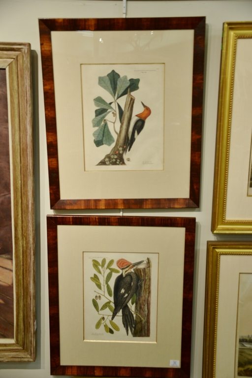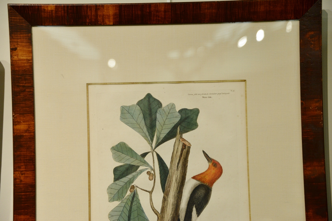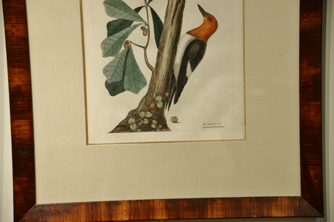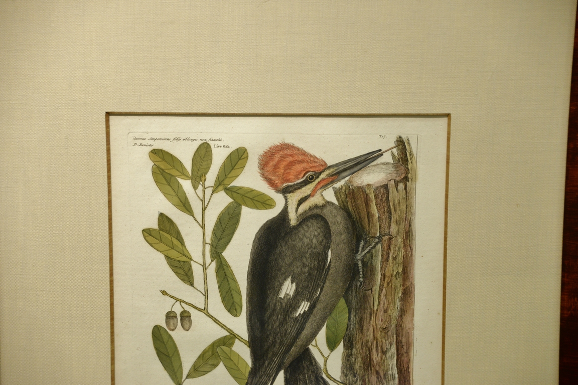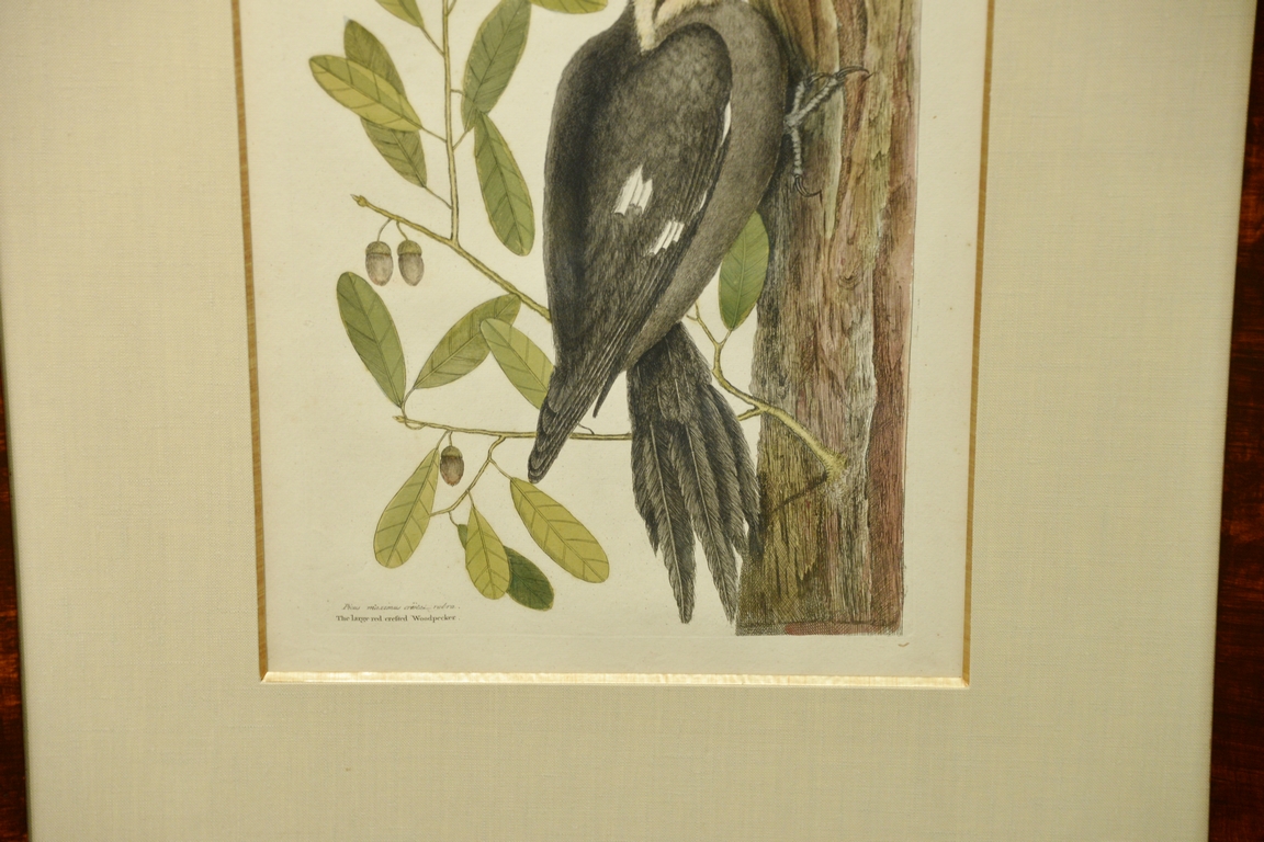 Pair of Mark Catesby hand colored engravings The Large Red Crested Woodpecker T17 Live Oak and The Red Headed Woodpecker Water Oak T20. plate size each: 13 3/4 x 10 1/4, sight size each 15 1/4 x 11 3/4 Provenance: Property from Credit Suisse’s Americana Collection