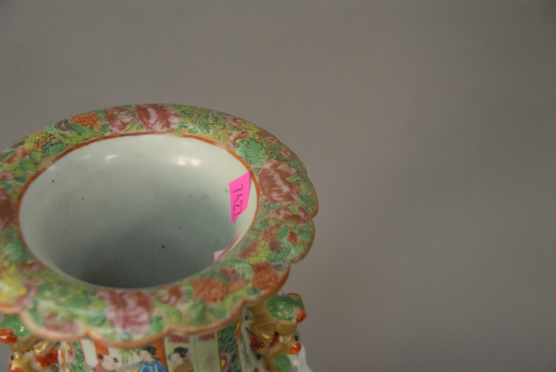 Rose Famille porcelain vase with flared rim having molded foo dogs and dragons. ht. 16 1/2 in.