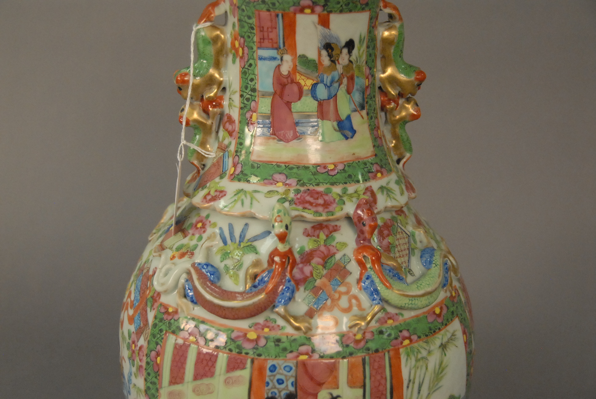 Lot 53: Rose Famille porcelain vase with flared rim having molded foo dogs and dragons. ht. 16 1/2 in.