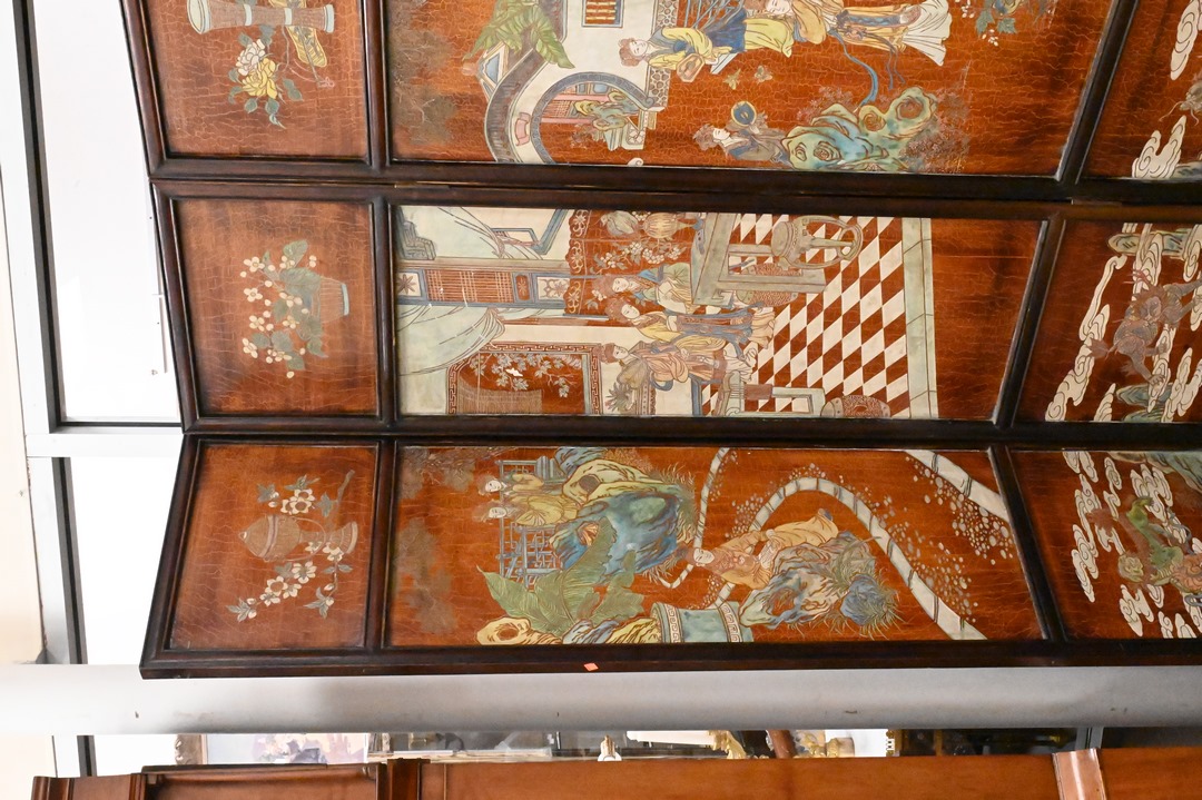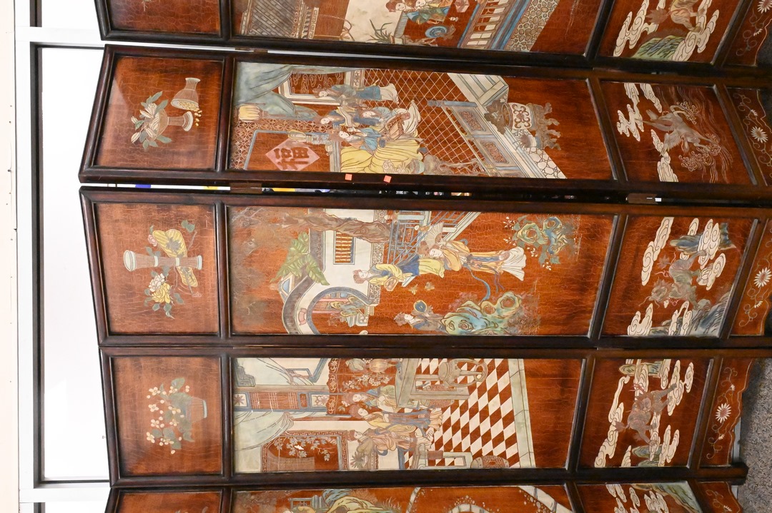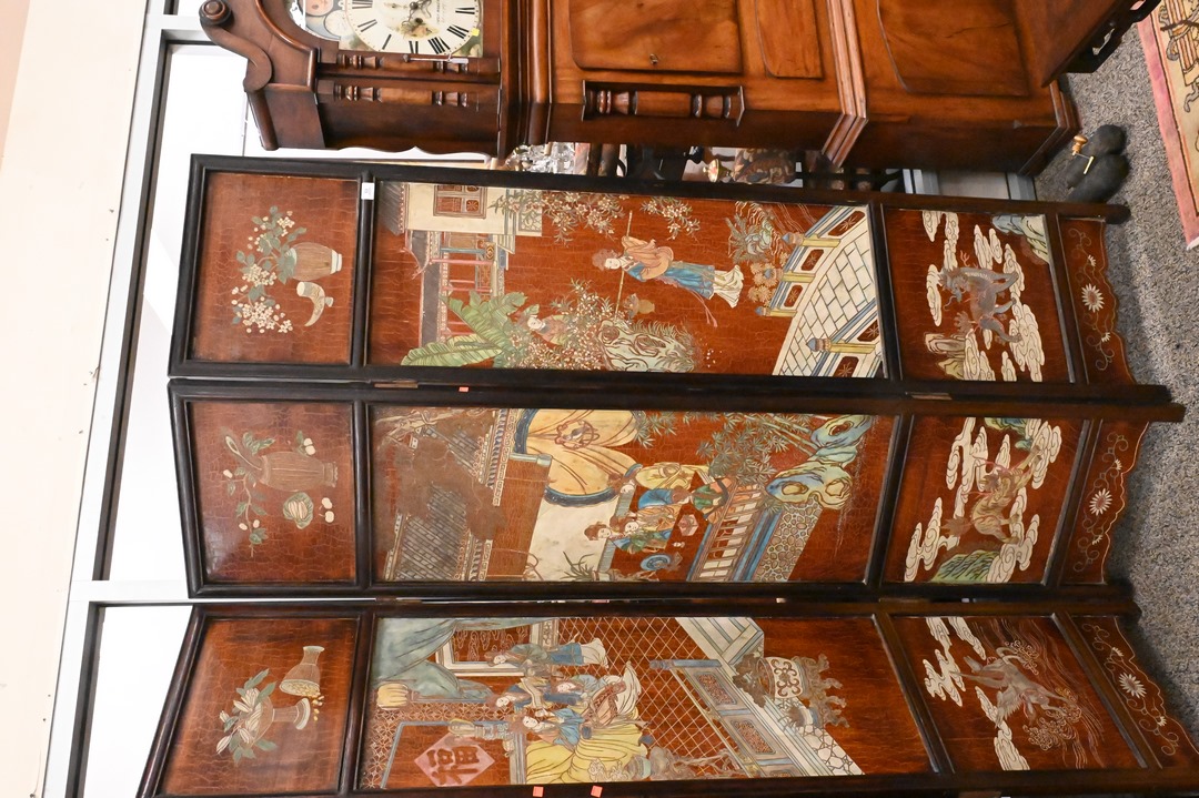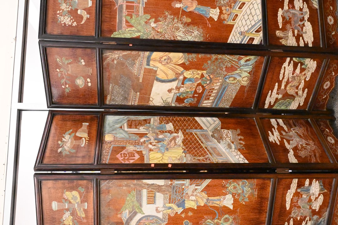 Six Panel Chinese Double Sided Screen, probably 19th century or earlier, height 84 1/2 inches, length 116 inches. Provenance: Estate of Peter Tillou, Litchfield, Connecticut.