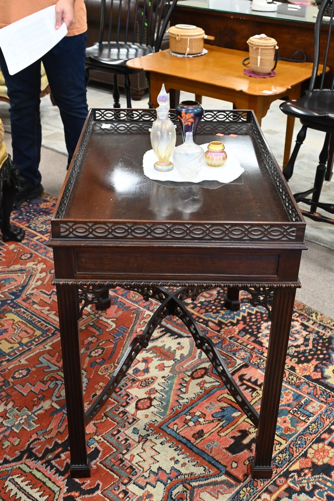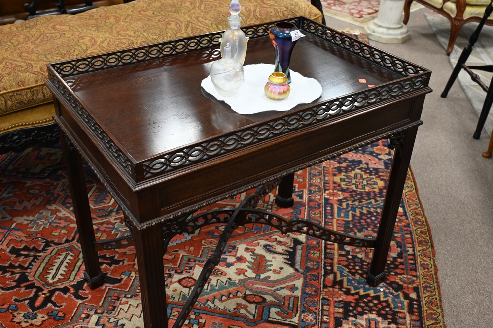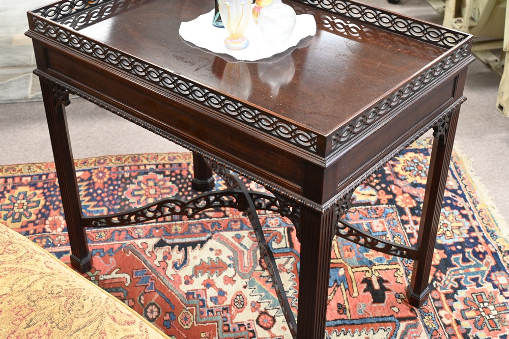Lot 53: Stickley Mahogany Center Table, having pierced gallery top, on fluted legs, arched pierced stretcher, height 30 inches, top 21 x 32 1/2 inches.