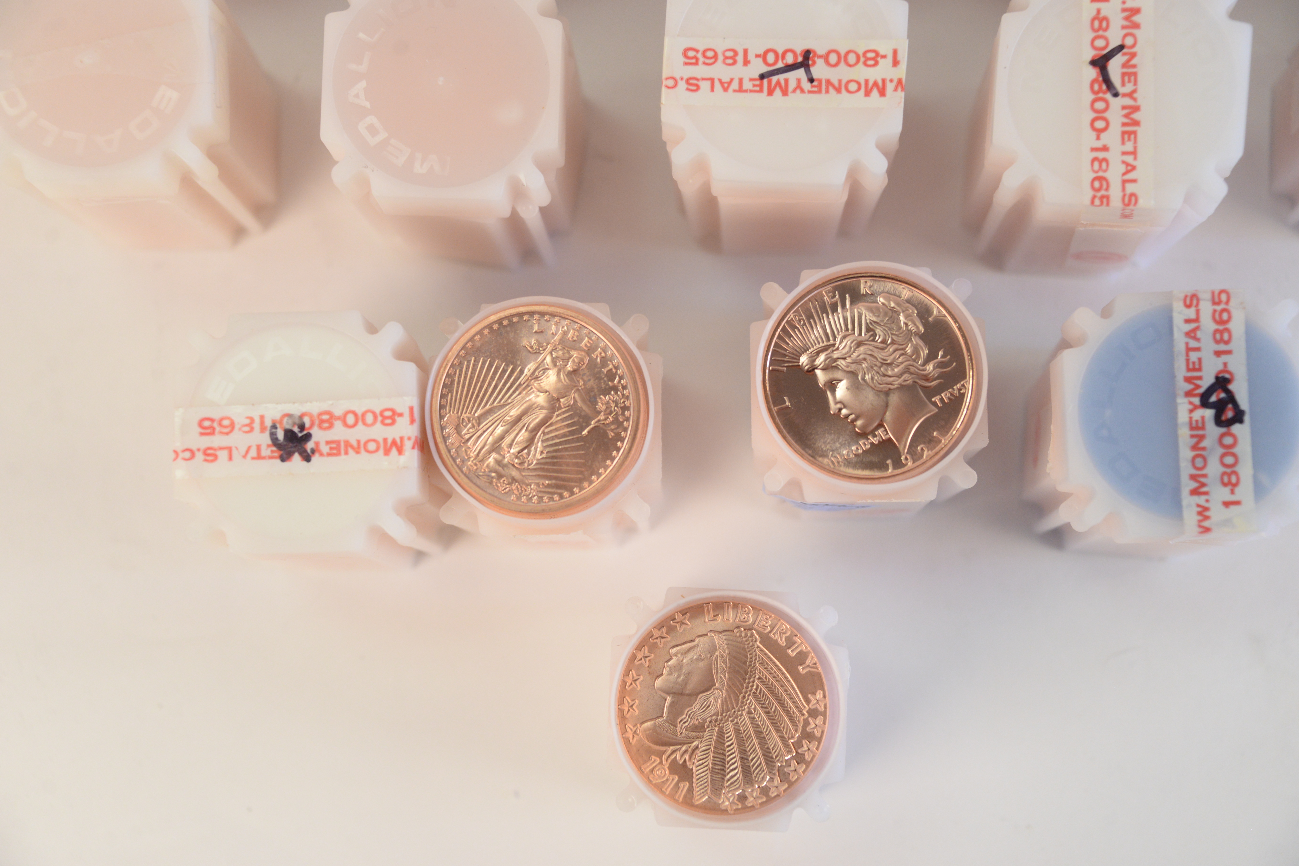 Thirty-seven Rolls of One Ounce Copper, various patterns to include Indian head, 740 oz.