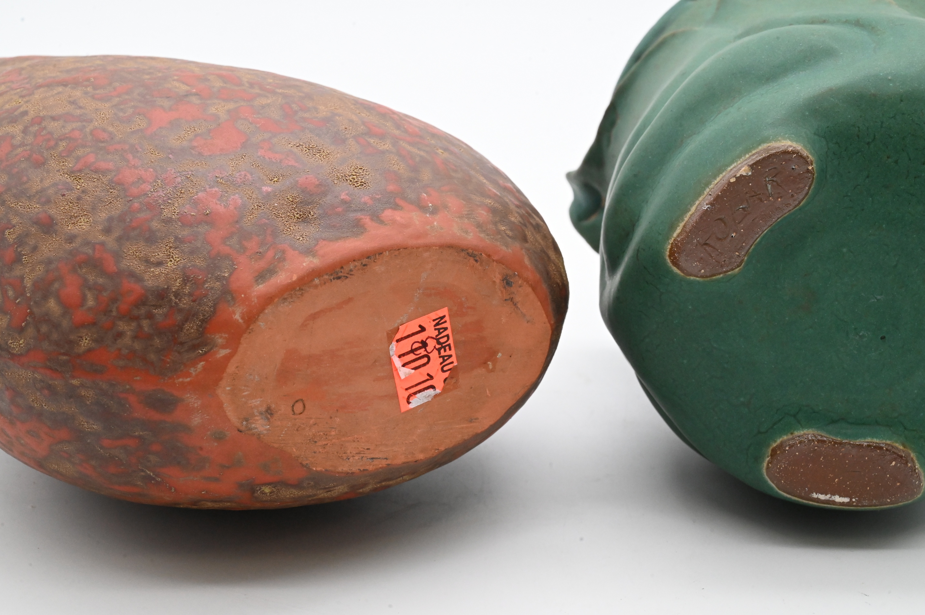 Dan Robar matte green leaf vase, ovoid egg shaped vase in brown and red glaze, along Tiffany Studios style favrile glass scarab paperweight, length 5 inches