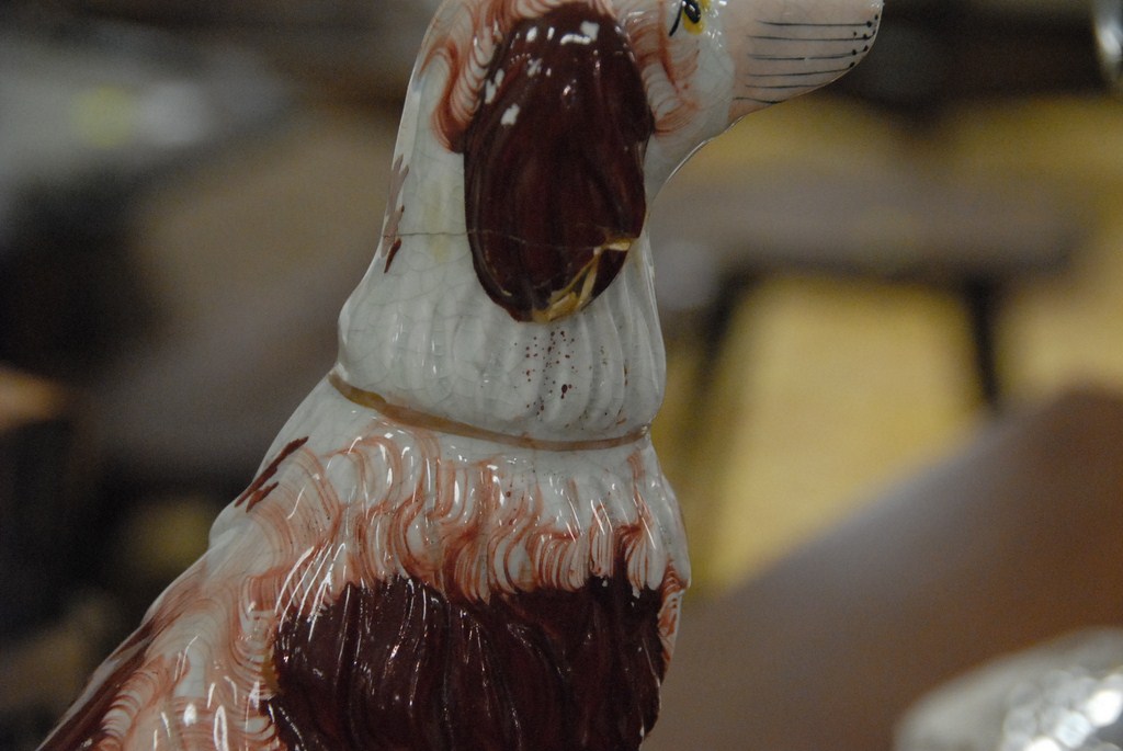 Lot 53: Three piece lot pair of Staffordshire dogs and figural pitcher two pieces as is, 11 1/2 X 8 1/2