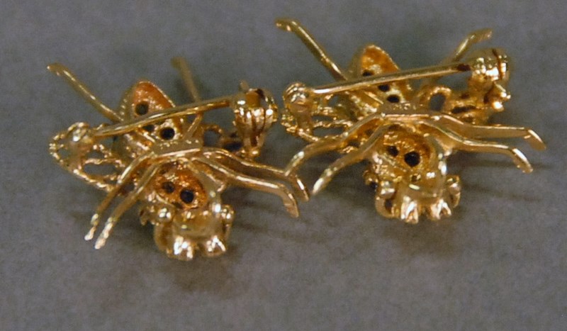 Lot 53: Two 14k gold bee pins, one set with sapphires, the other set with emeralds, one emerald missing. 4.8 grams, ht. 3/4in.