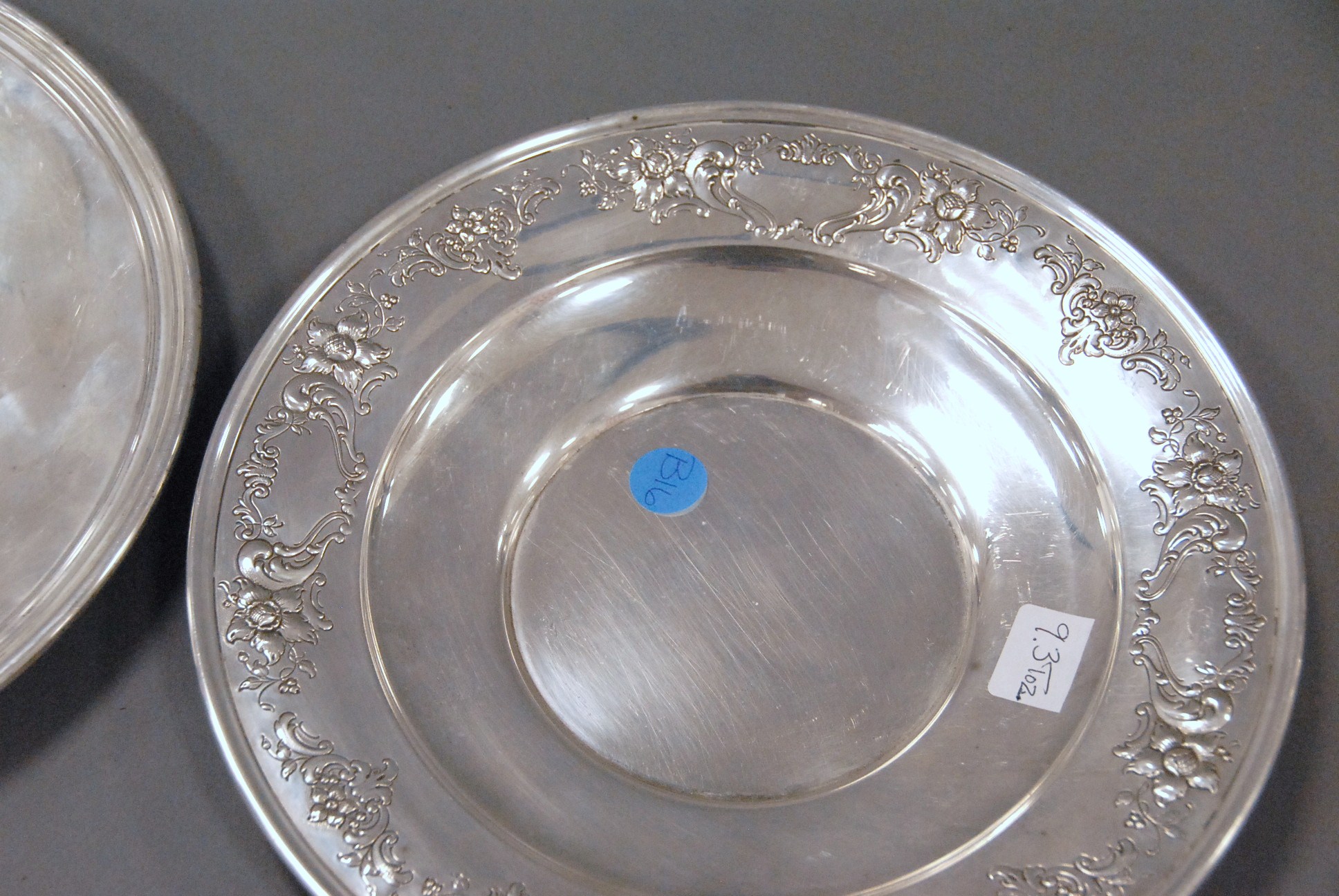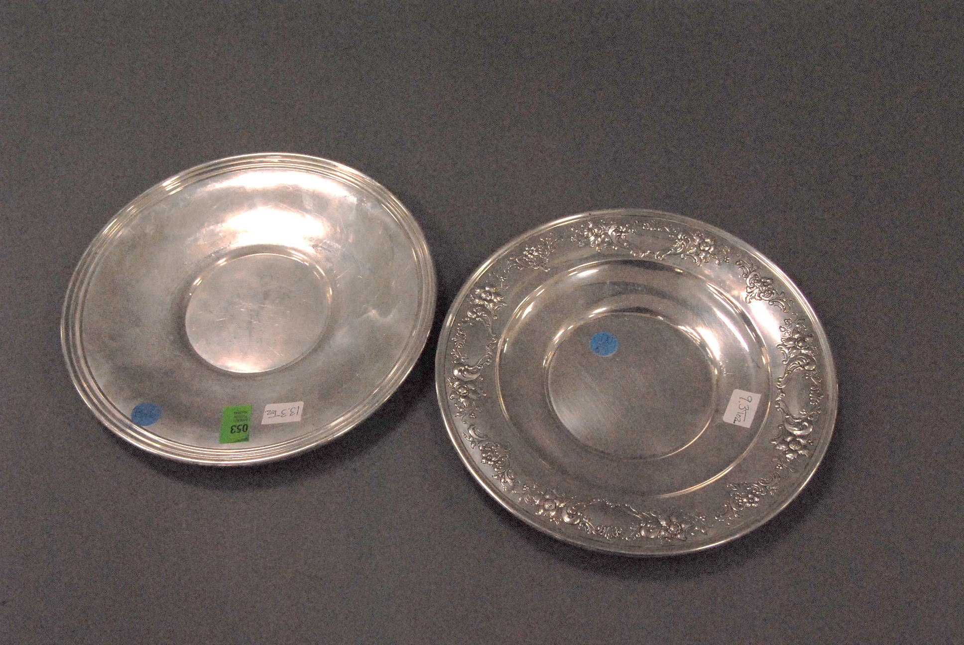 Two sterling silver round plates, 22.6 troy oz.