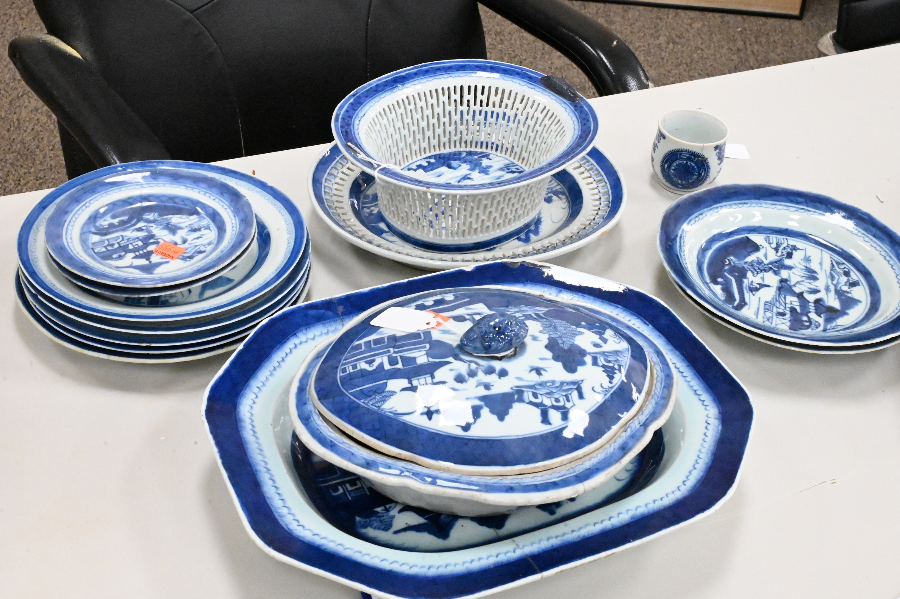 A large group of Chinese export Canton blue and white porcelain decorated with landscape and pavilion scenes. The lot includes two trays, a covered tureen, three covered dishes, a reticulated bowl with underplate, various bowls, and various plates.