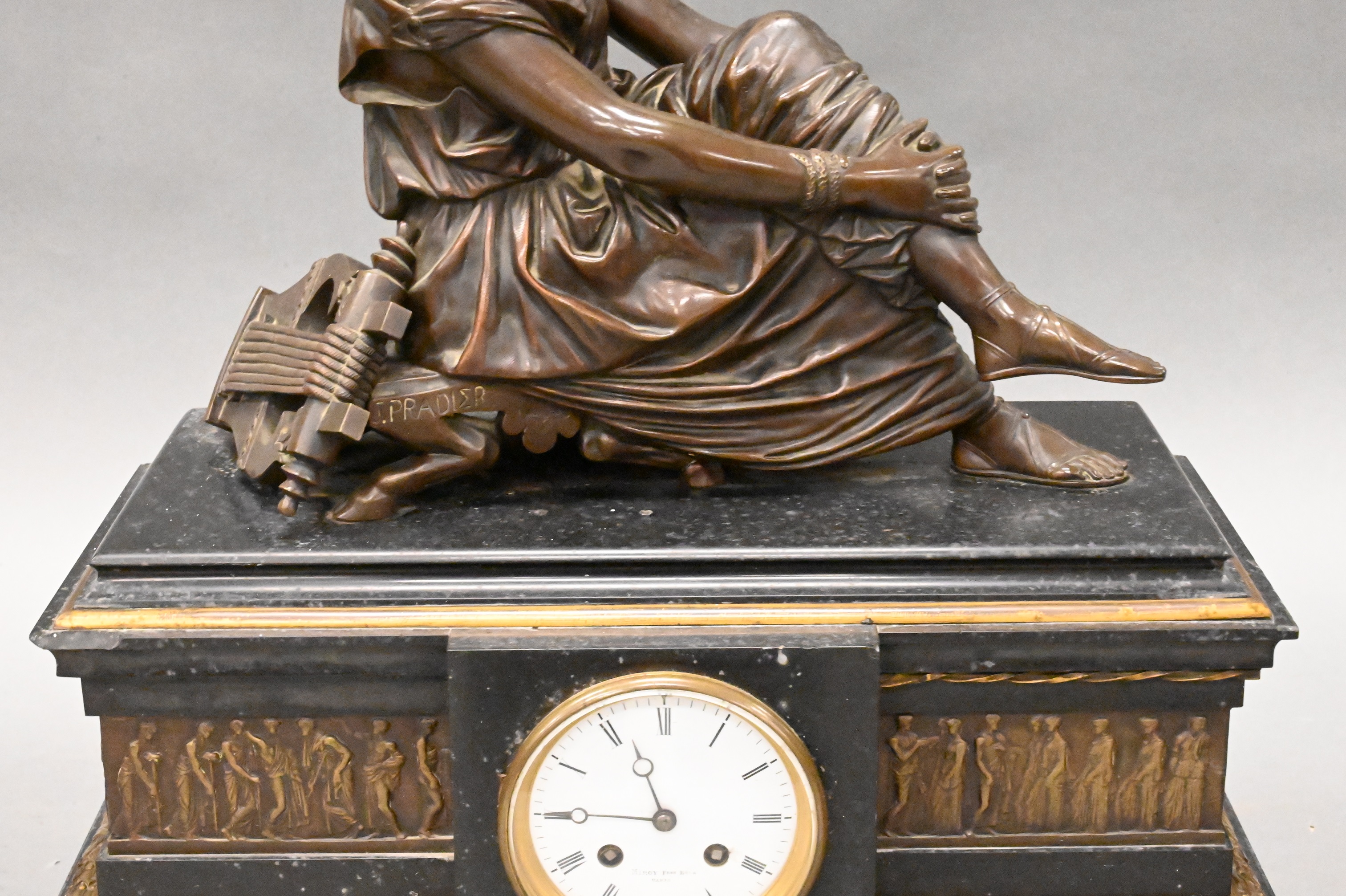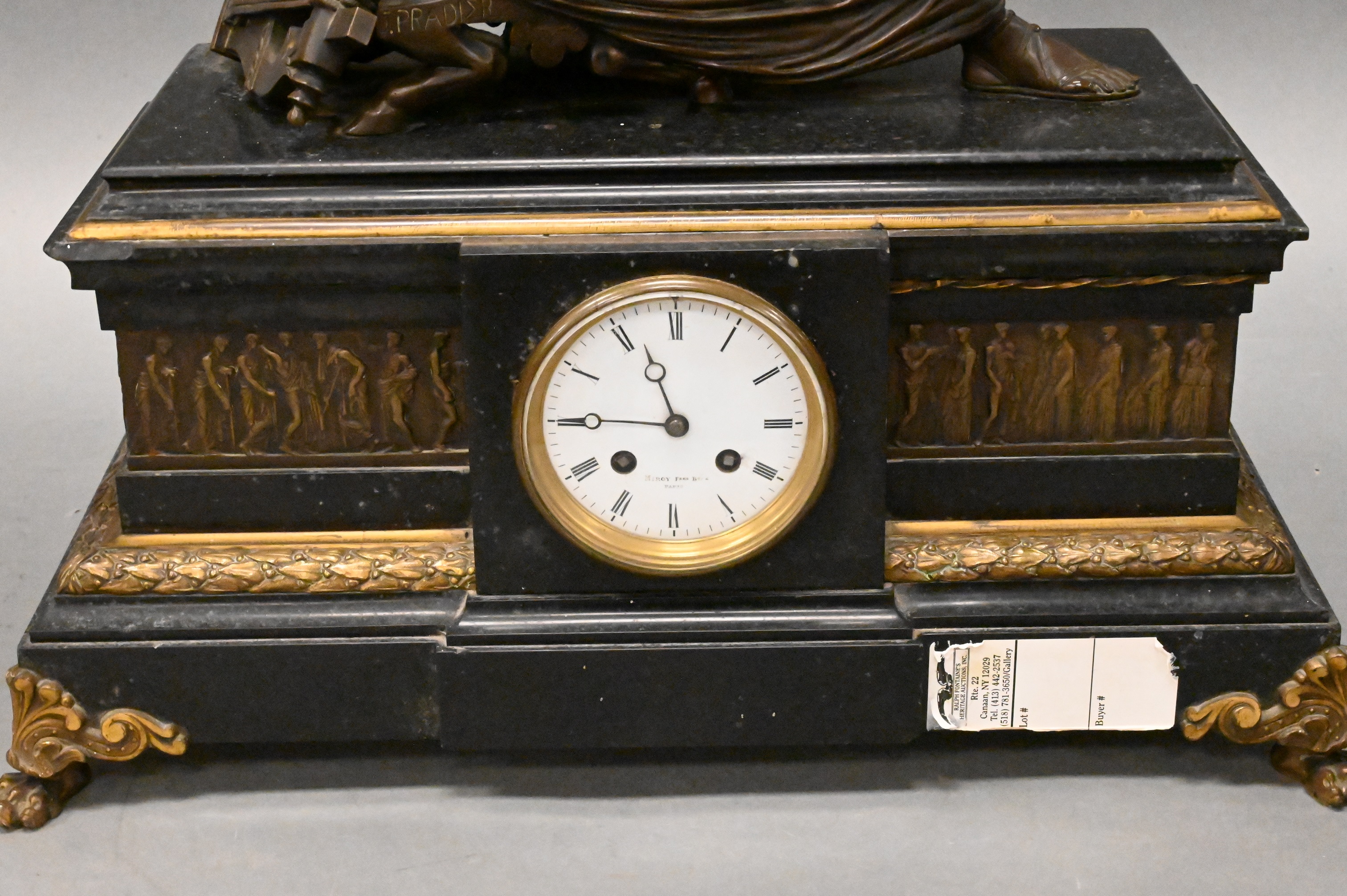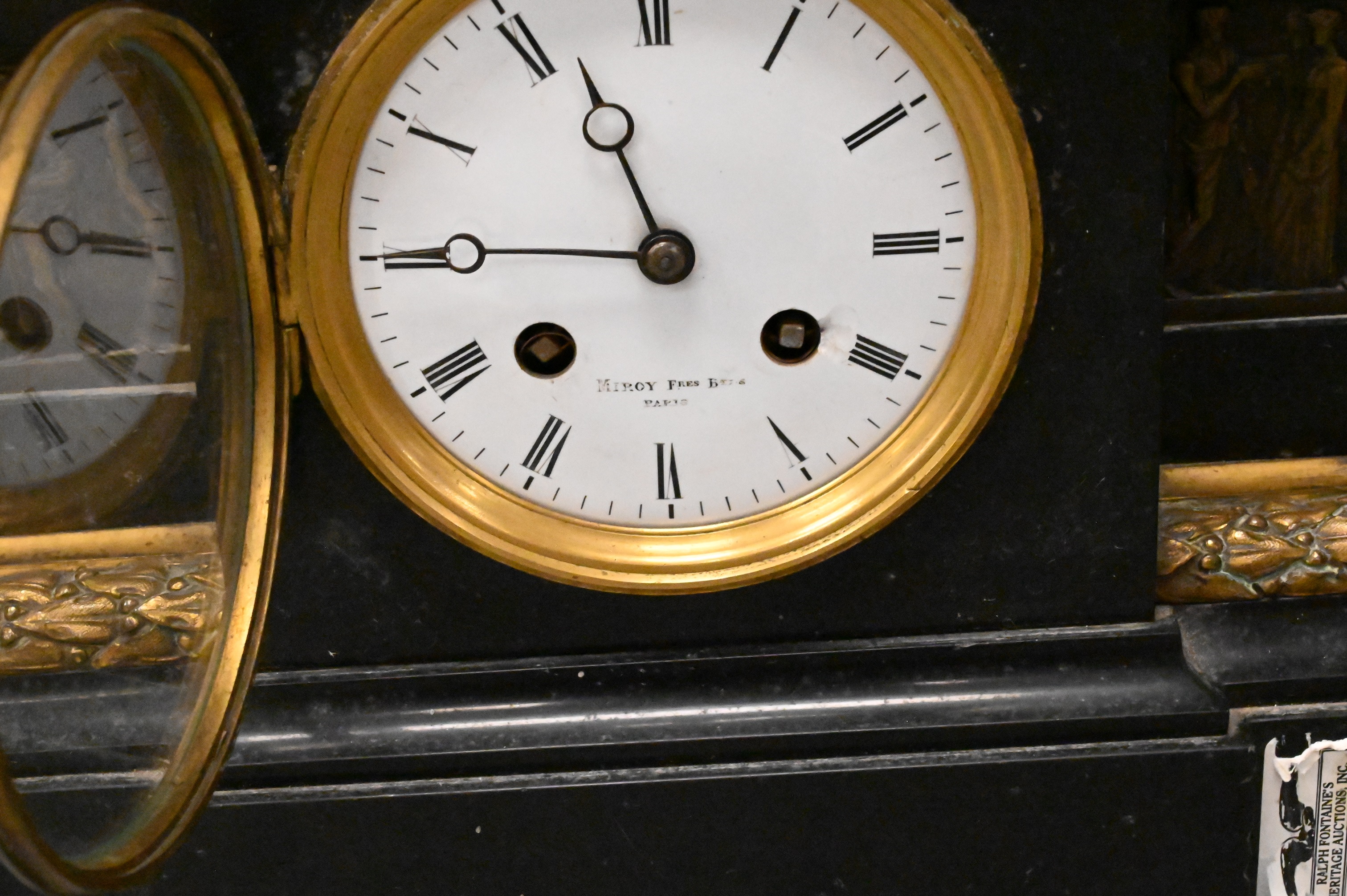 Having reclining woman on top of slate, signed J. Pradier and marked Susse Fres., base with Roman classical frieze, enameled dial marked Mercy Fres Bros. inc., Paris