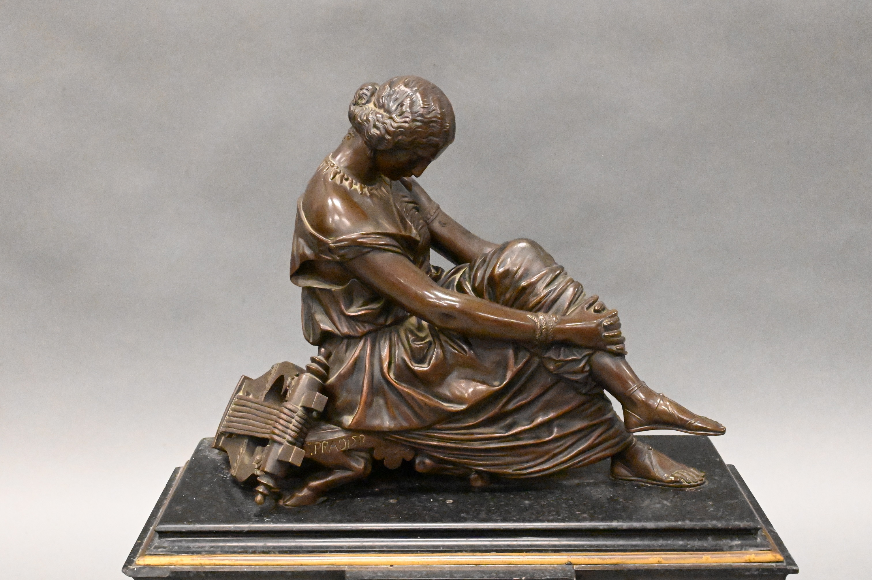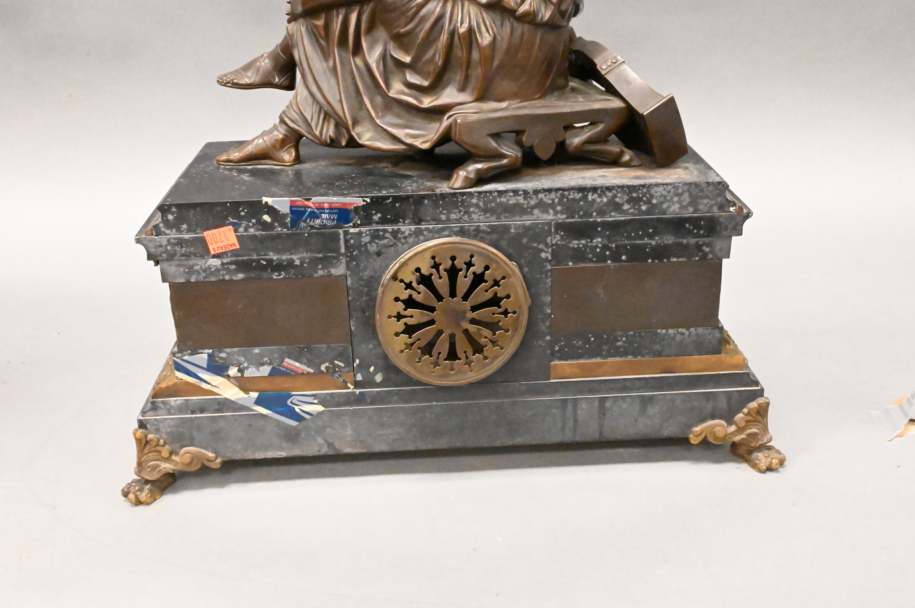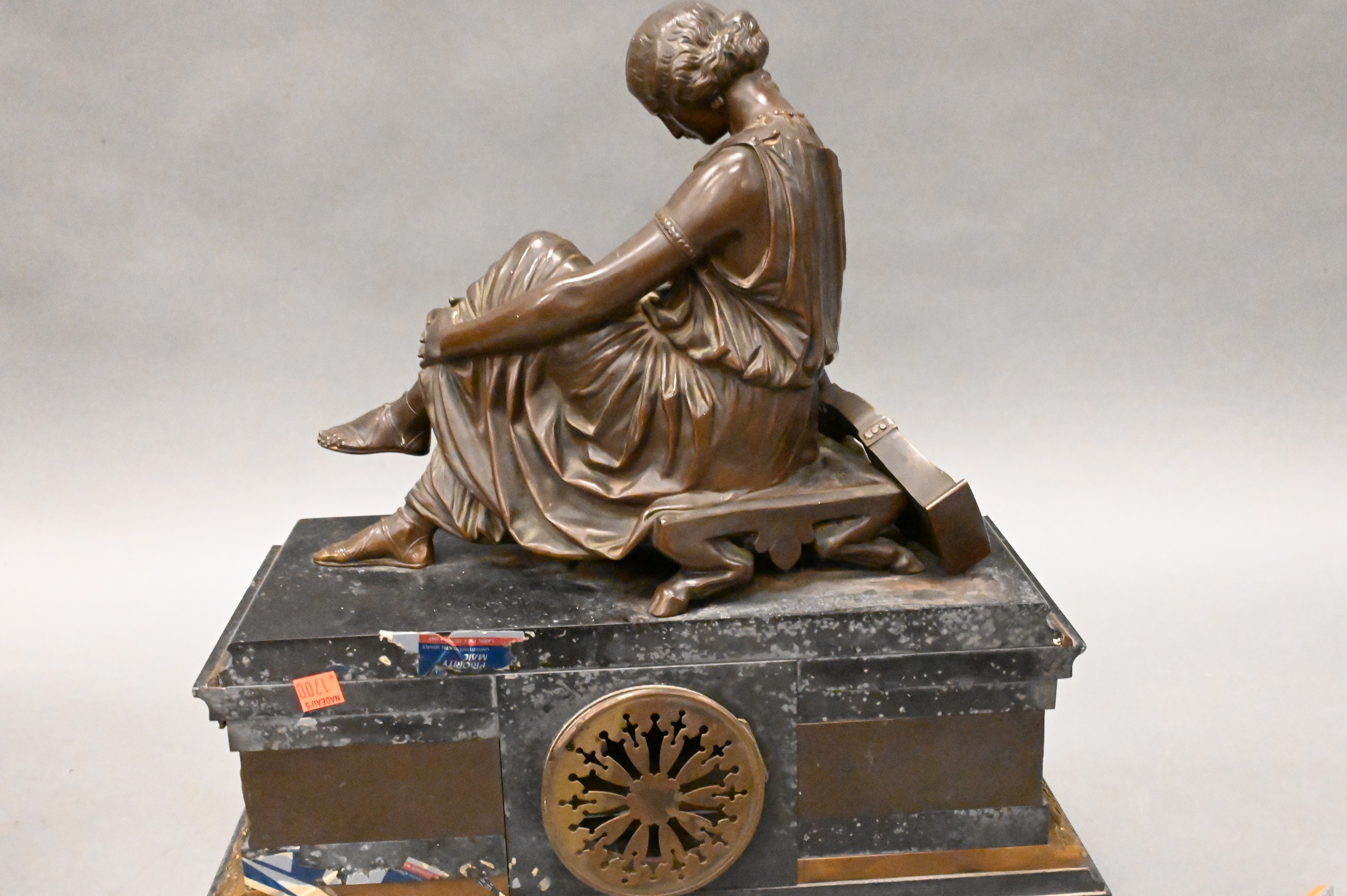 Having reclining woman on top of slate, signed J. Pradier and marked Susse Fres., base with Roman classical frieze, enameled dial marked Mercy Fres Bros. inc., Paris